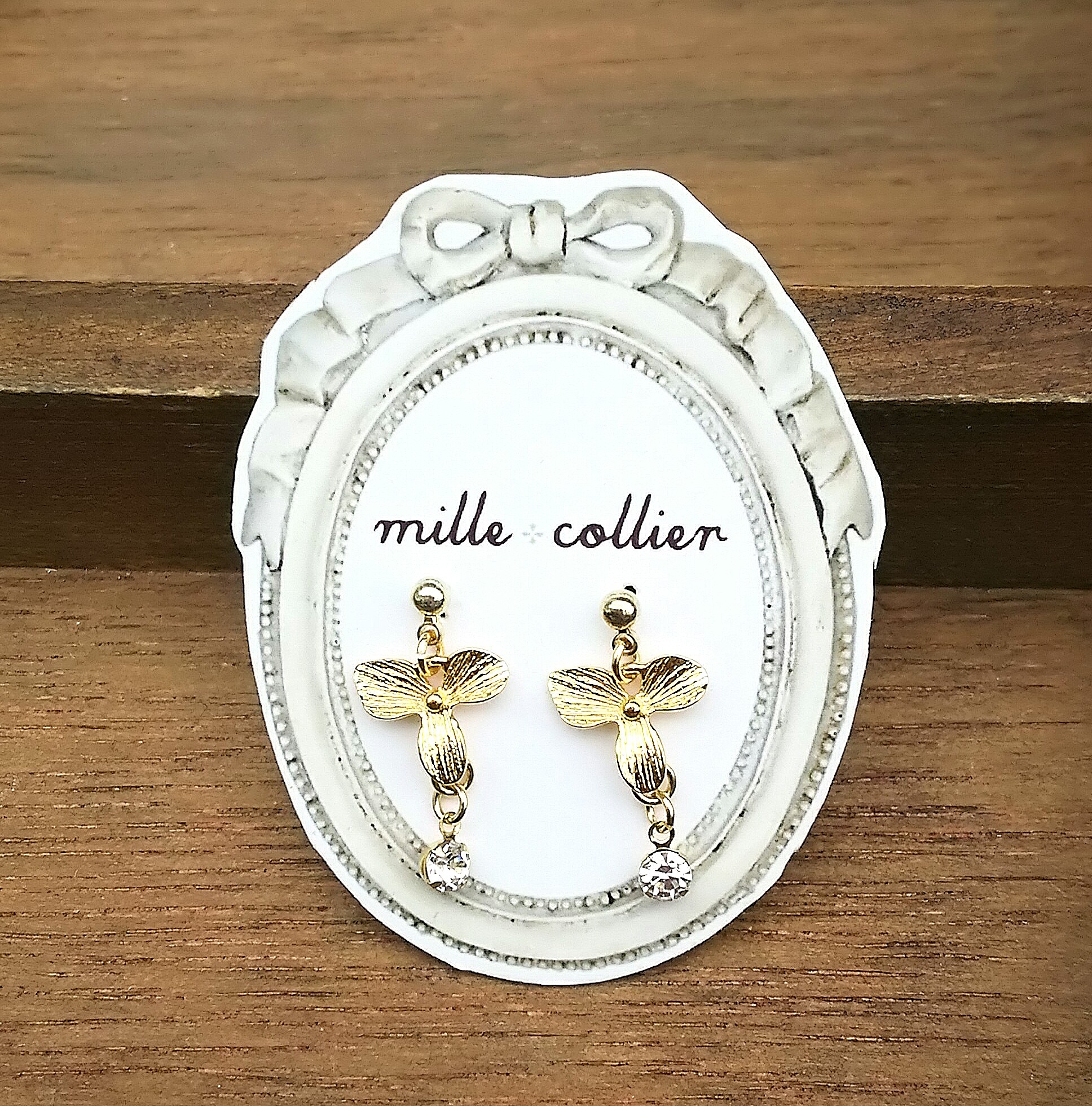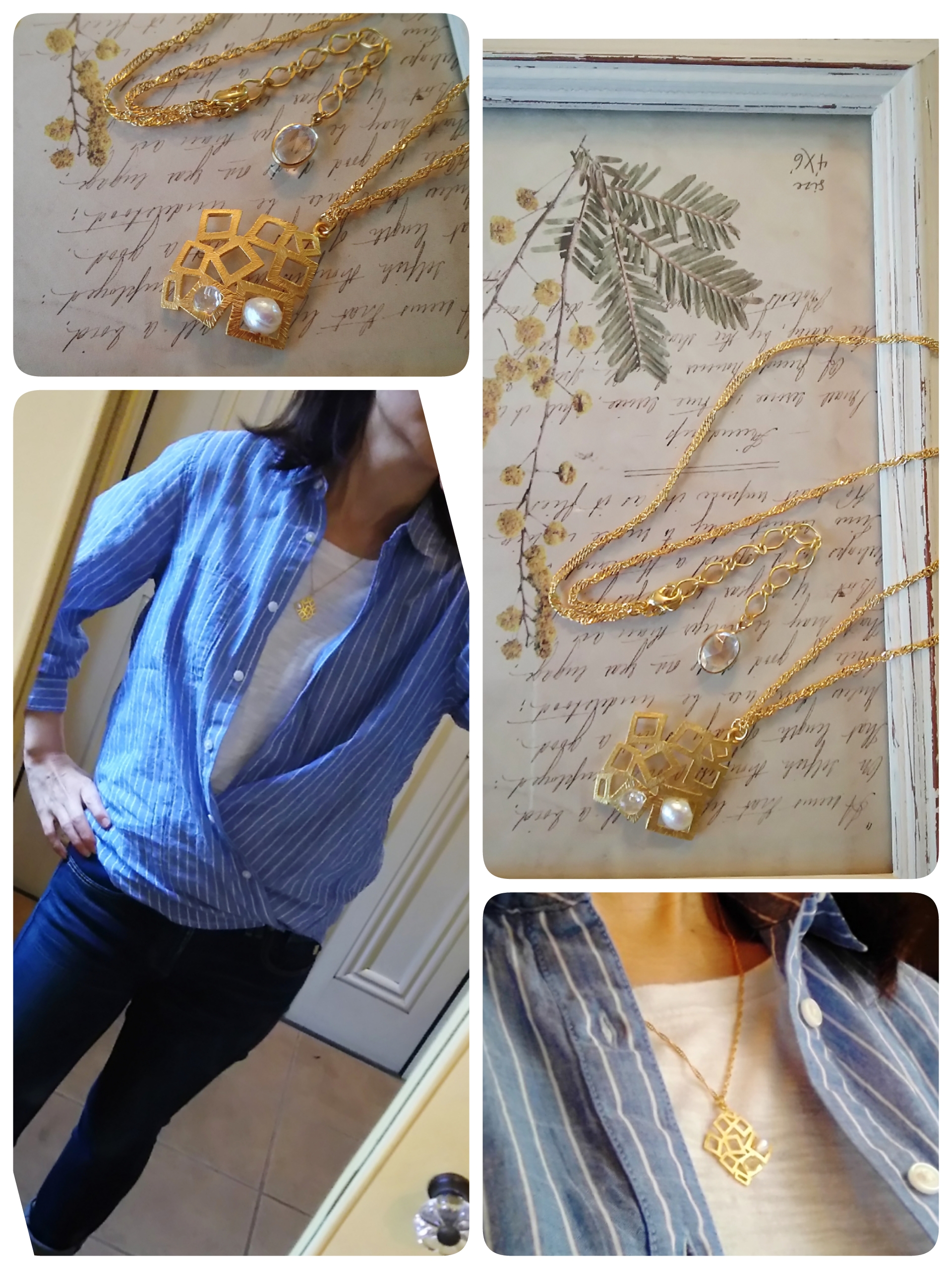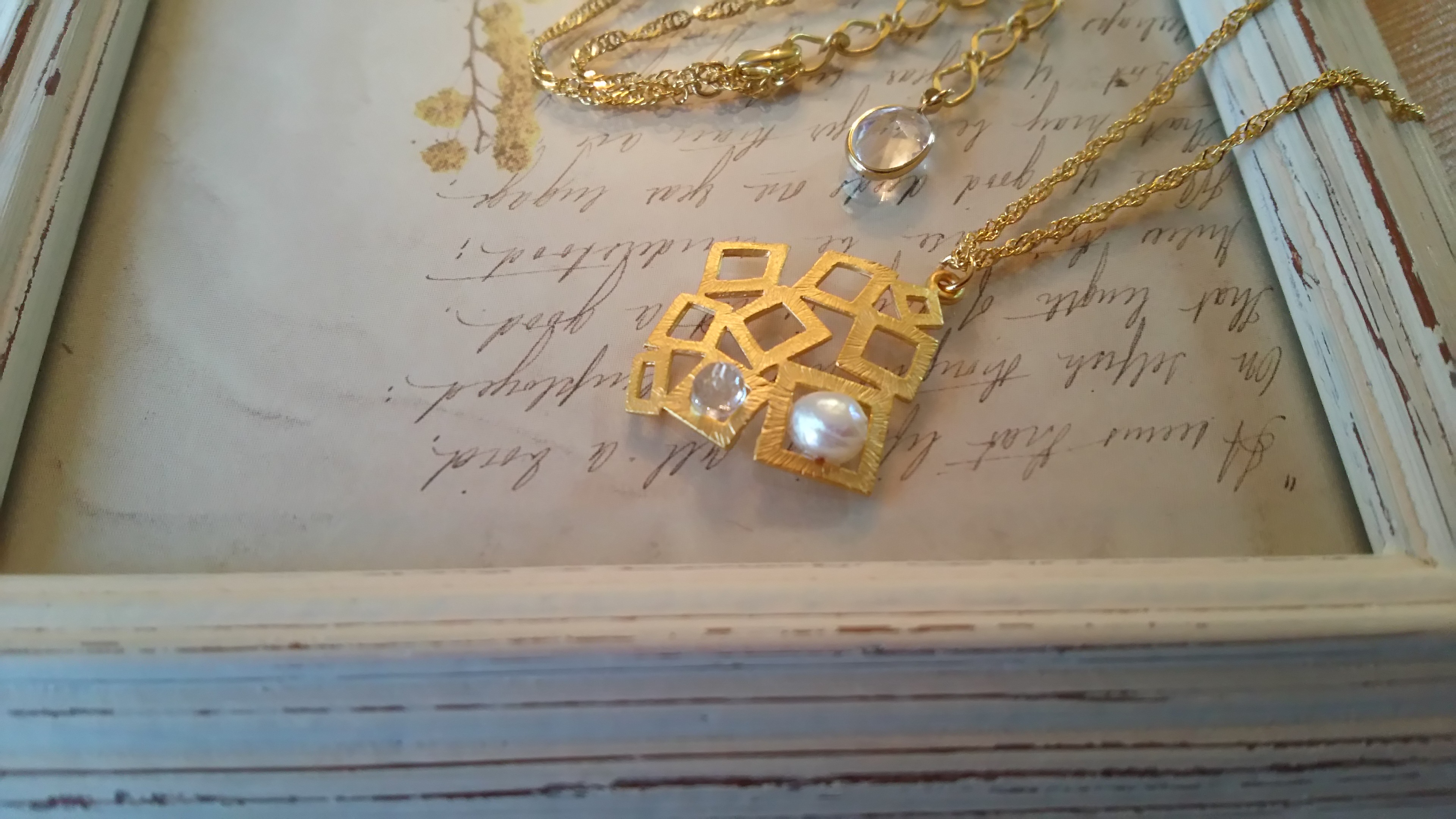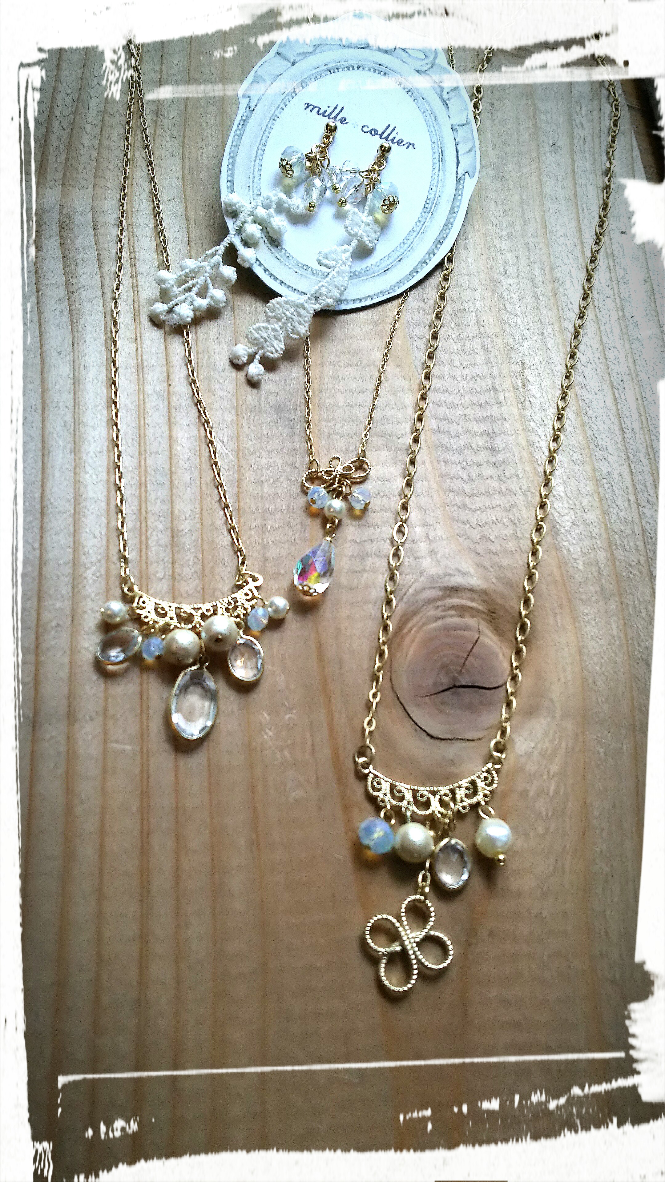 ゴールドとシルバーカラーのチェーンに、クリスタル・天然石・コットンパール・ガラスビーズを合わせた大人の女性のためのアクセサリーを作っています。白シャツや無地のニットに良く合います。