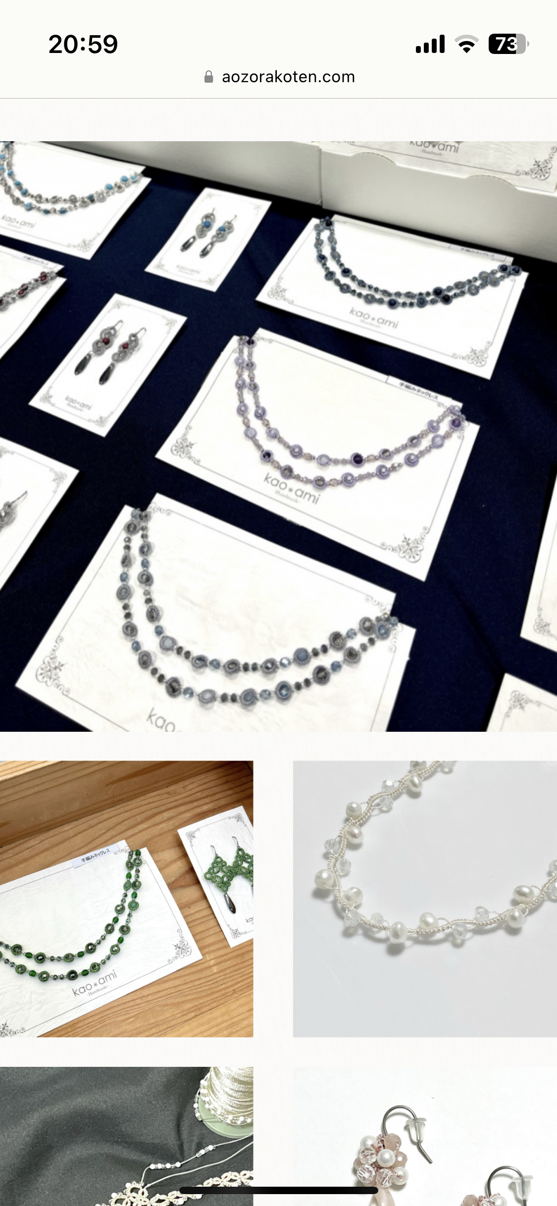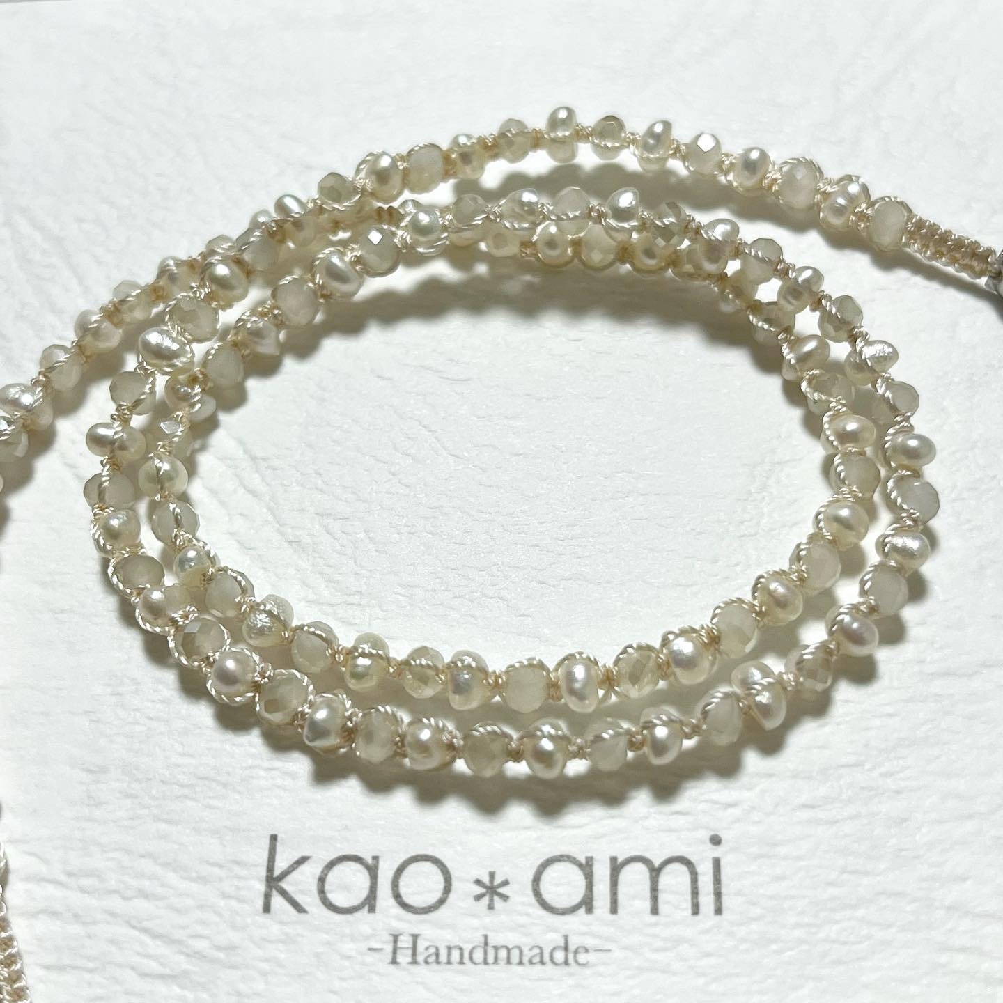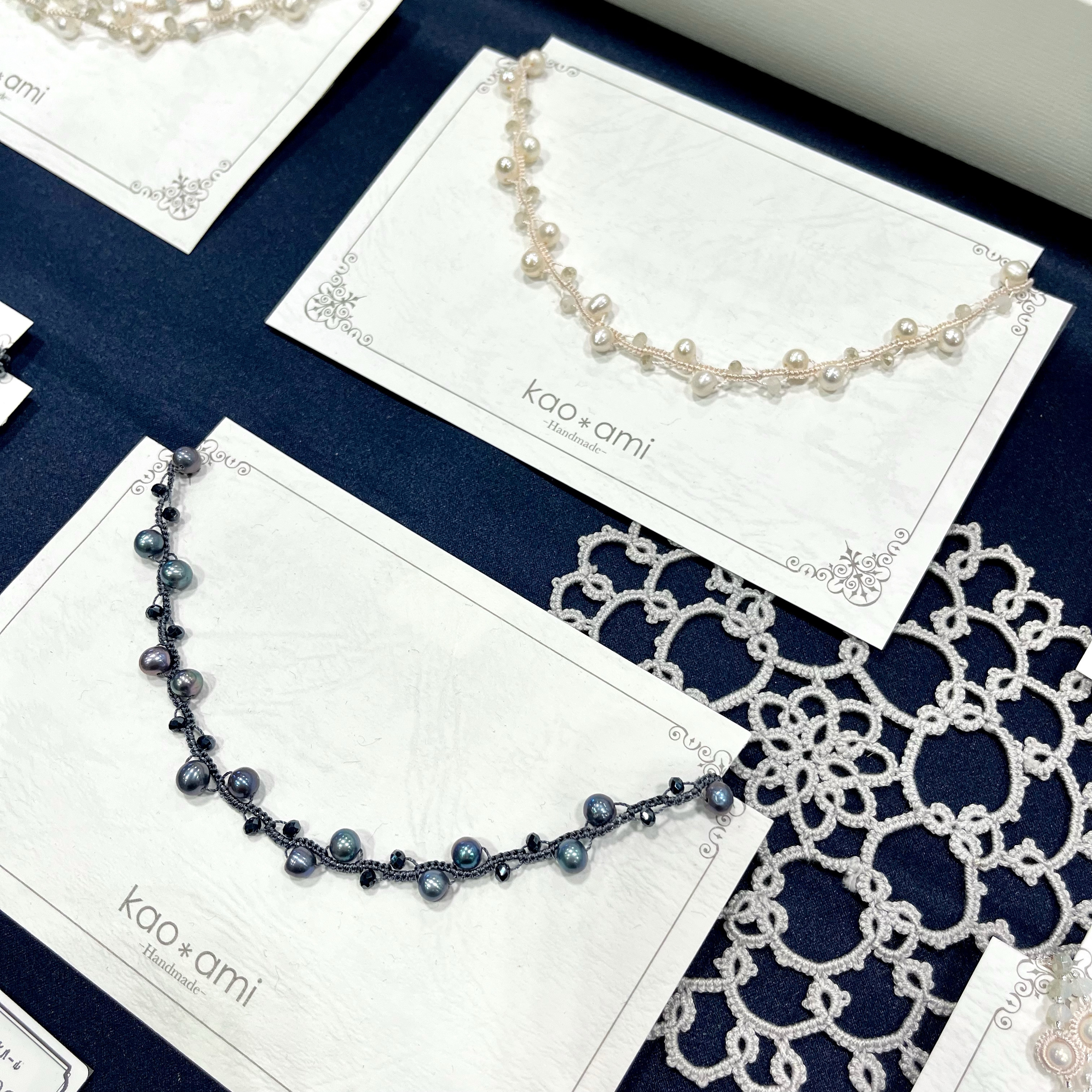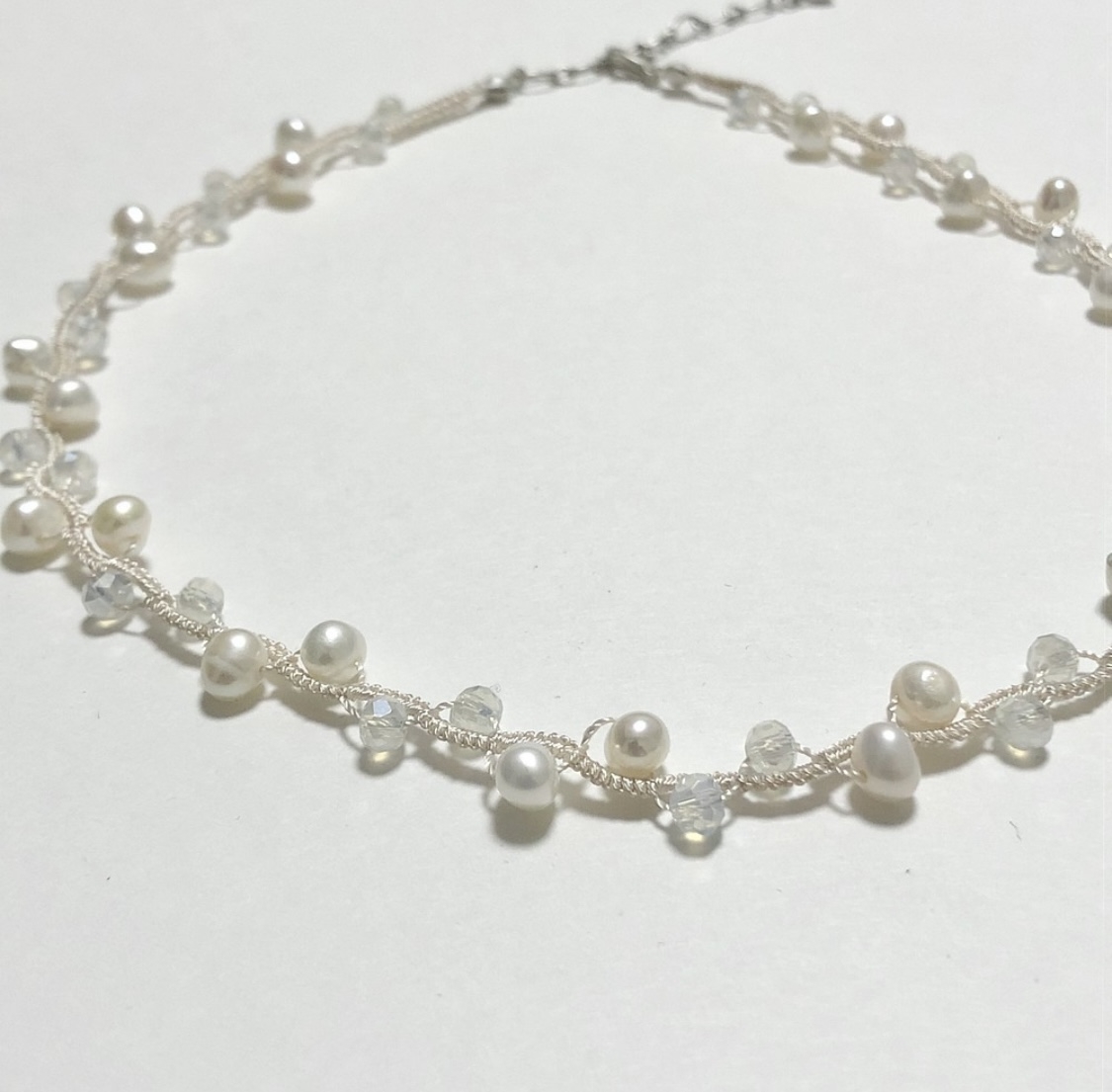 “肌に優しい手編みアクセサリー” 1本の糸でチェコビーズや天然石を編み込み、金属をほぼ使用しない軽くて肌に負担がかからないストレスフリーなアクセサリーです。