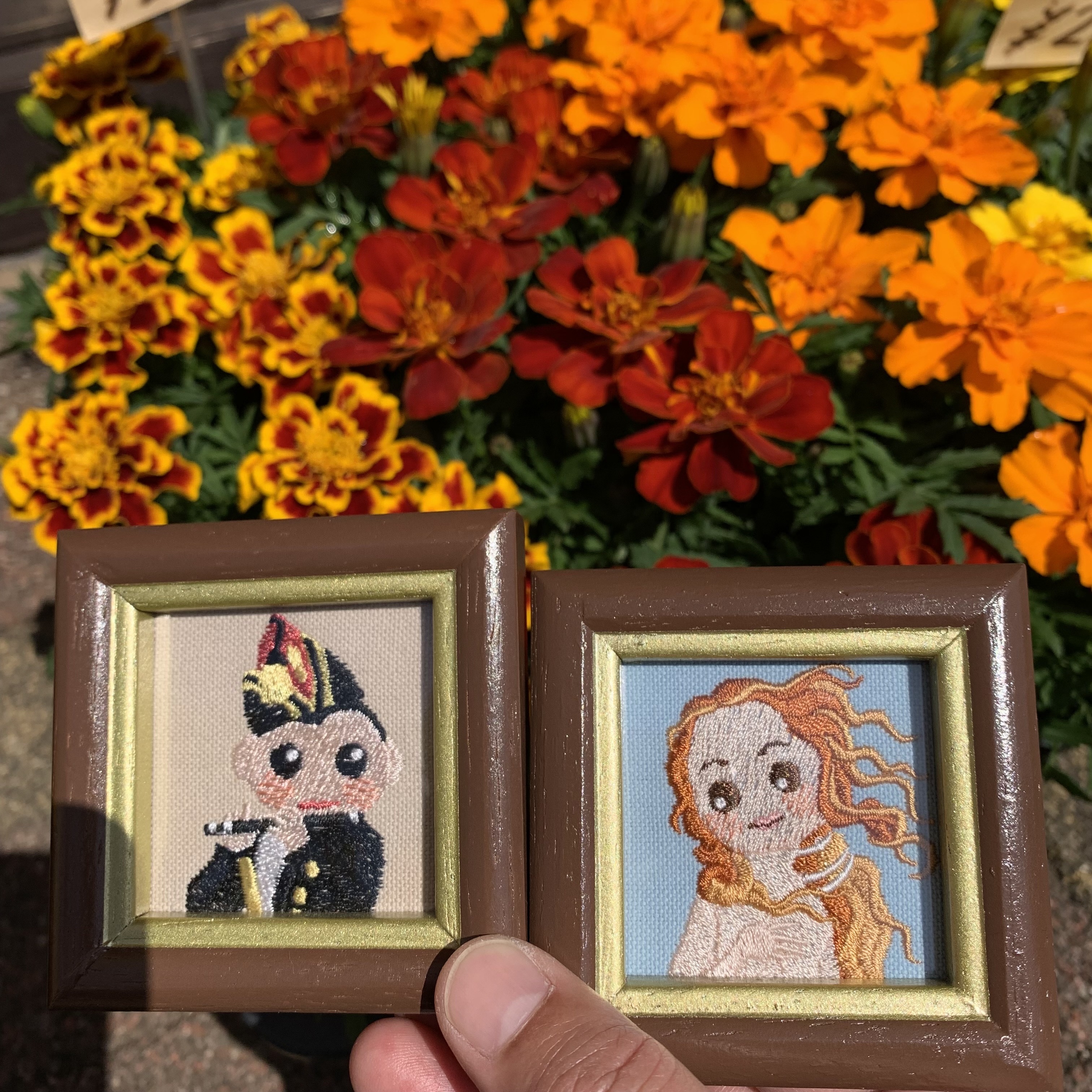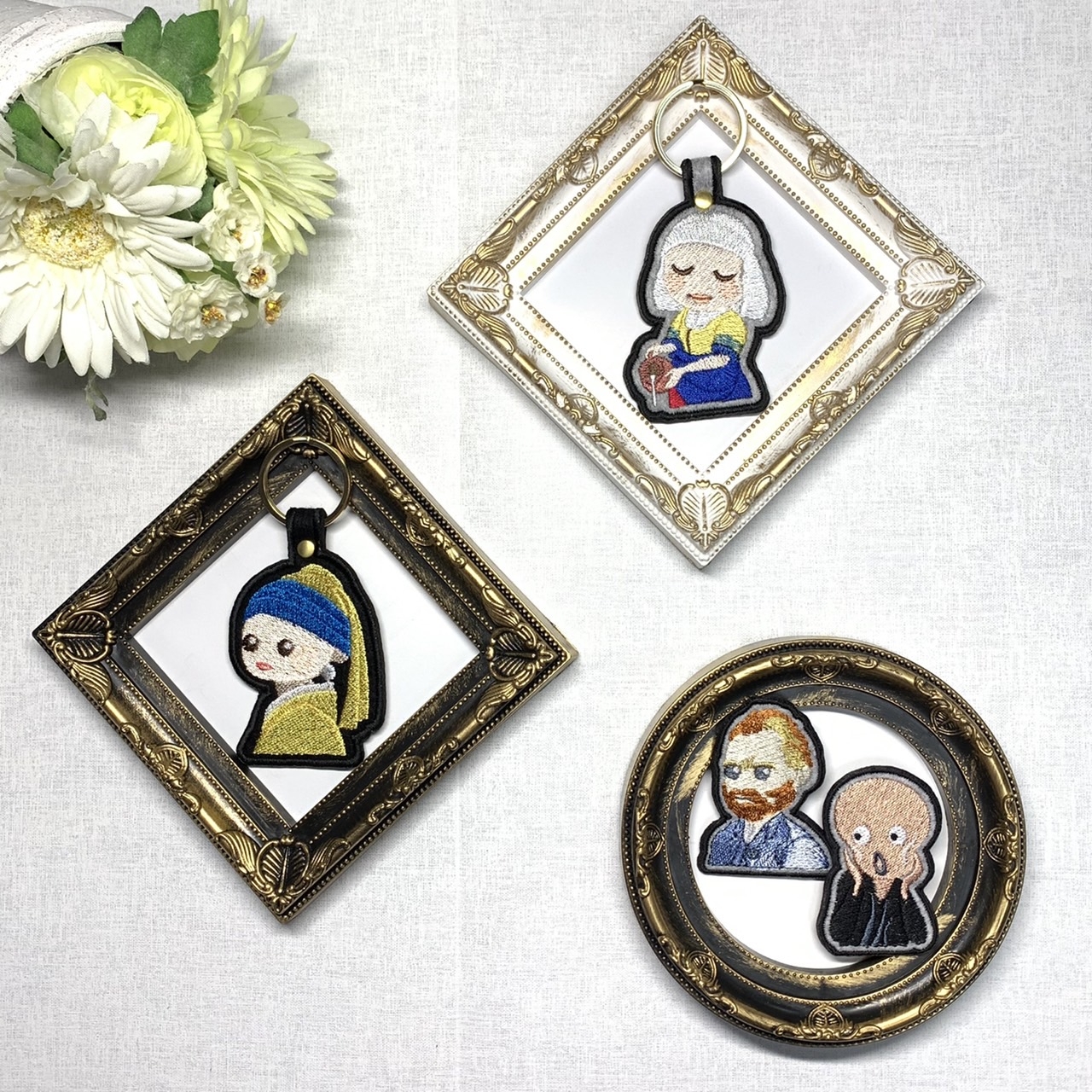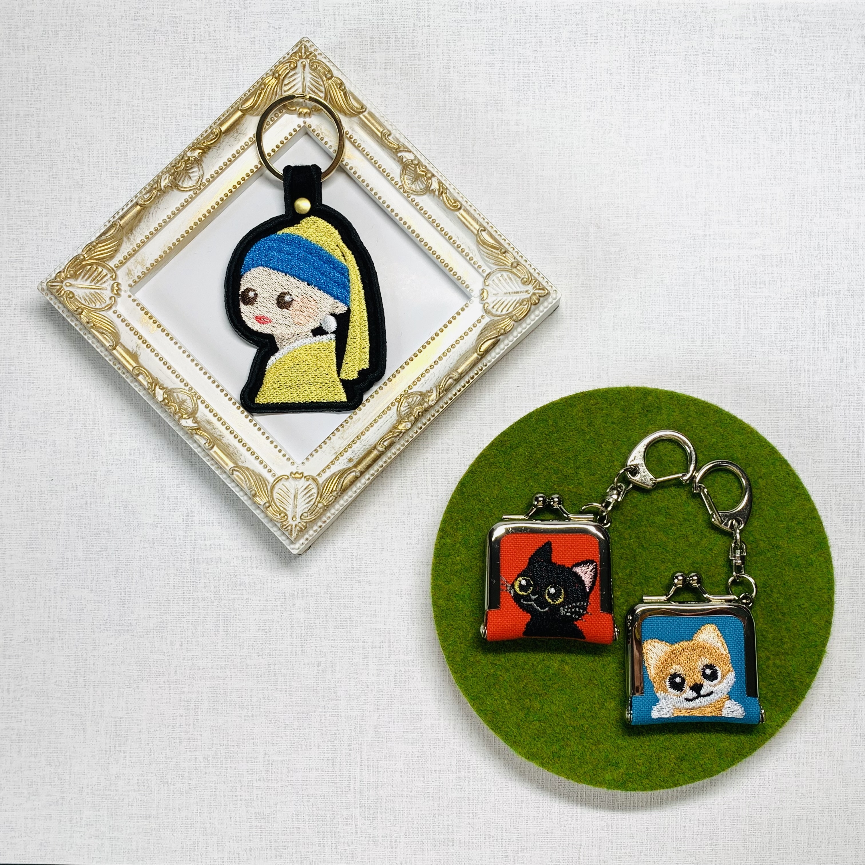 オリジナルキャラクター「アートな仲間たち」とわんことねこのいつも身近に使える刺しゅう雑貨を制作しています。 キーリング・まめがまぐちには、その場でレザータグにお名前を刻印してお付けいたします。 お写真そのままをぬくもりの刺しゅうでおつくりする「フォト刺しゅう」も展示・販売いたしますので、実際に近くで見て触って感じてください。