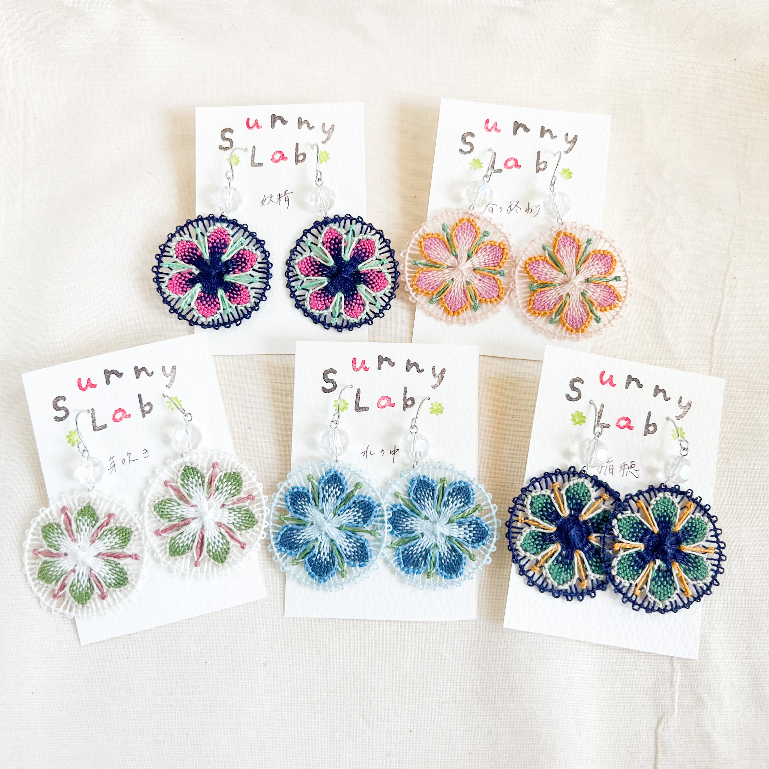 南米パラグアイの伝統的なレース「ニャンドゥティ」の技法で制作しています。刺繍糸で織るように作ったアクセサリーはとても軽く、身体に負担をかけずにおしゃれを楽しんでいただけますよ。