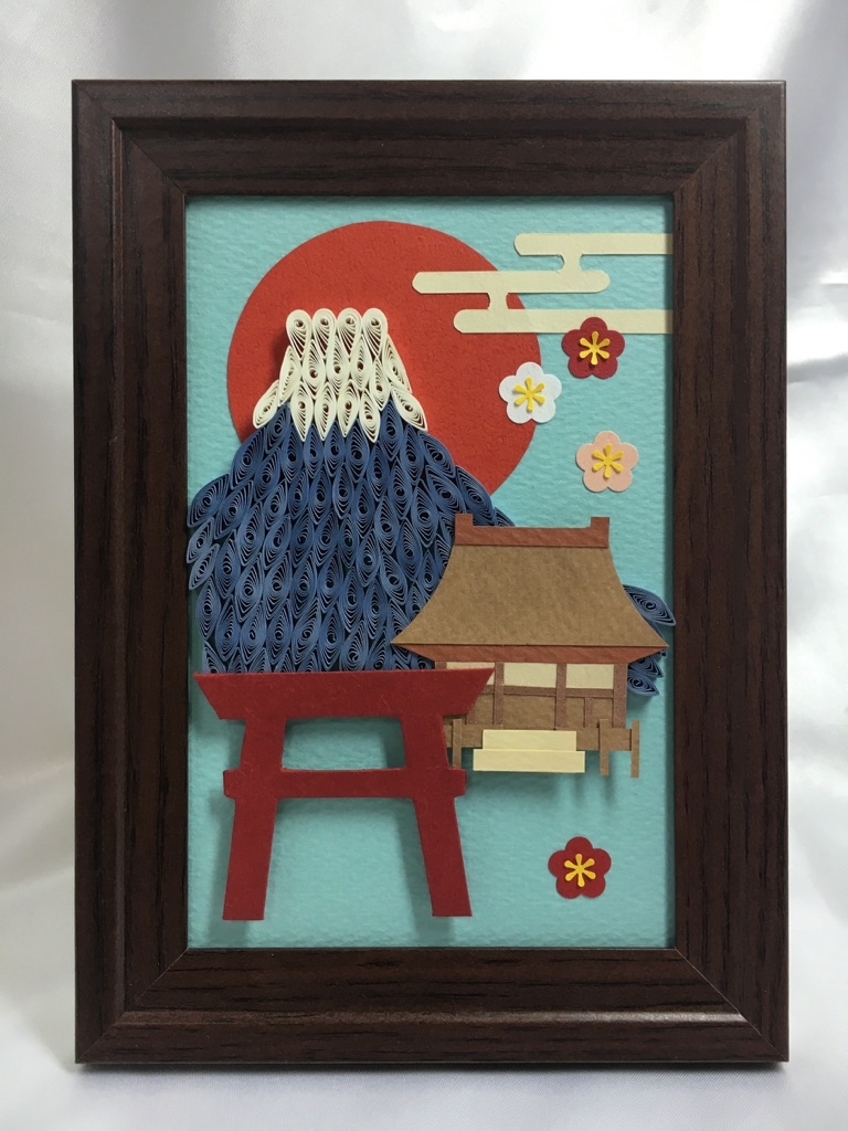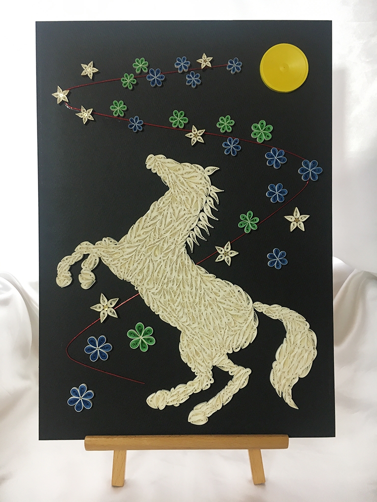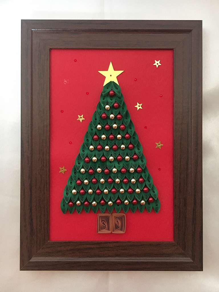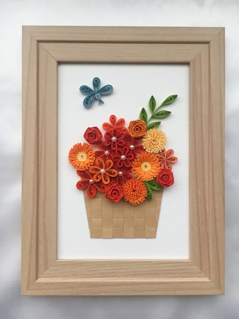 テープ状の紙をくるくる巻いてパーツを作り、それらを組み合わせて動物や花などを形作るペーパーアートです。その歴史は古く 15 世紀~16 世紀イタリアやフランスの修道院で芸術性が高められました。当時は紙は大変貴重なものだったので製本の際に出る紙の切れ端を鳥の羽(Quill)に巻つけて形を作り、身の周りの品を美しく装飾したそうです。日本ではまだ知名度が低いのですが、教室や展示会なども増えてきて、だんだん目にする機会が多くなってきました。日本の四季を題材に取り入れるなどして、国内でも親しみやすい作品づくりを心がけています。