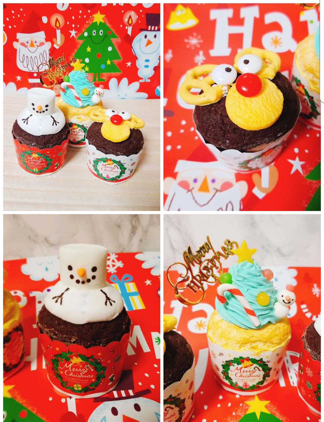 マフィンの生地をカップに入れる。パーツを選んでチョコソースでトッピングし、ホイップクリームでデコレーションする。