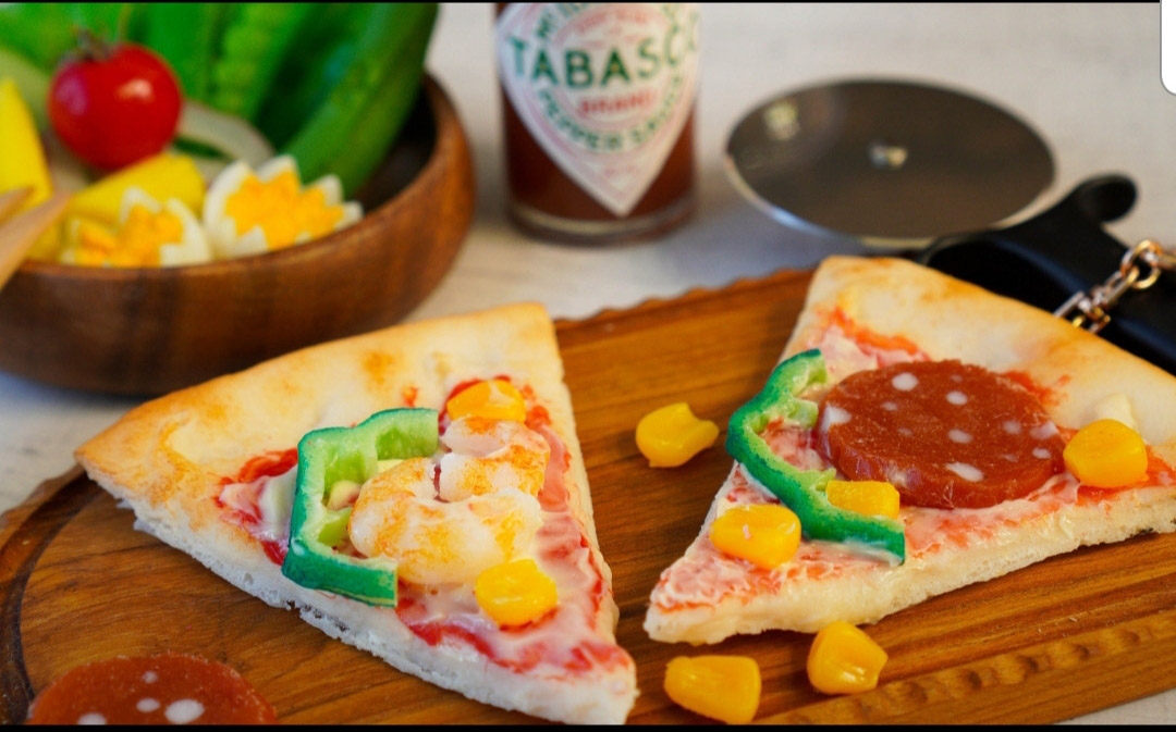 生地に焼き色をつける。ケチャップを塗り具材をのせる。チーズをかけ仕上げにニスをぬる。