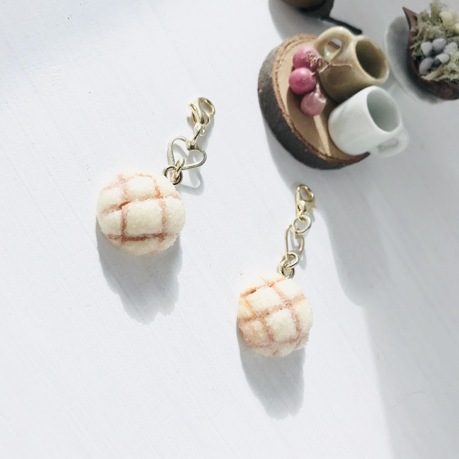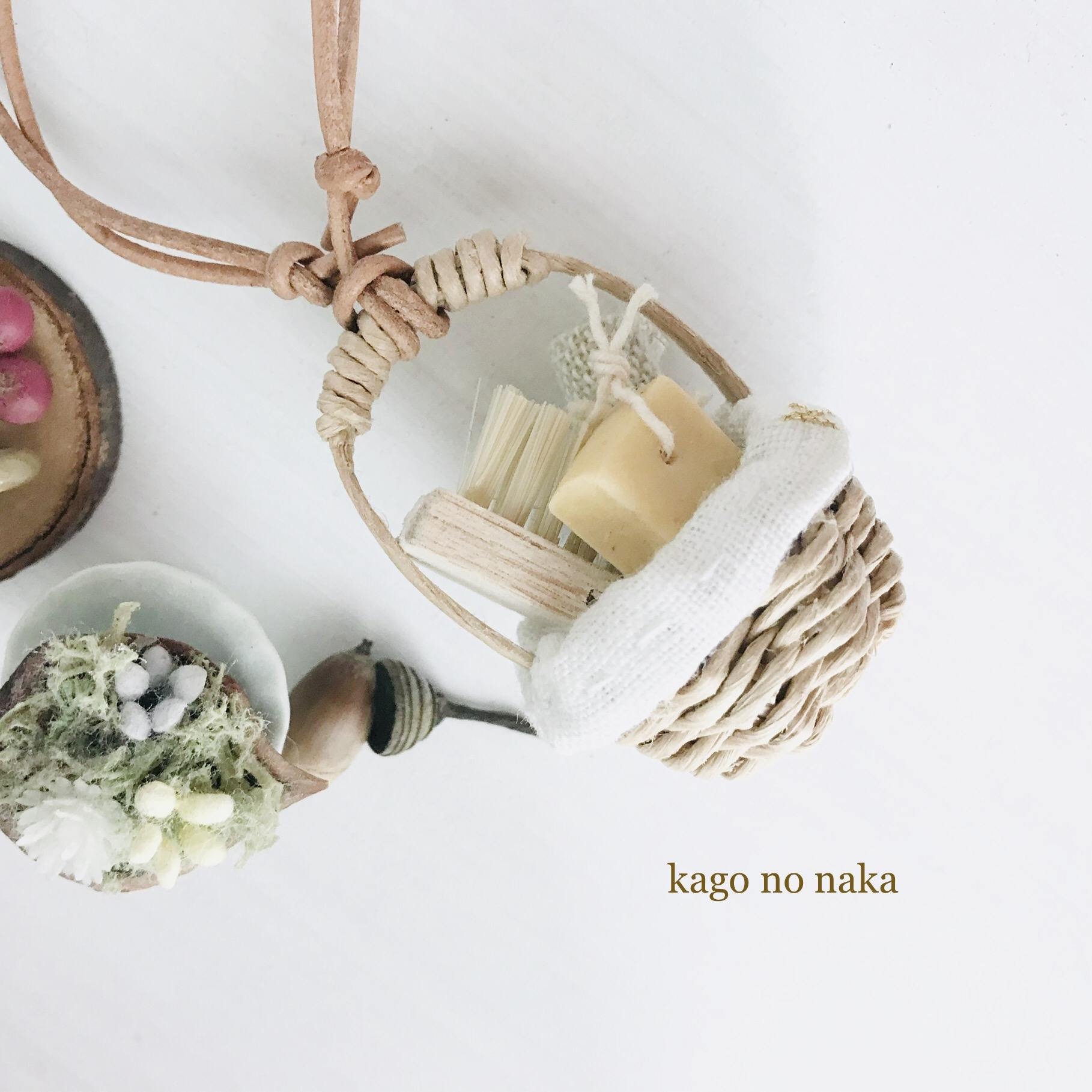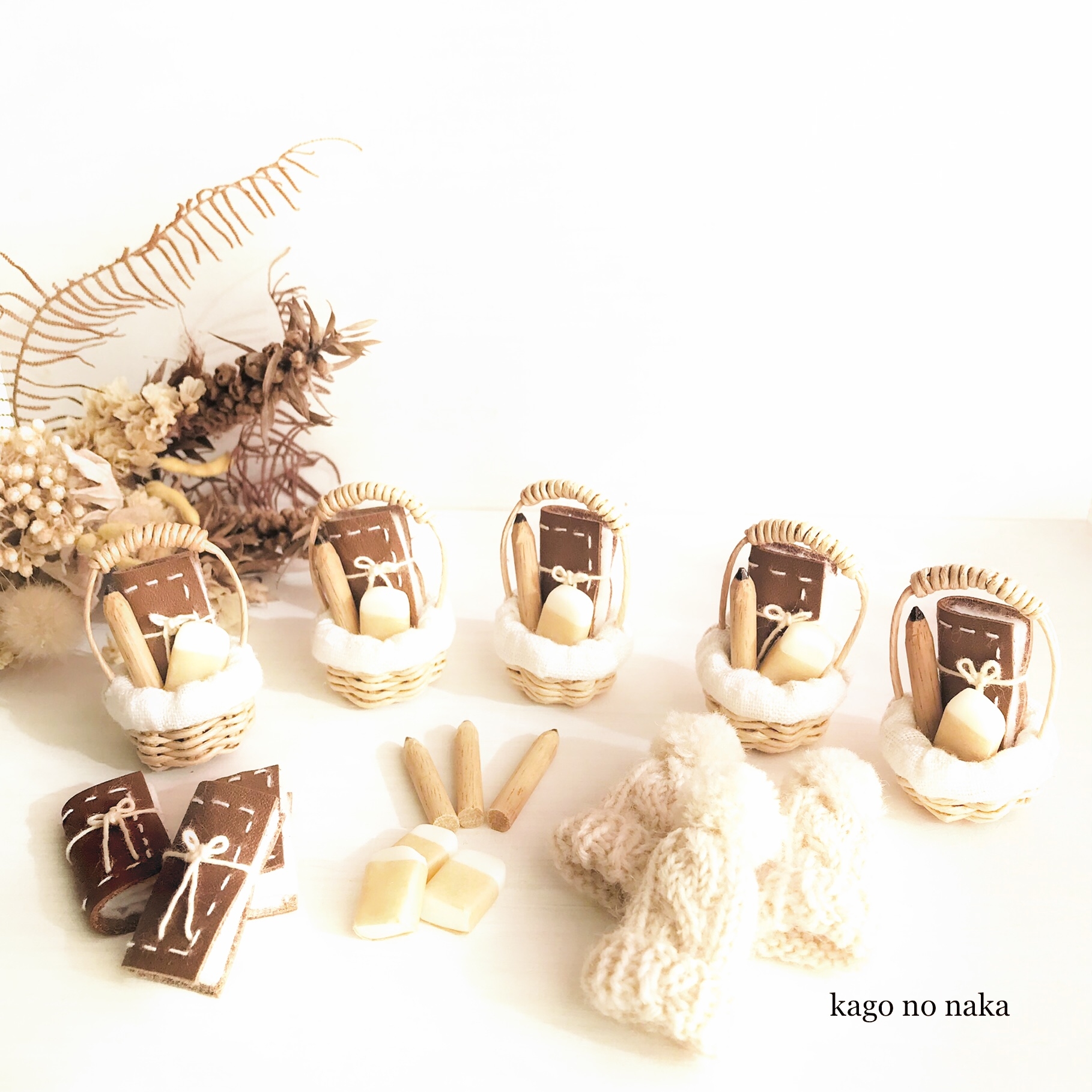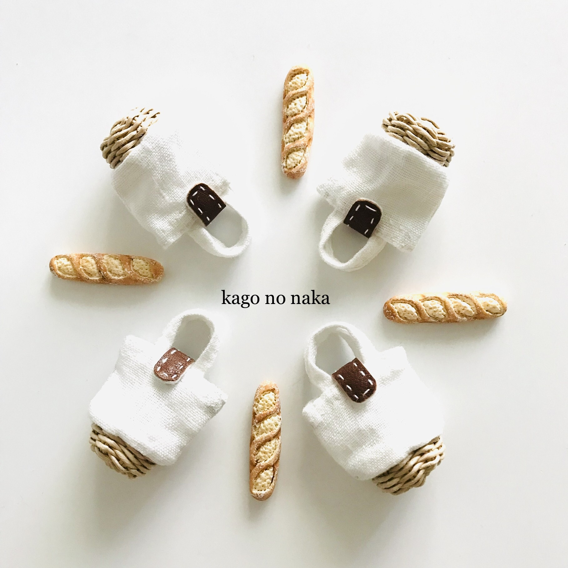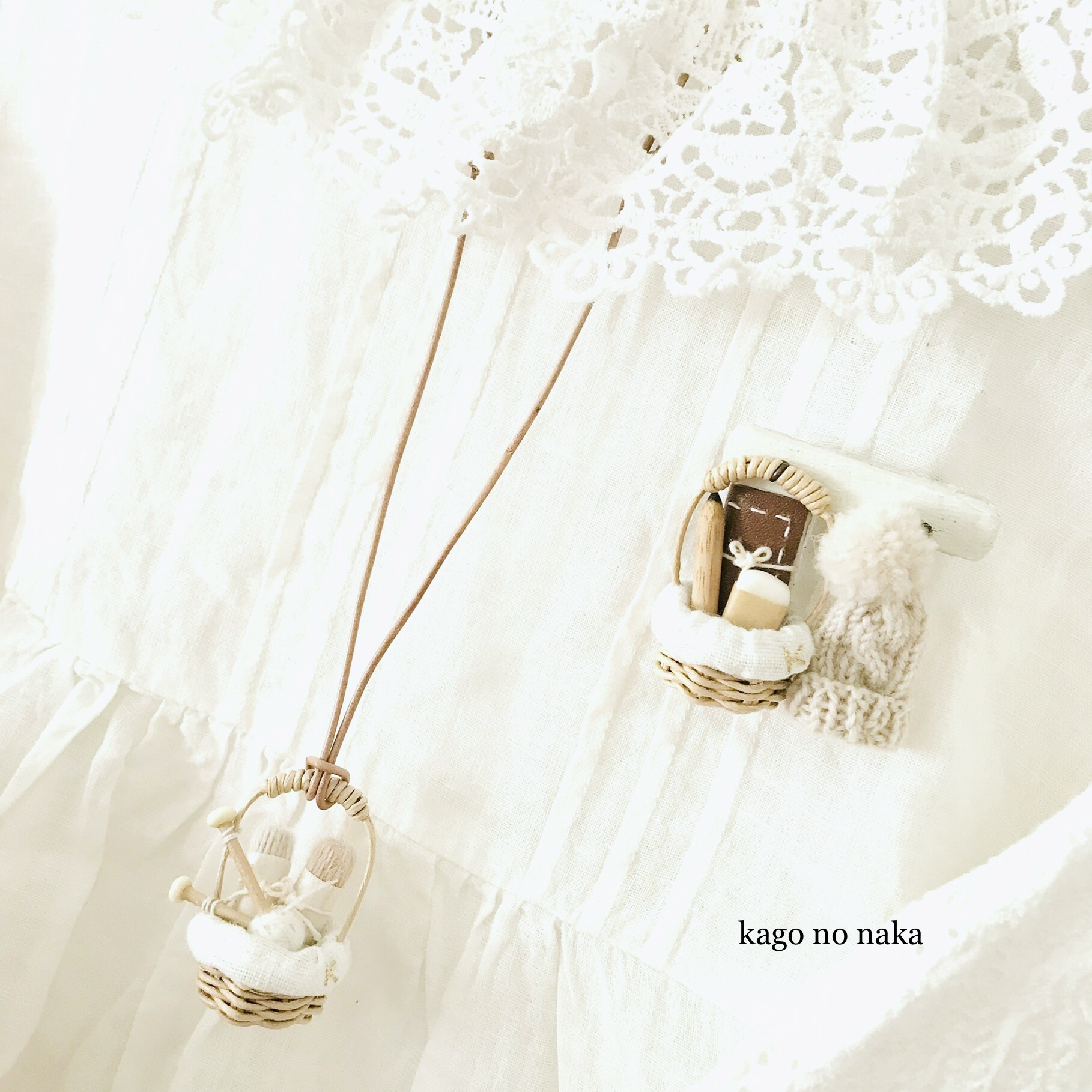 ちいさな手編みのかごに道具を詰め込んだミニチュアアクセサリーとパンやお菓子のアクセサリー
