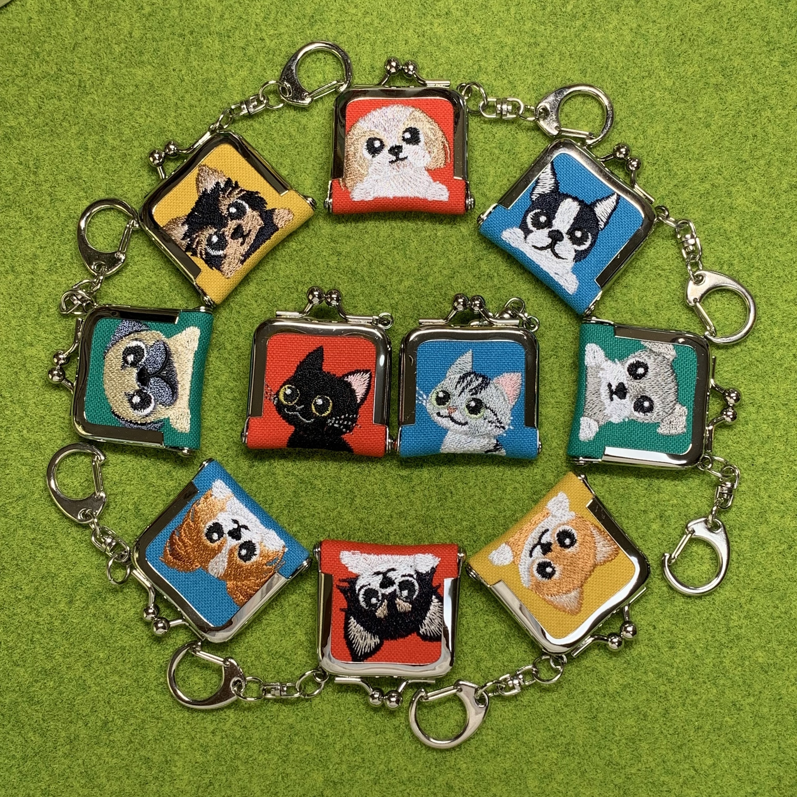 オリジナルキャラクター「アートな仲間たち」とわんことねこのいつも身近に使える刺しゅう雑貨を制作しています。 キーリング・まめがまぐちには、その場でレザータグにお名前を刻印してお付けいたします。 お写真そのままをぬくもりの刺しゅうでおつくりする「フォト刺しゅう」も展示・受注販売もいたしますので、実際に近くで見て触って感じてください。