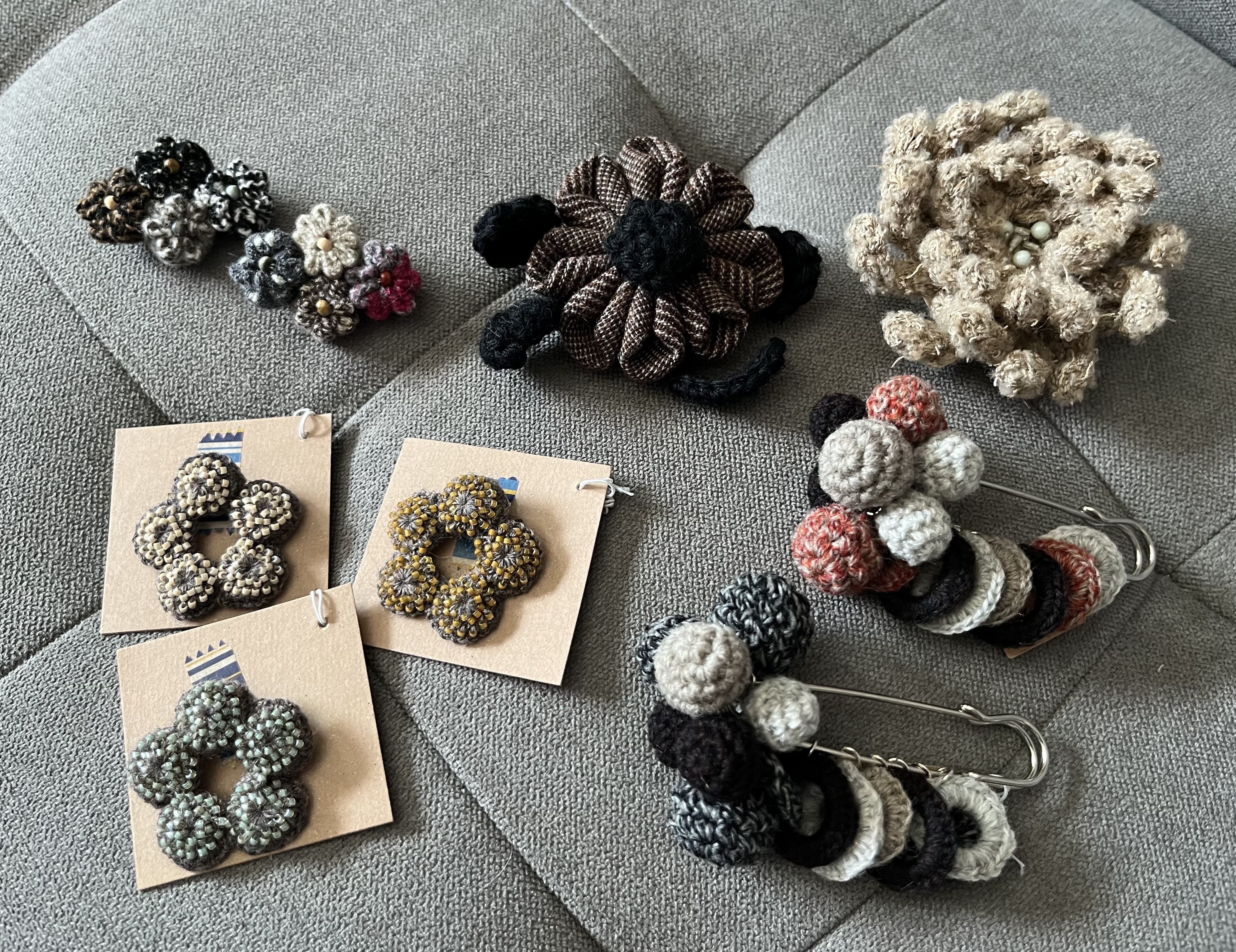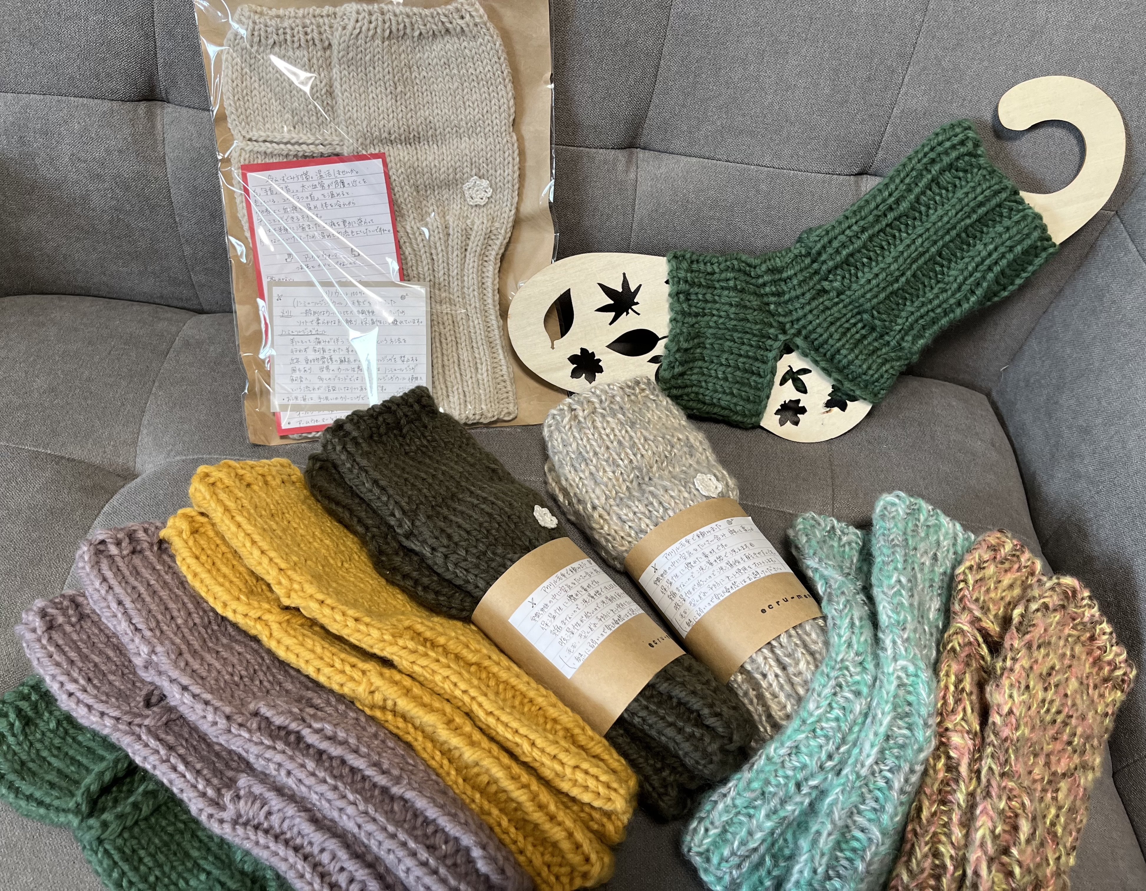 秋冬のあたたかニット小物です 帽子、スヌード、ミトン、アンクルウォーマーや 巾着、ブローチなど ユルくてレトロな手編みのよさと他にないものを。と 1針1針作っています
