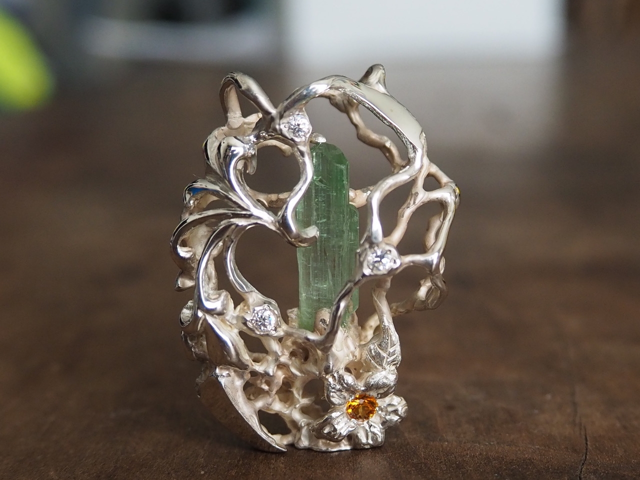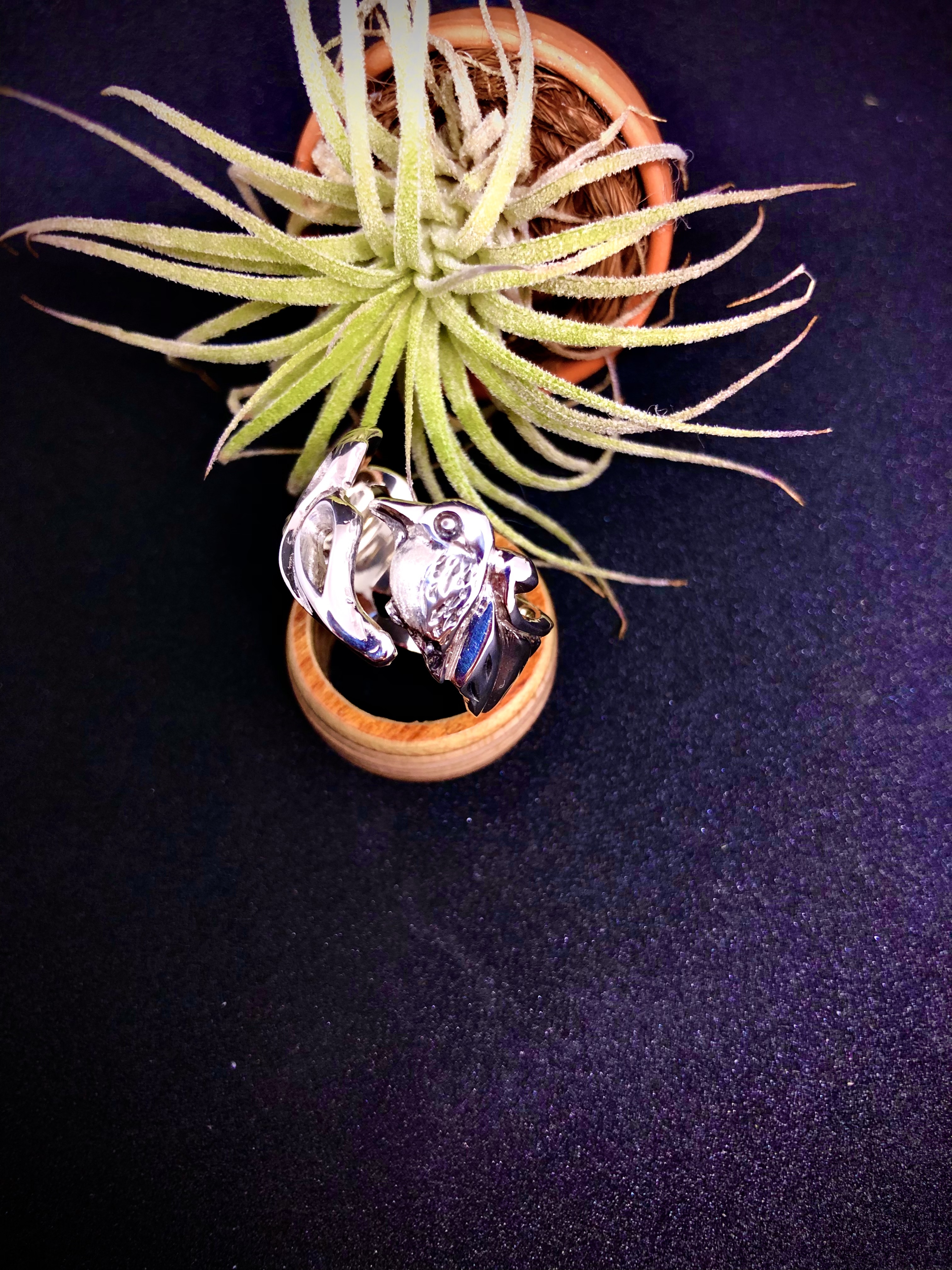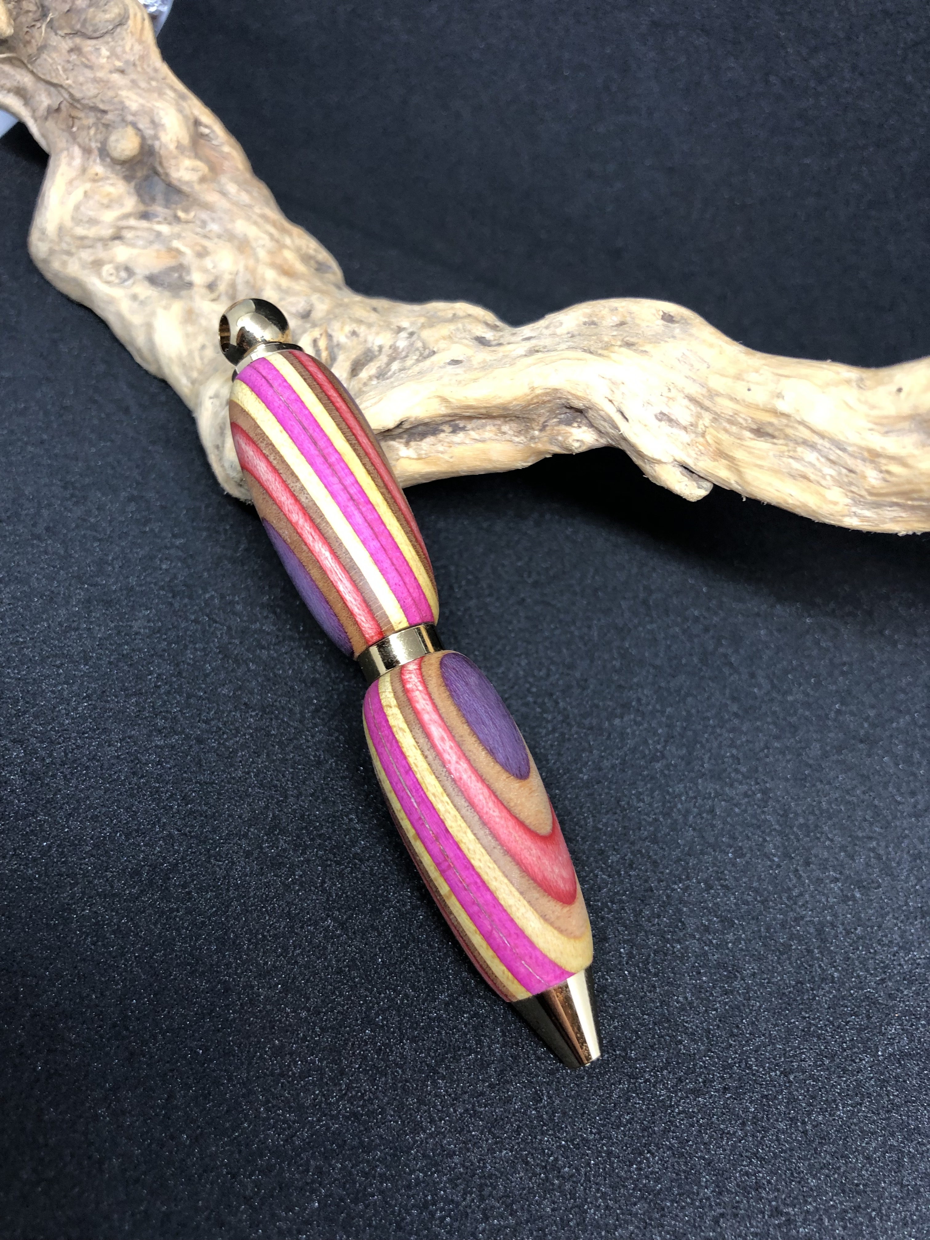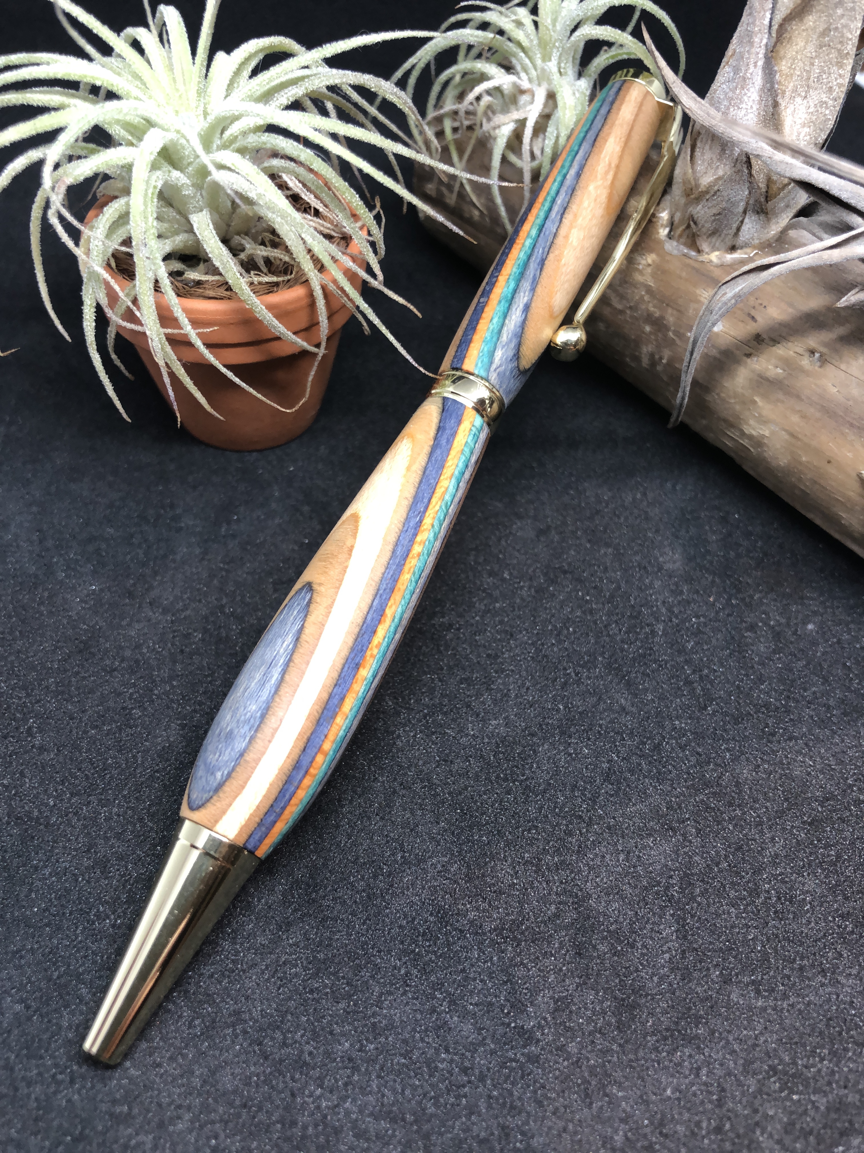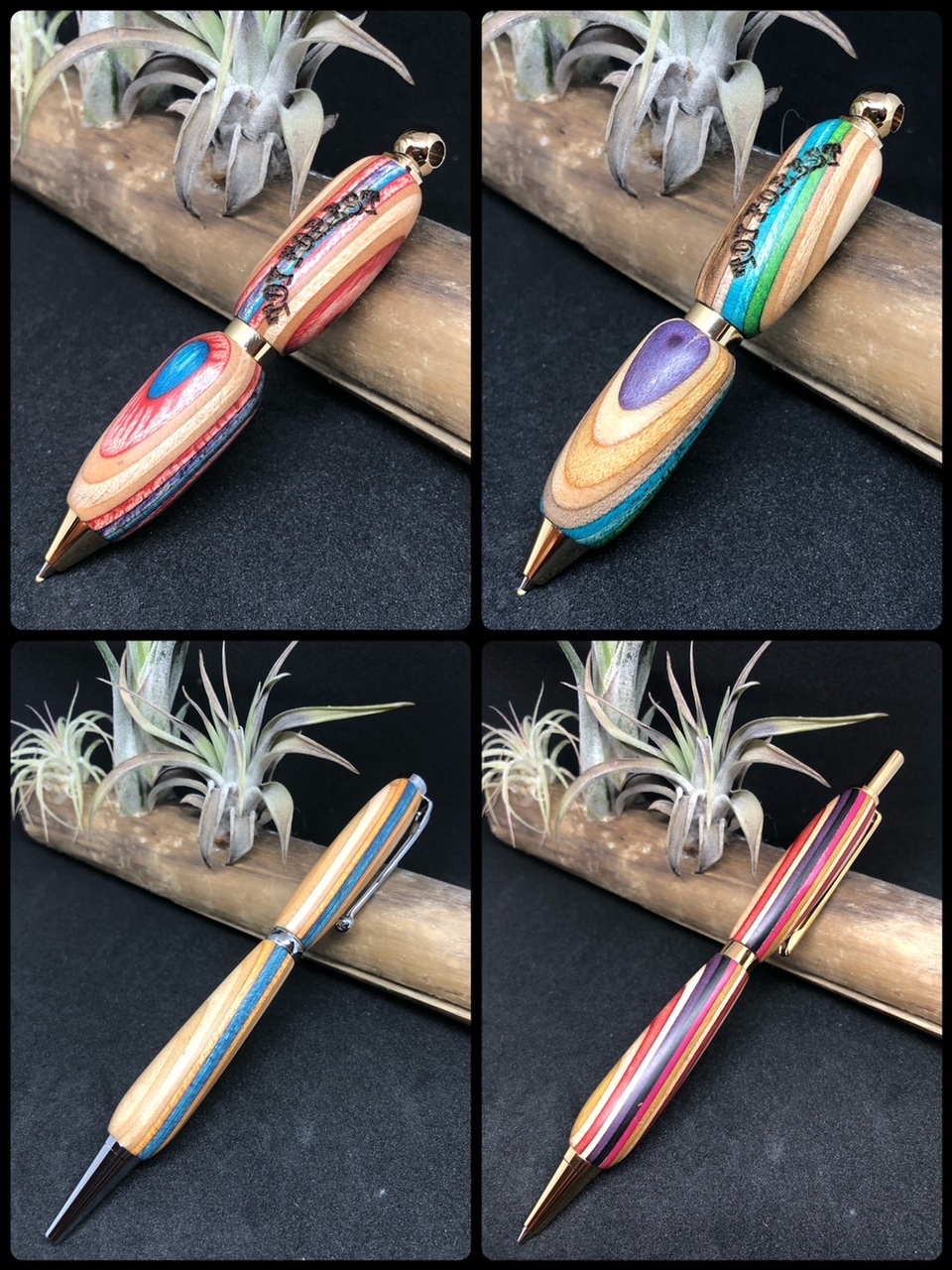 シルバーと木の素材で作成しています。木のアクセサリーはよくありますが、スケートボードの廃材を利用し作成するSDGsで注目を集めるエシカルな作品を展開しています。スケートボードは7枚のメープルの板を圧着して出来ており、色んな色が間に入っています。着色は一切せずその色味を生かしてボールペン、アクセサリーを作成し一点ものとなっています。