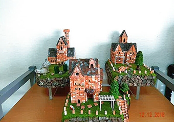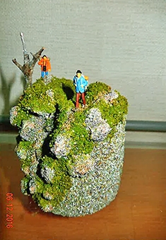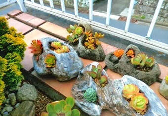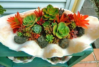 流木、貝、軽石等を鉢にした多肉植物の寄せ植え。流木等建築材を加工して作成したジオラマ風オブジェ