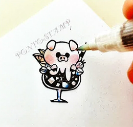 オリジナルイラストを描き、1つ1つ手彫りで消しゴムはんこを制作しています。動物から模様まで量産のラバースタンプにはない数百種に及ぶモチーフからお気に入りの1つを探してもらう事を大事にしています。その場でリクエストされた文字や名前をデザインし、即興で彫り上げるライブカービング実演も行います。