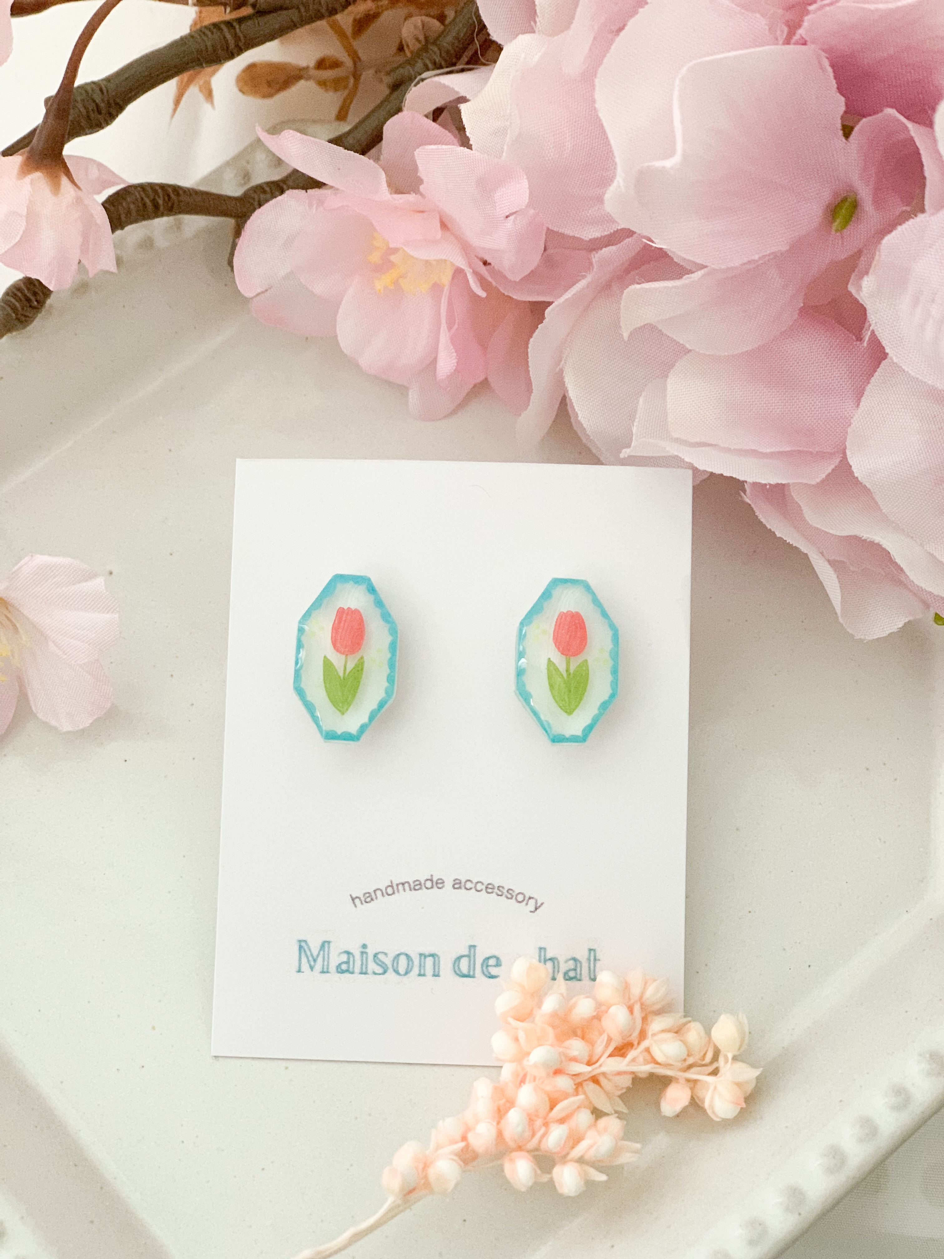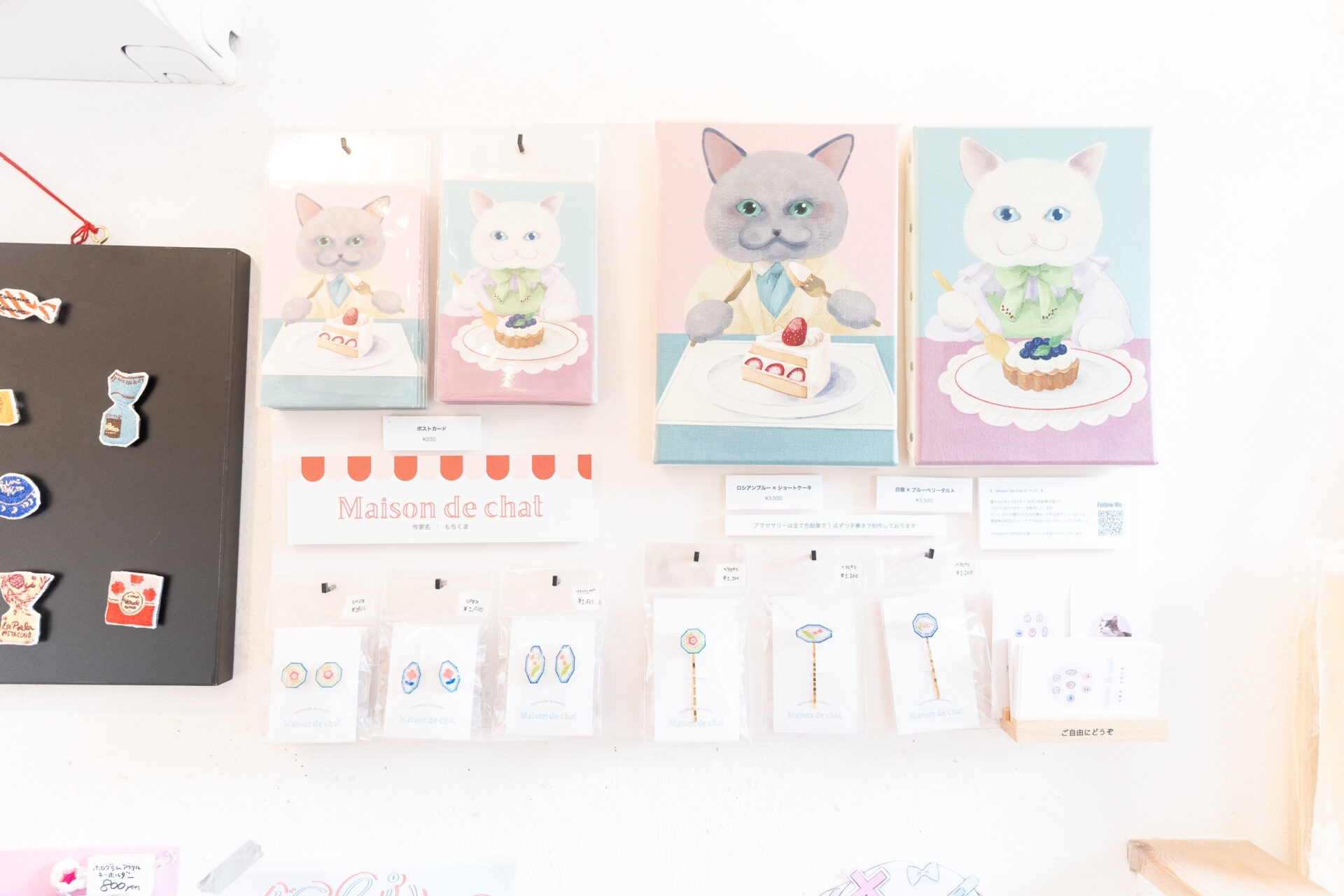 プラ板に1点づつ色鉛筆で手書きで描いたパーツを使ったアクセサリーを作成しています。猫ちゃん用のスタイ、猫ちゃんのポストカードもご用意しております。
