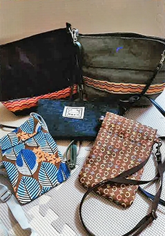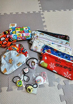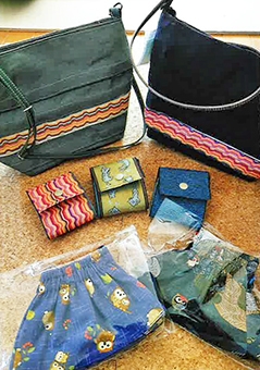 布、編み物が好きな仲間です。編み物のガマ口、ポーチは刺繍糸で編んでいます。布ペンケースはビニールカバーを付けています。皆各自試行錯誤しながら作品を作っています。