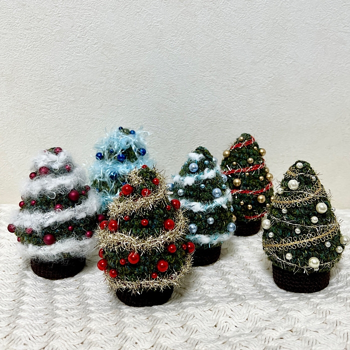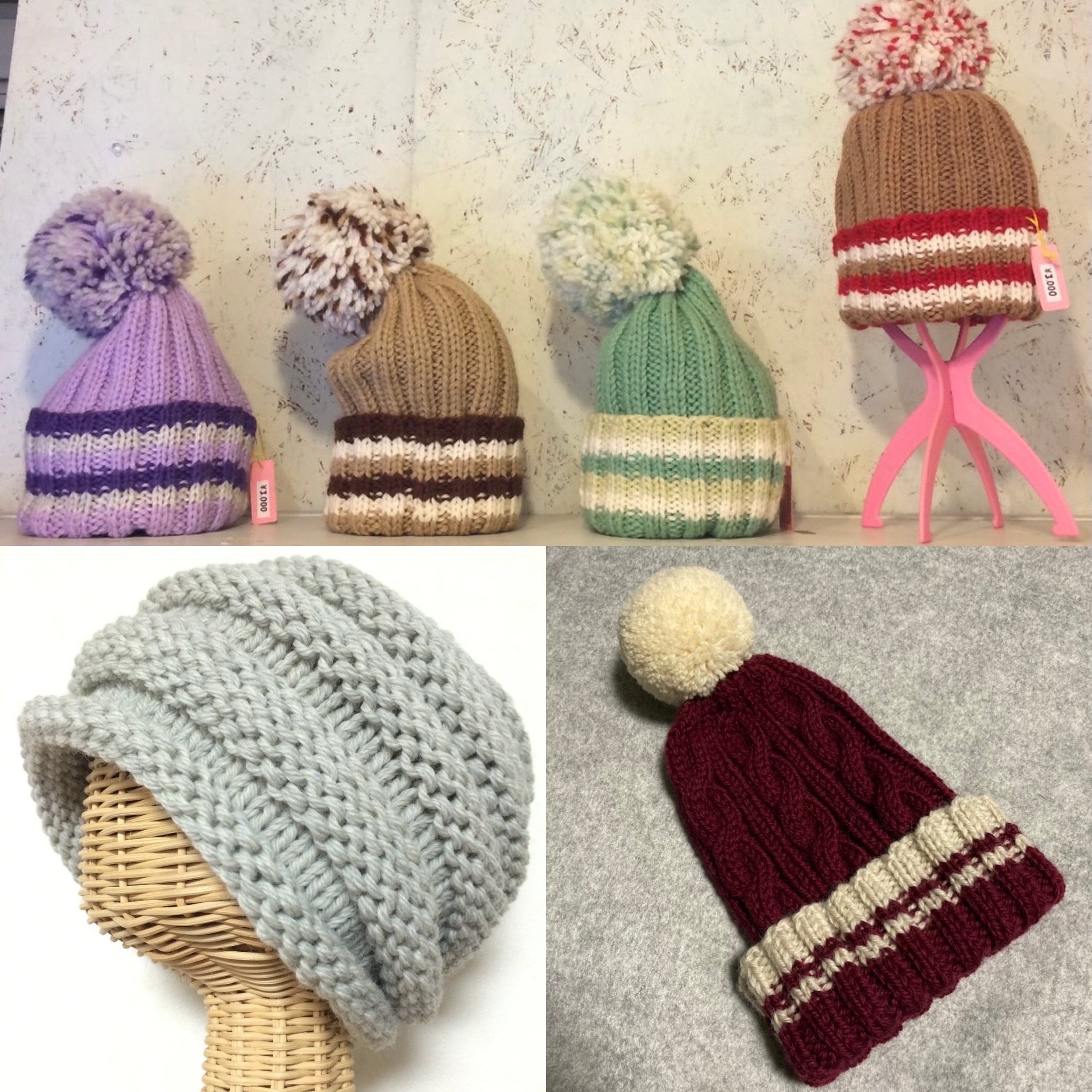 ハートのチャームやウール100%のニット帽など、カラフルで楽しい小物をひとつひとつ編んでいます。