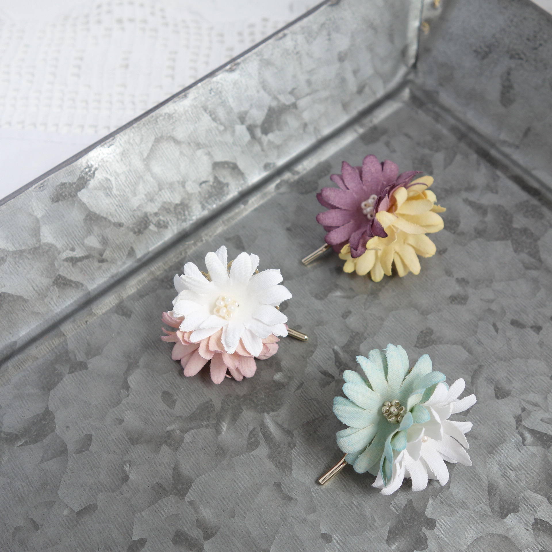 染めから製作した布製のお花をアクセサリーにしています
