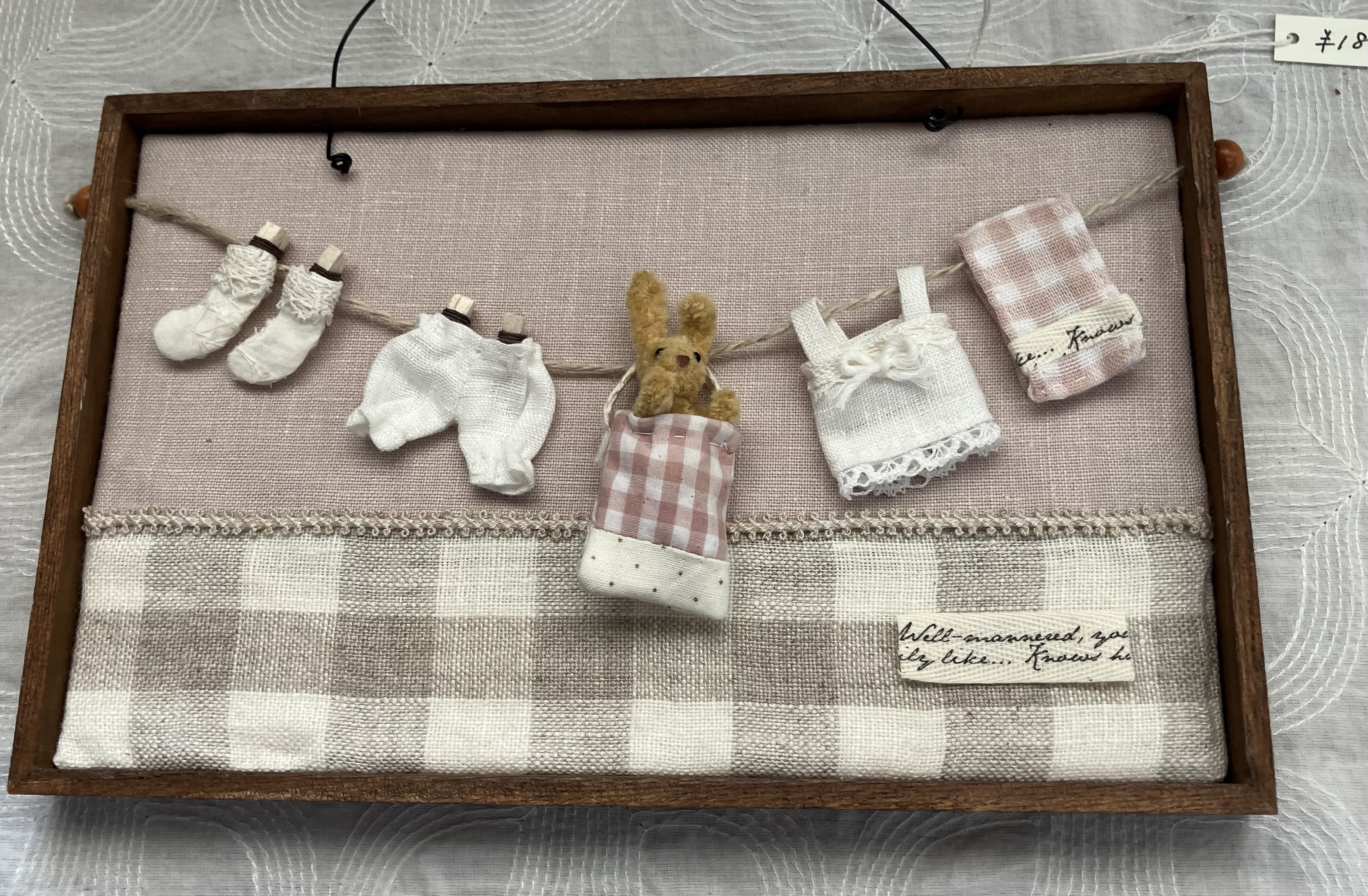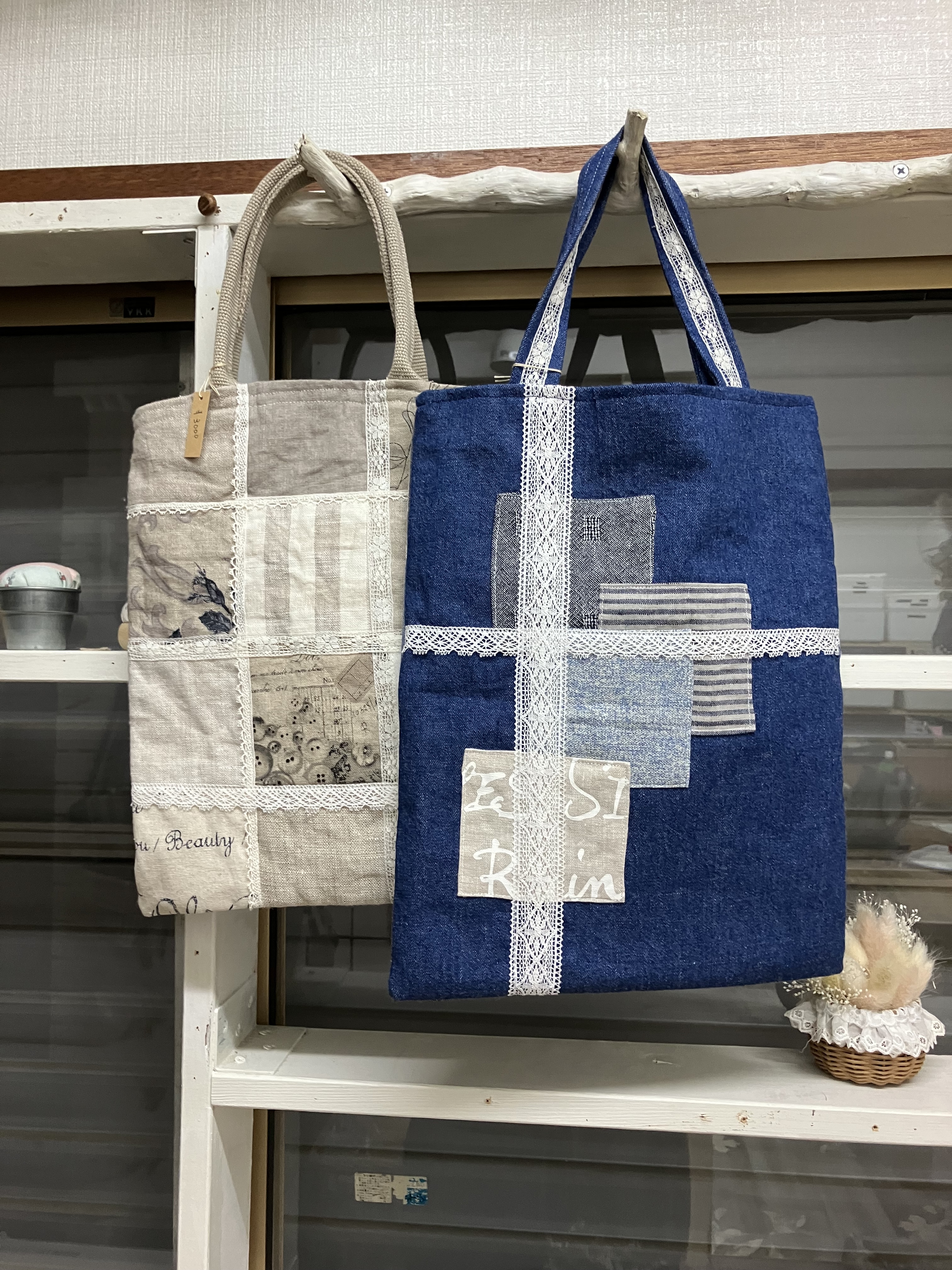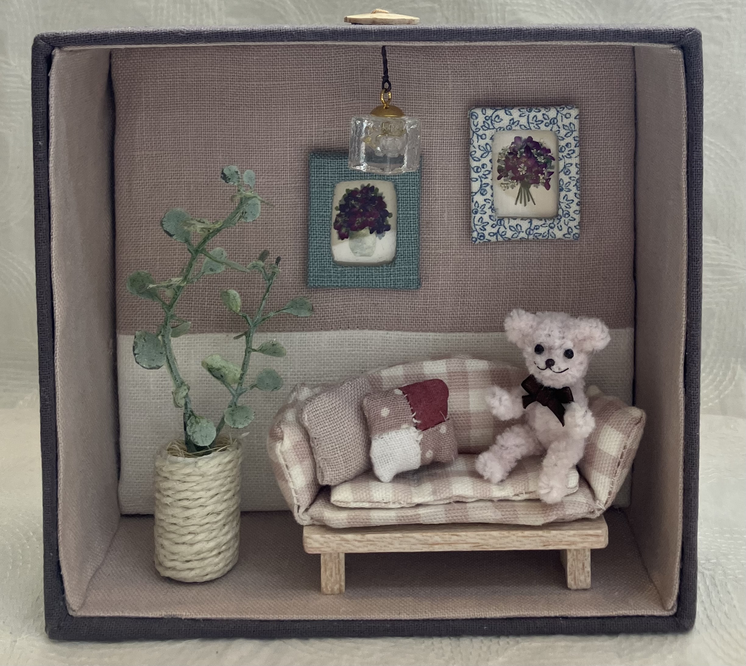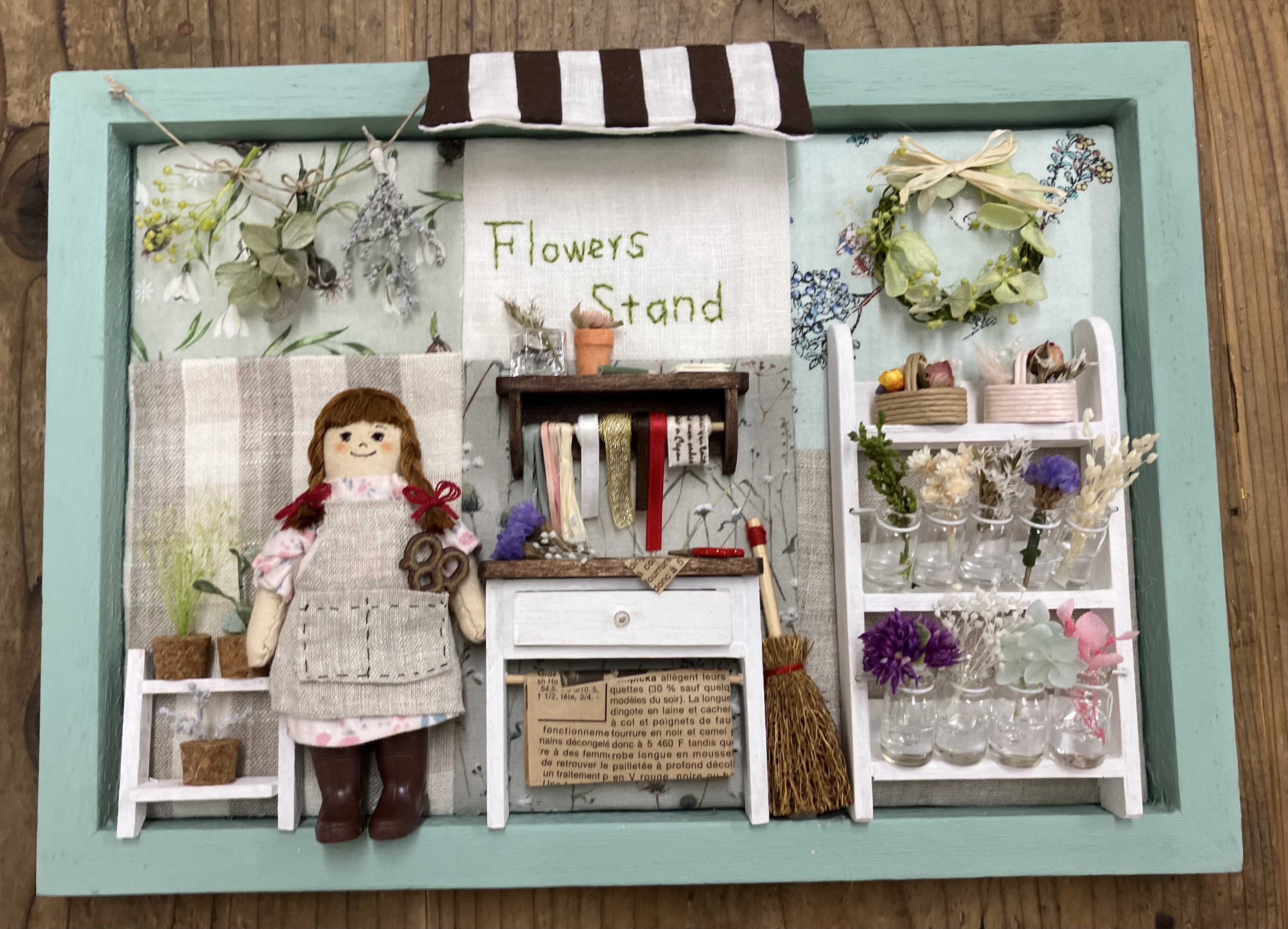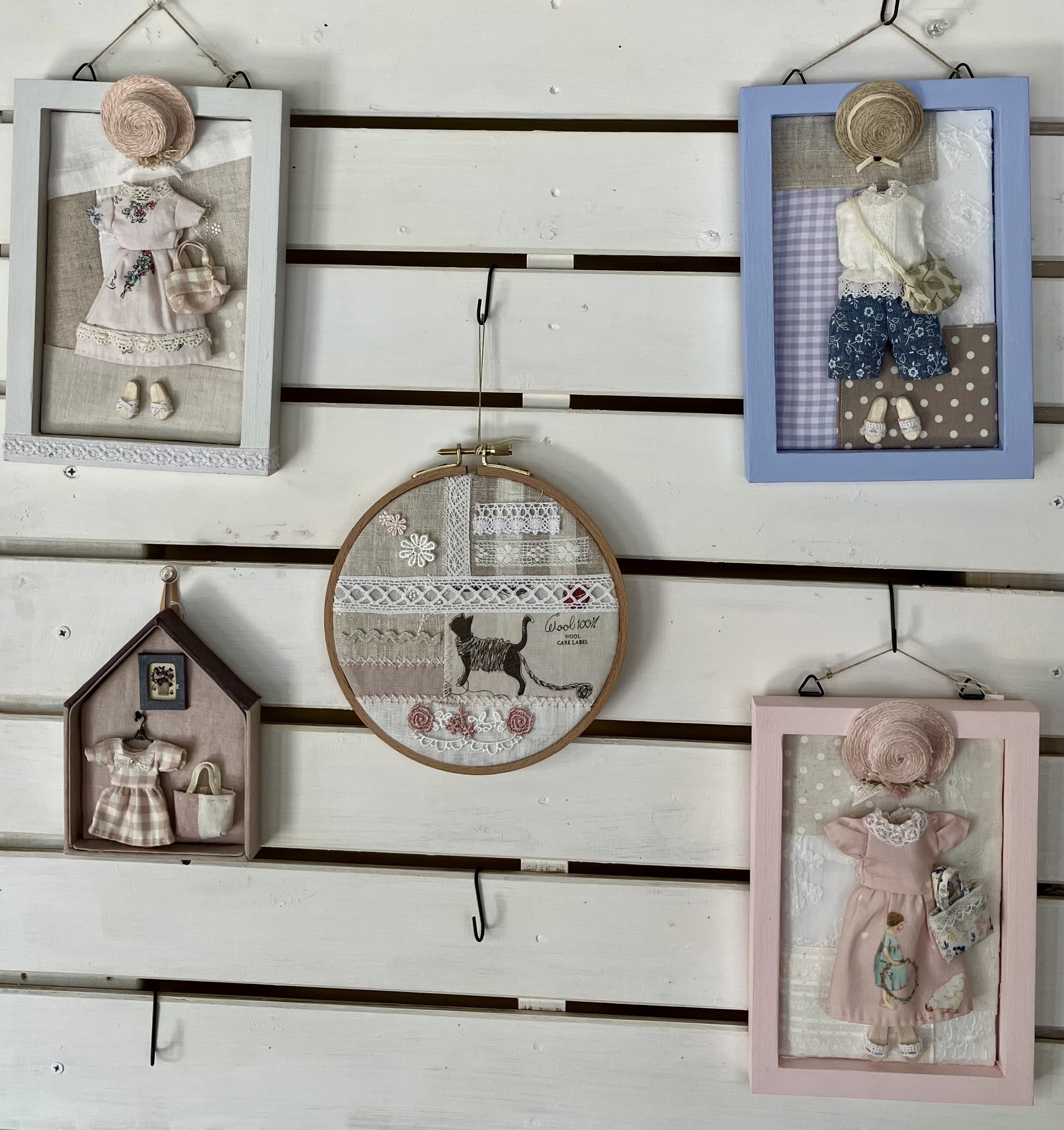 パッチワークで作った土台に、手作りのミニチュア雑貨を配して、暮らしの一コマを小さな額や箱の中に詰め込んで、おしゃれなウォールデコを作っています。