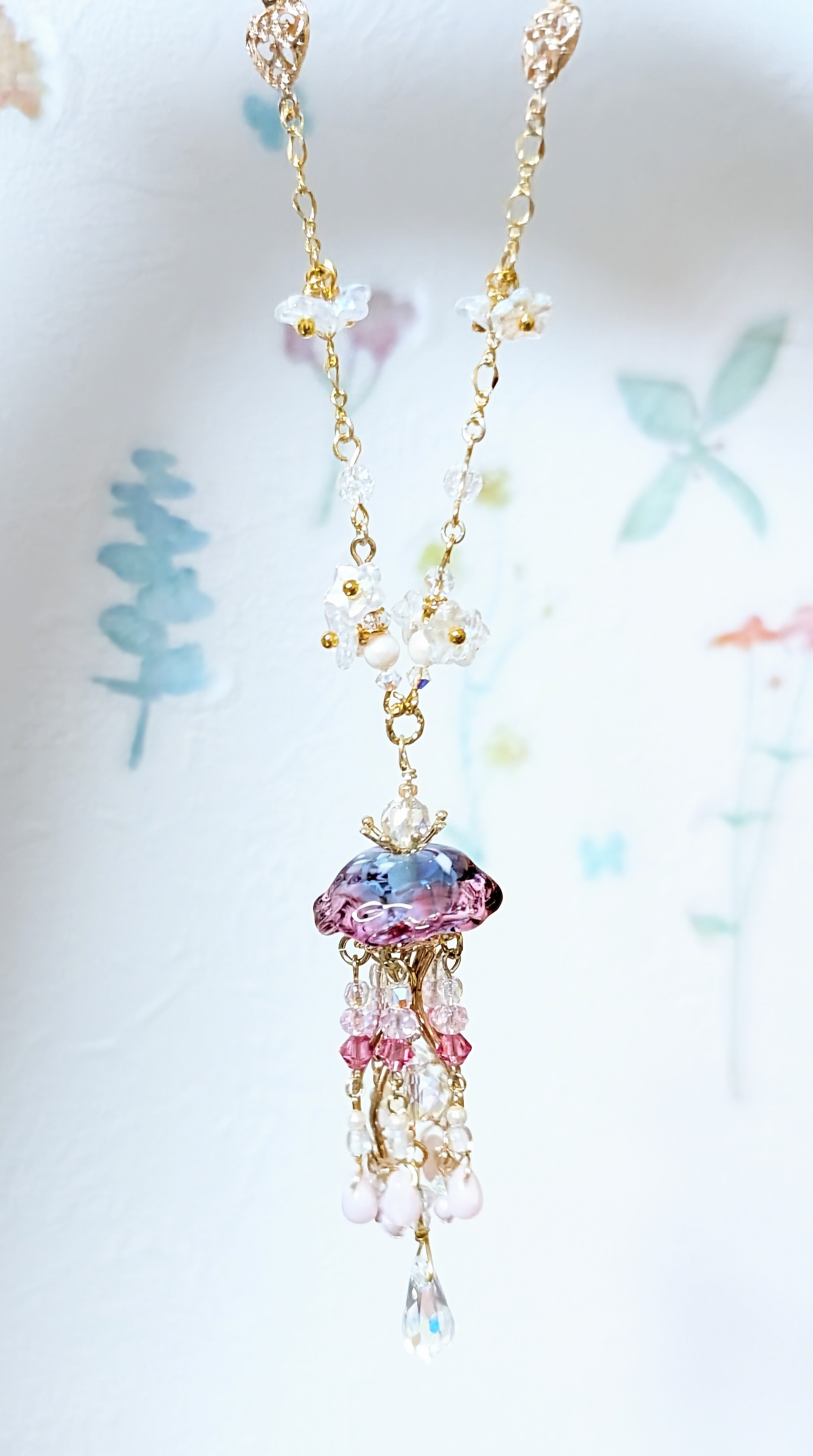 一つ一つガラスを溶かして作った傘とビーズやパーツを組み合わせた1点物のくらげのアクセサリーです。ピアス、イヤリング、簪、ネックレスなどの変更も柔軟に対応します。空想のくらげや本物そっくりのくらげなど、あなたのお気に入りを見つけに来てください。
