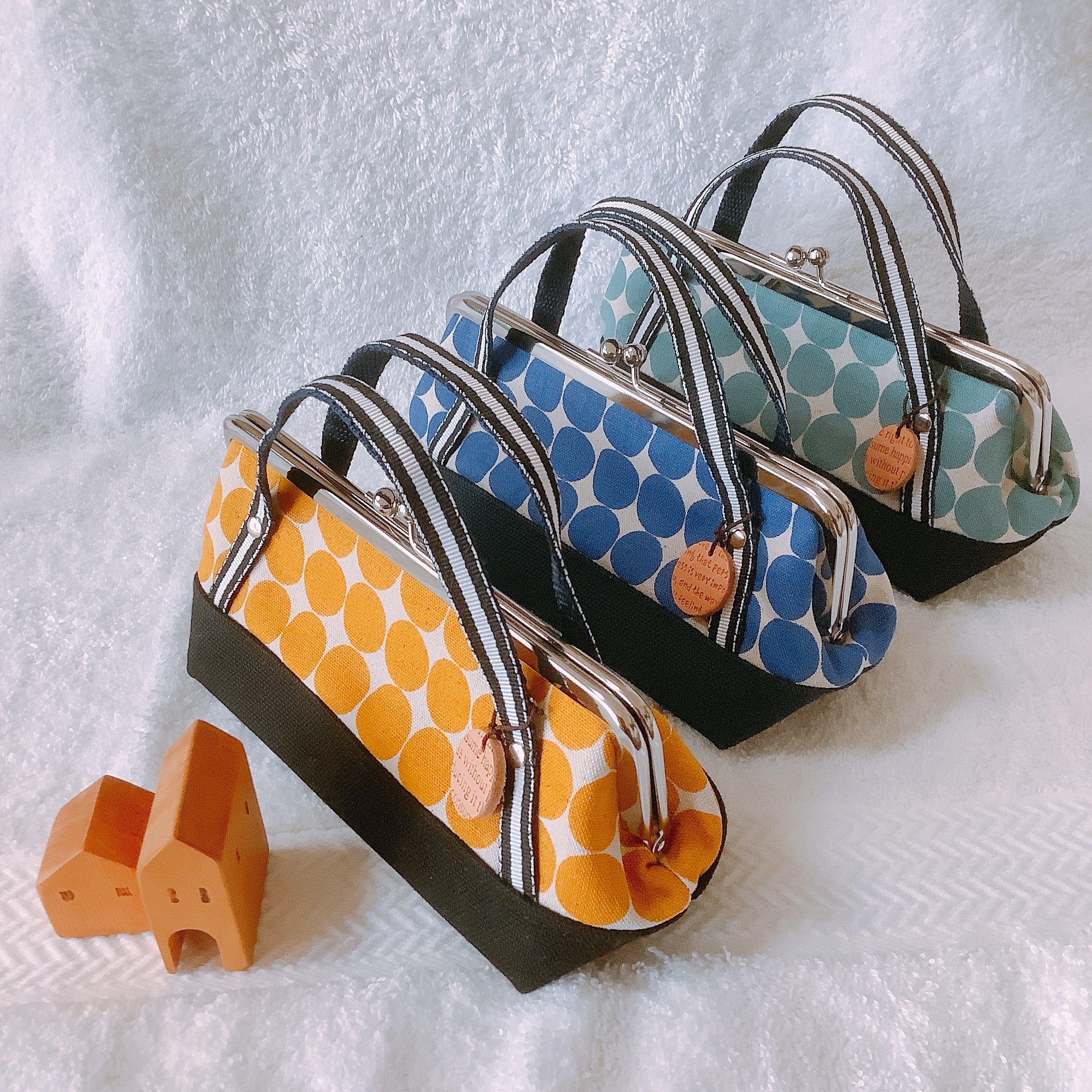 全ての商品、長く使って頂けるよう飽きのこないシンプルなデザインを心掛けながらも、生地の組合せには こだわっております。 がま口は、ぜひ手に取って「パチン」と閉まる音を楽しんで下さい