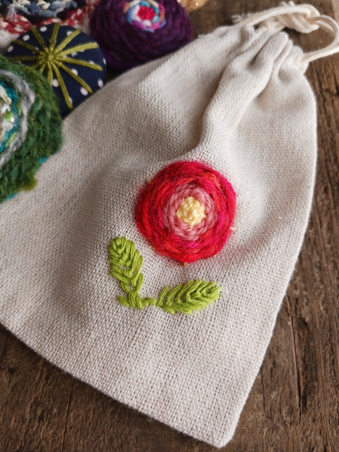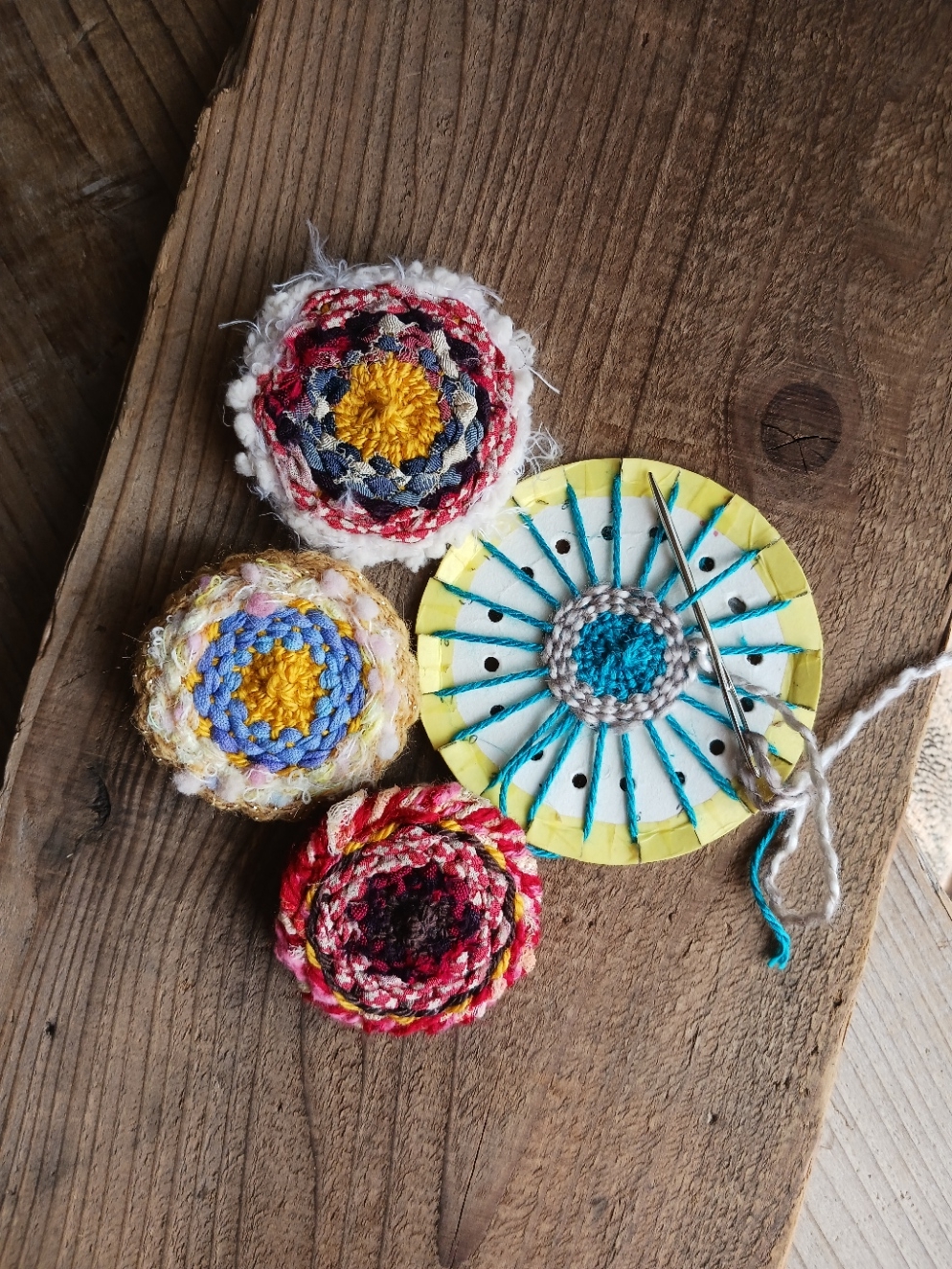 簡易織機を使う「ボード織」ではブローチを、経糸を縫いつけたミニ巾着では「織刺繍」を体験できます。