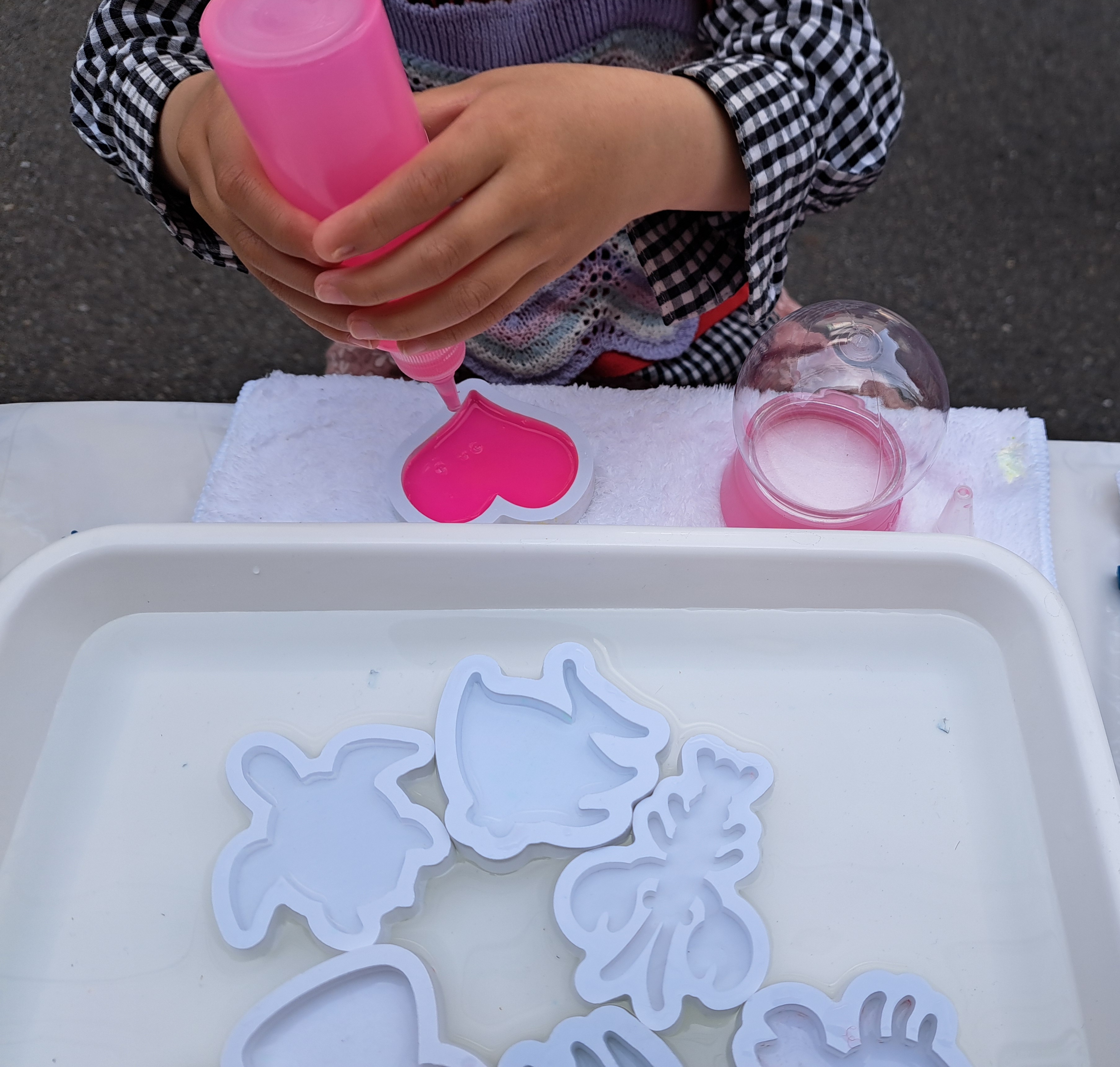 ①好きな型を選び型の中にぷにぷに液を入れる。