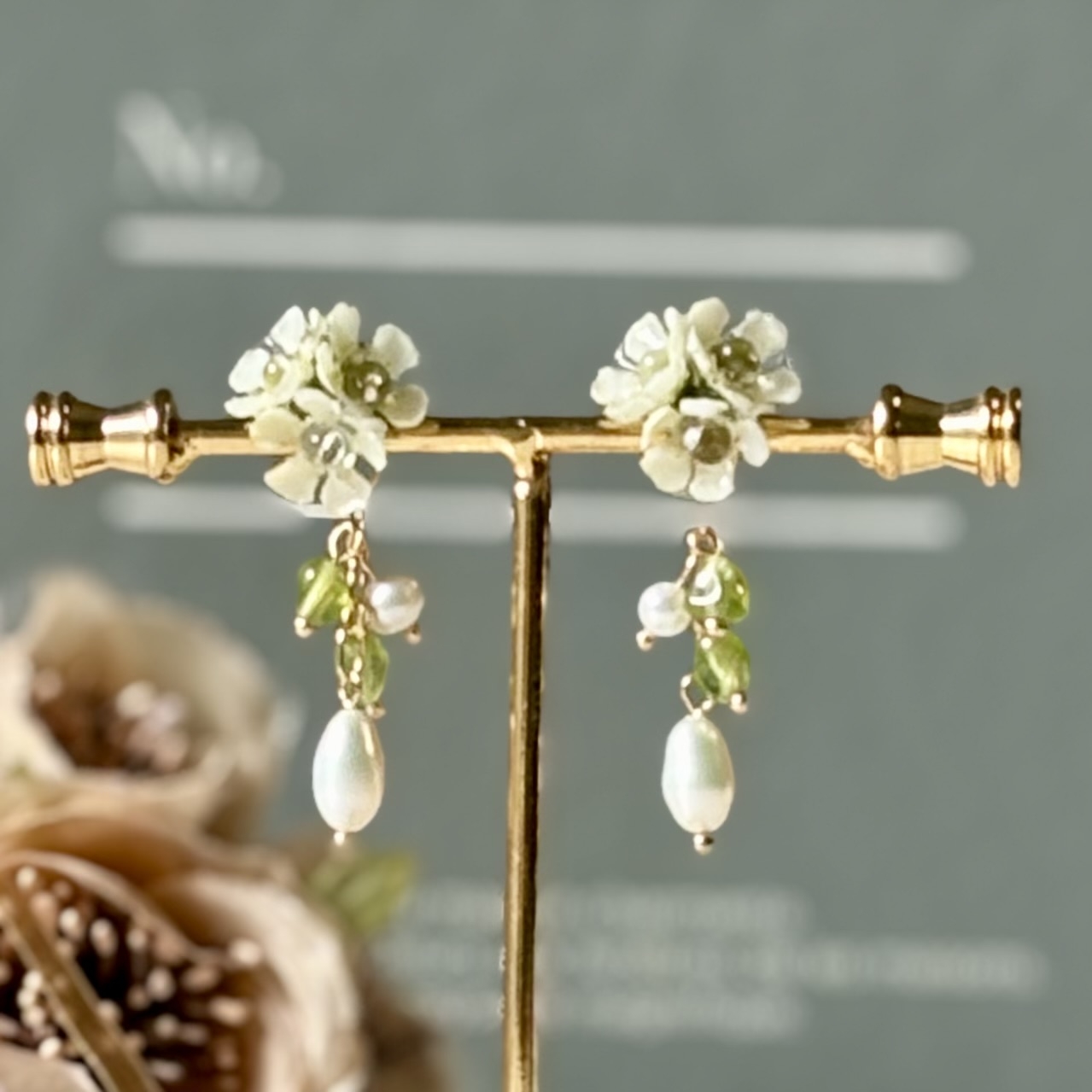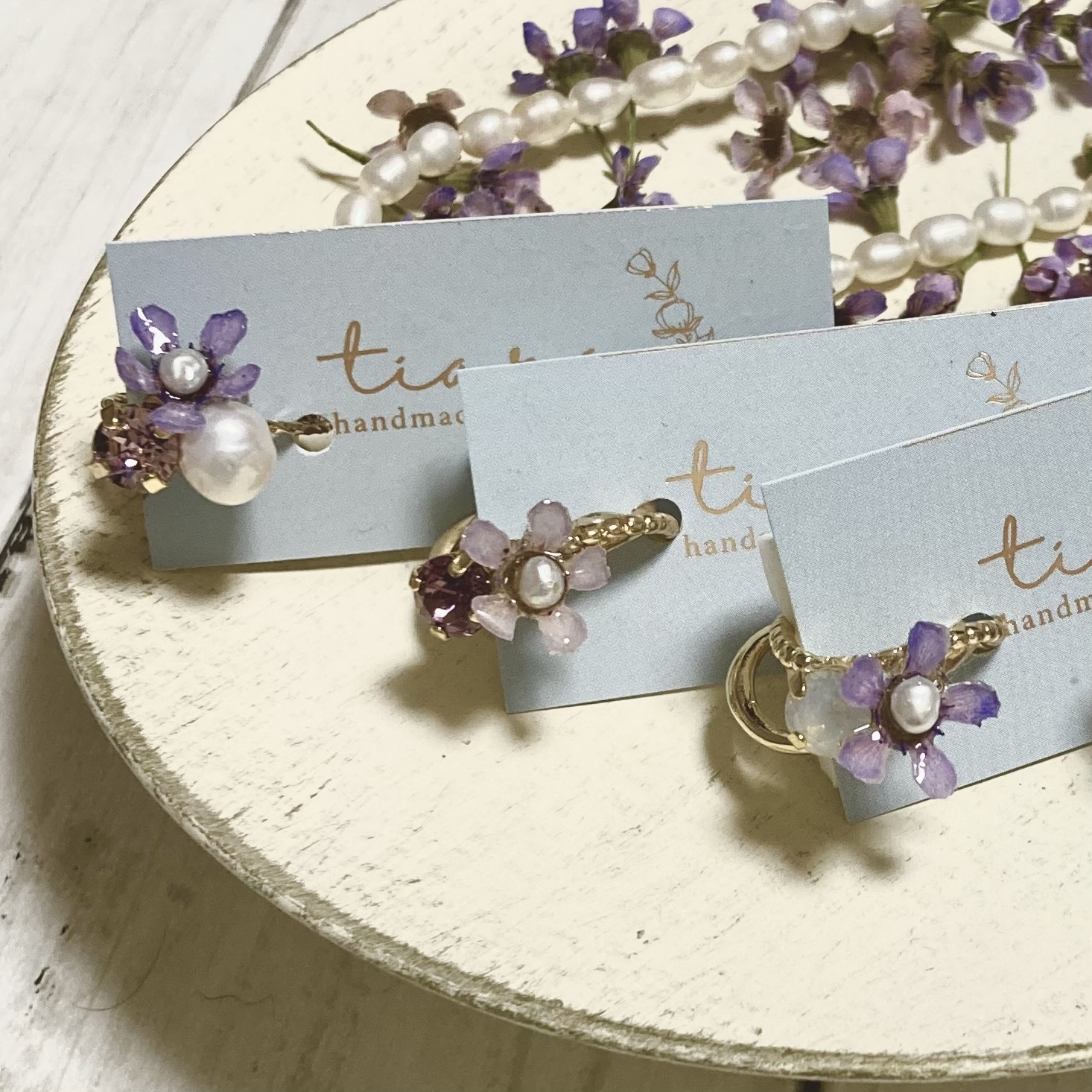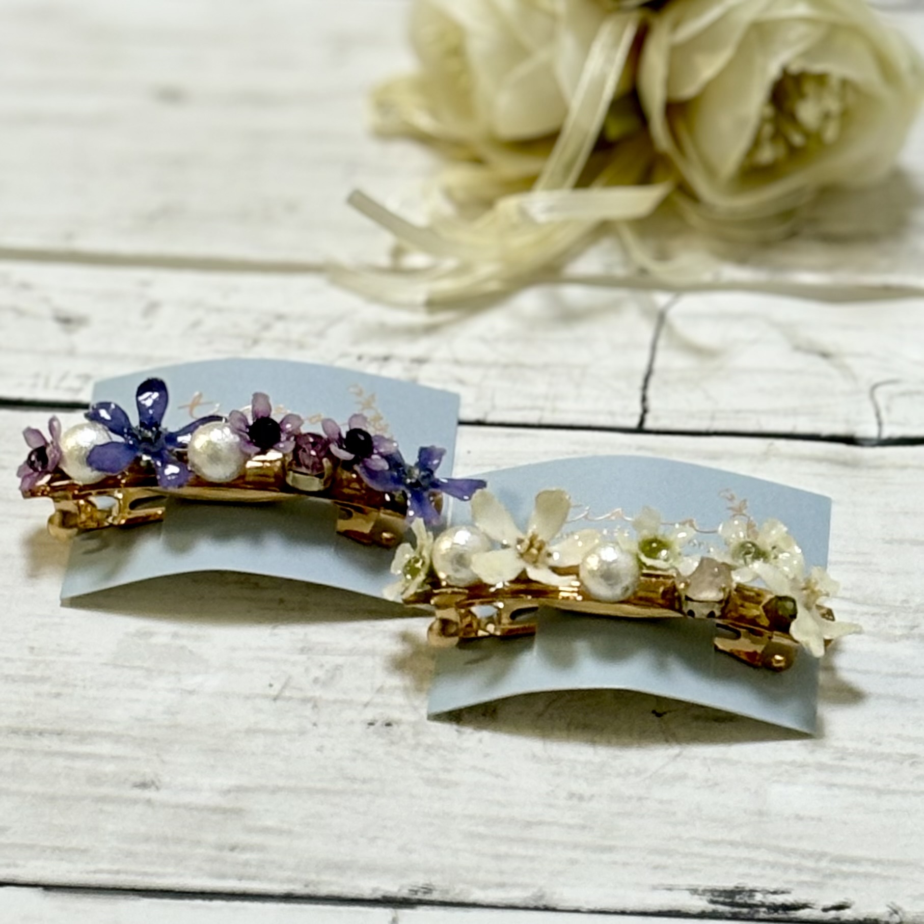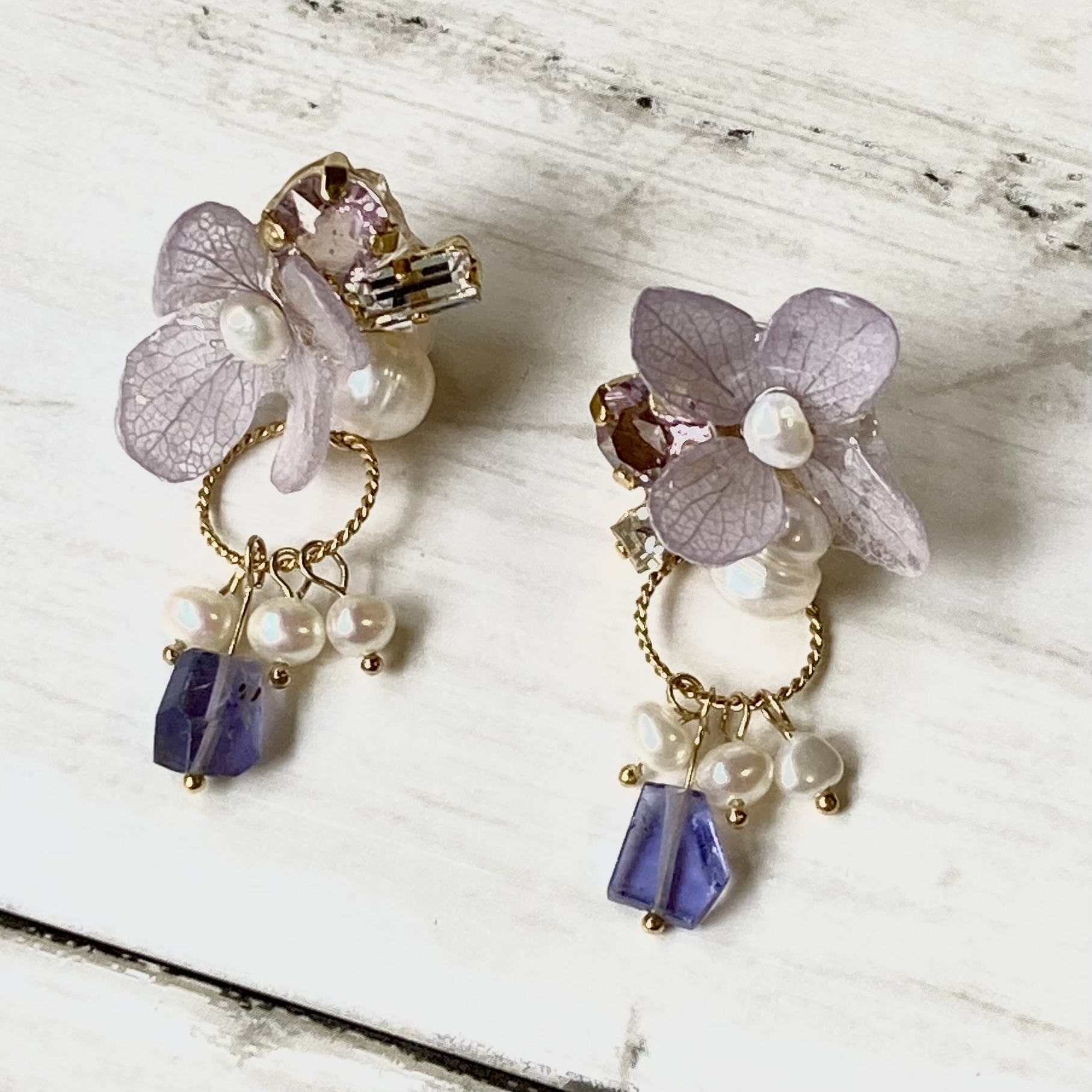 本物のお花を使用した、お花のアクセサリーです。 お花だけど、可愛すぎない。フェミニンで繊細な大人可愛いアクセサリーです。 お花の形をそのまま残してレジンでコーティングし、クリスタルや、淡水パールなどを合わせて、ピアスやイヤリング、イヤーカフなどに、仕上げています。 レジンの中にお花を閉じ込めたヘアクリップなども、人気です。