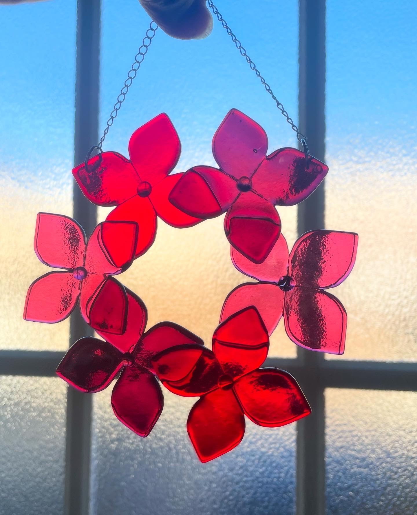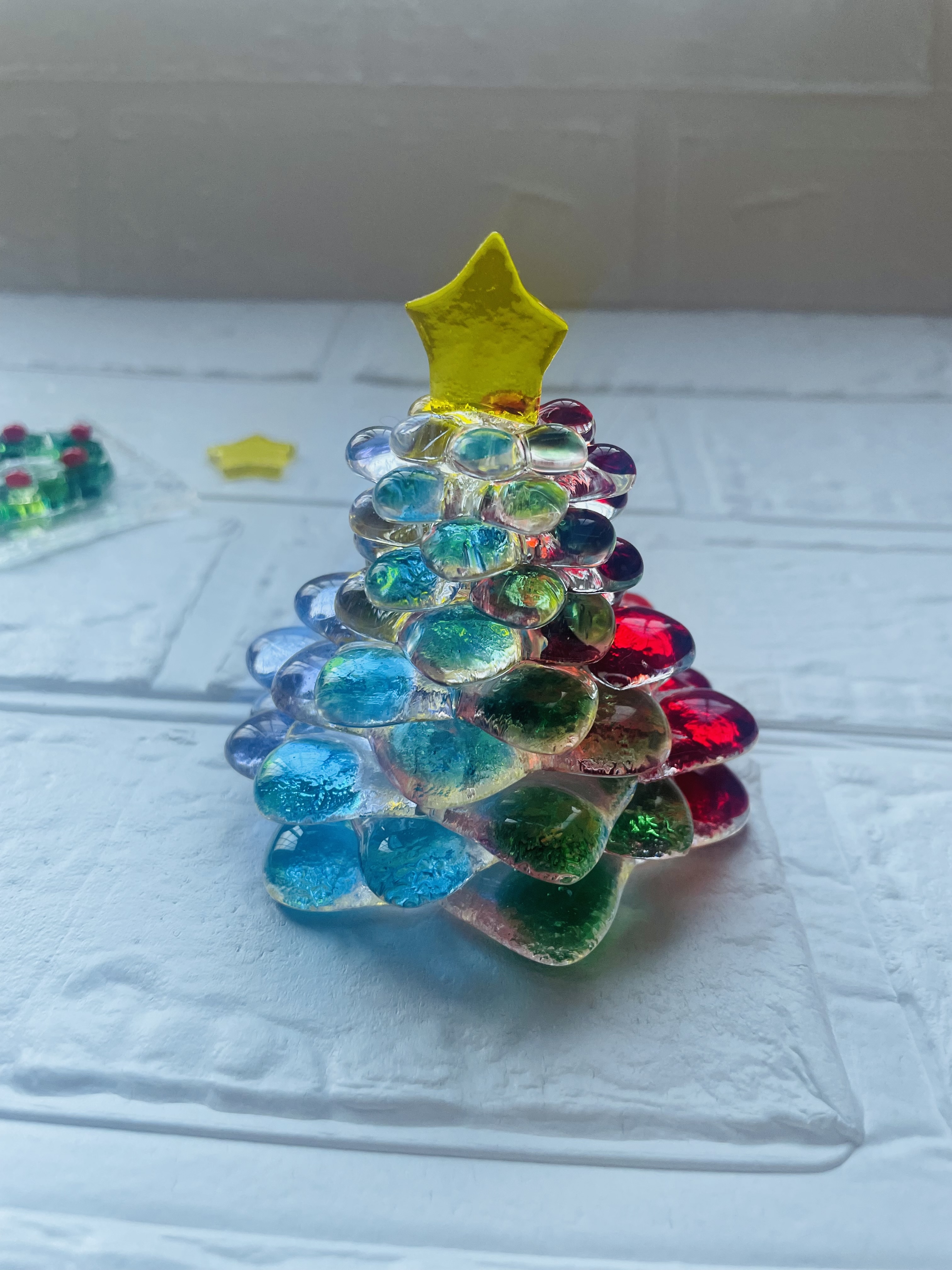 ステンドグラスに使うカラフルなガラスをカットしてお皿や、リース、アクセサリーを作っています。光が当たるとキラキラ輝きます。