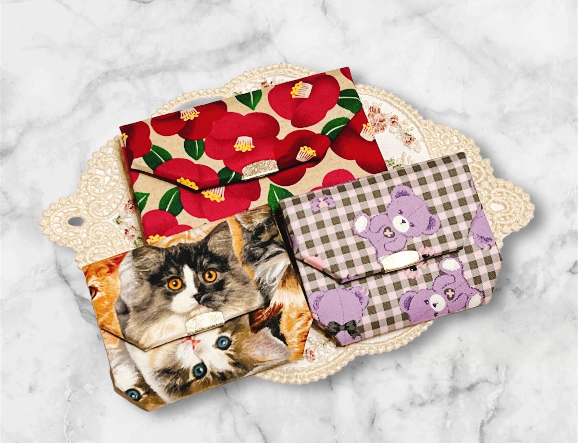 カラフルで鞄の中でも見つけやすいコインケースと猫だってお洒落したいの気持ちで作った猫のつけ襟、推し活のトレカケースやインド刺繍を使ったストラップ等を販売しています。