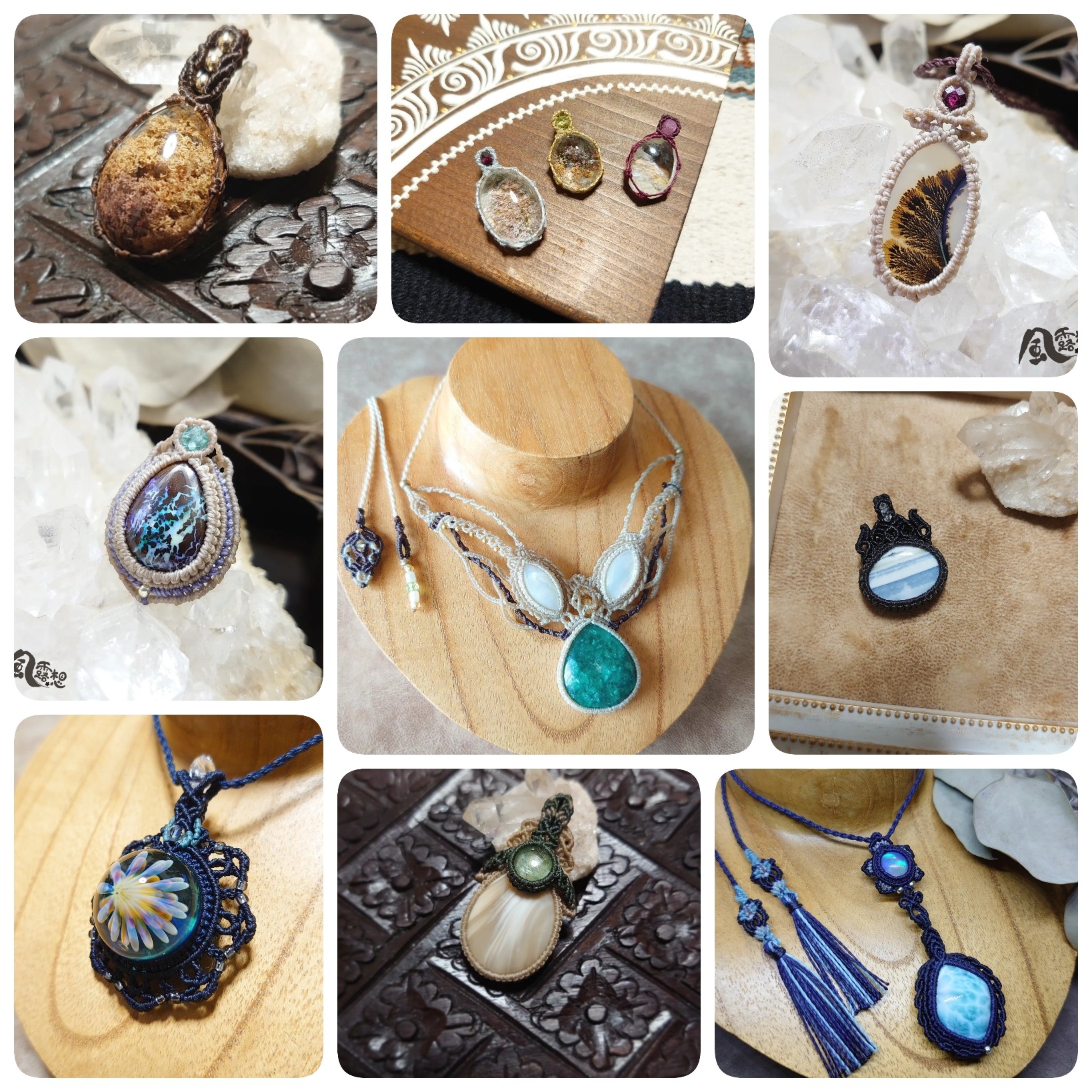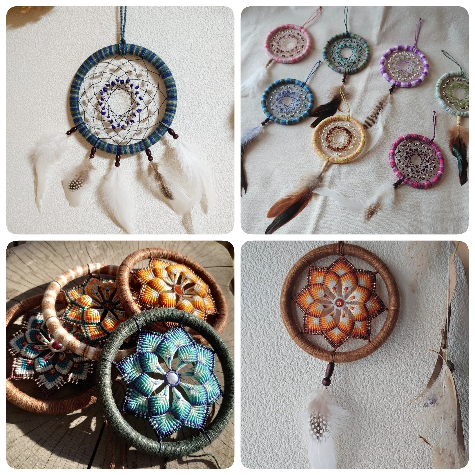 マクラメという手芸技法で天然石やガラスをアクセサリーに仕立てています。ドリームキャッチャーも全て手作りで製作しています。