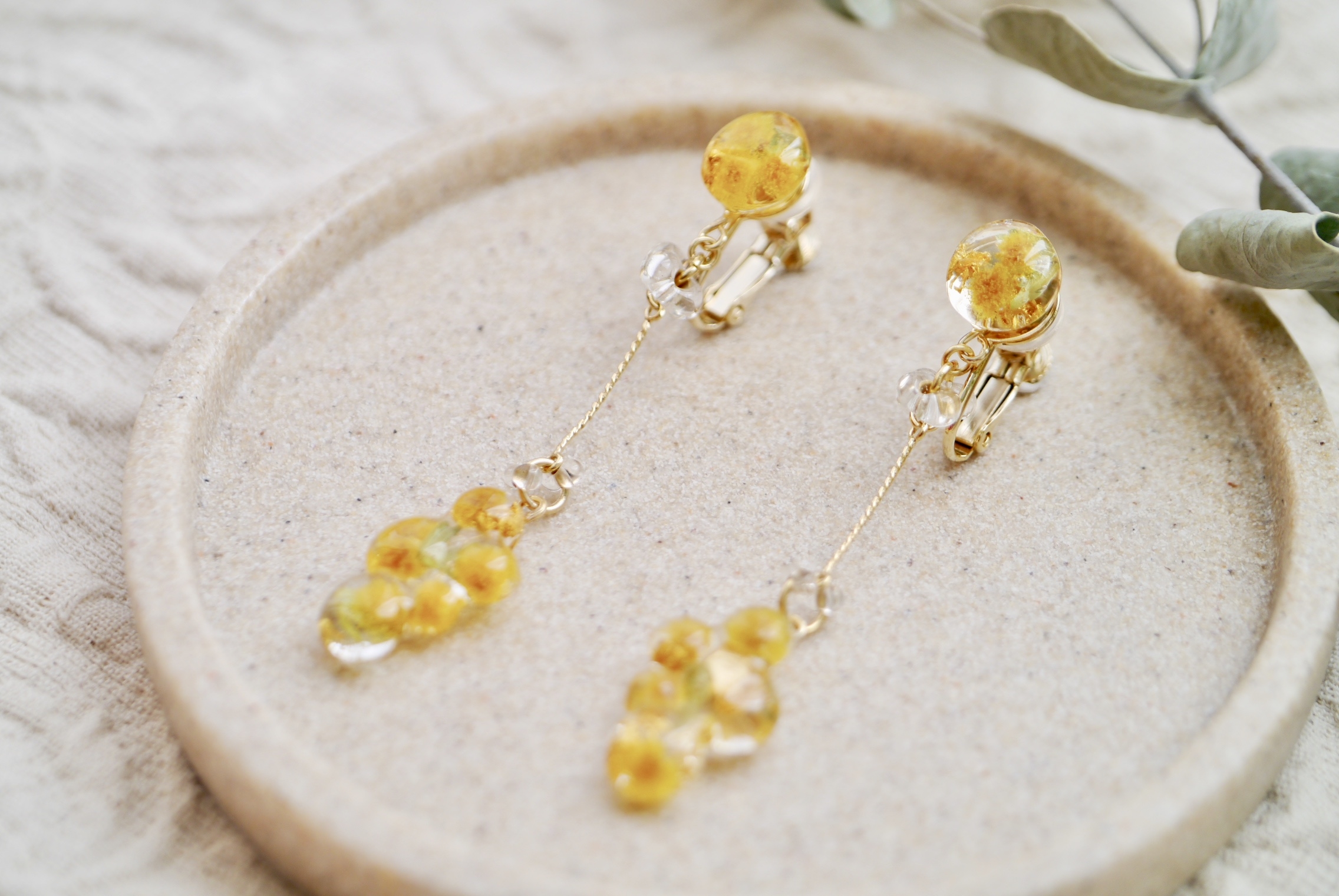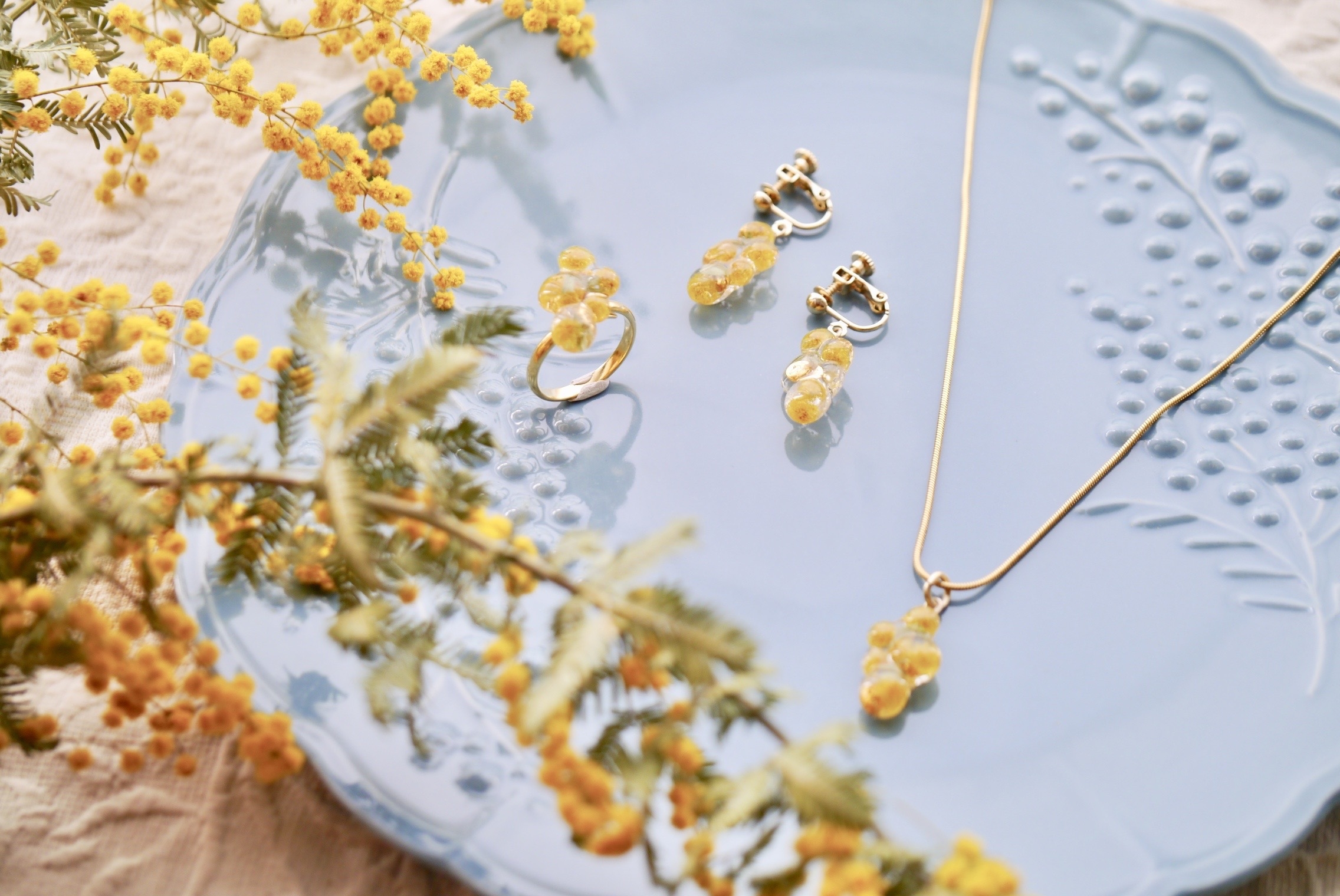 ミモザ専門のアクセサリーを作っています。本物のミモザのドライフラワーを使ったレジンアクセサリーを販売します。 ミモザは気泡が入りやすく、よりミモザの魅力が伝わるよう綺麗に作ることを心がけています。