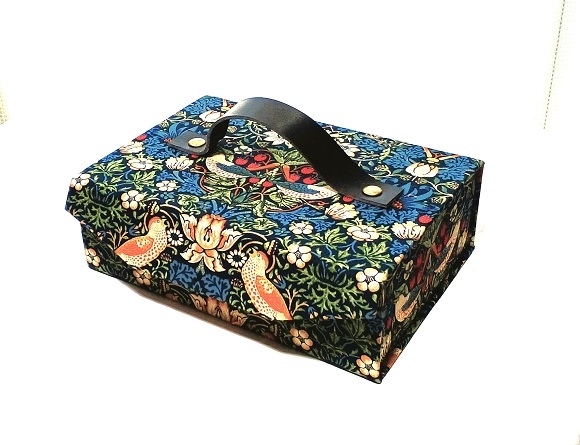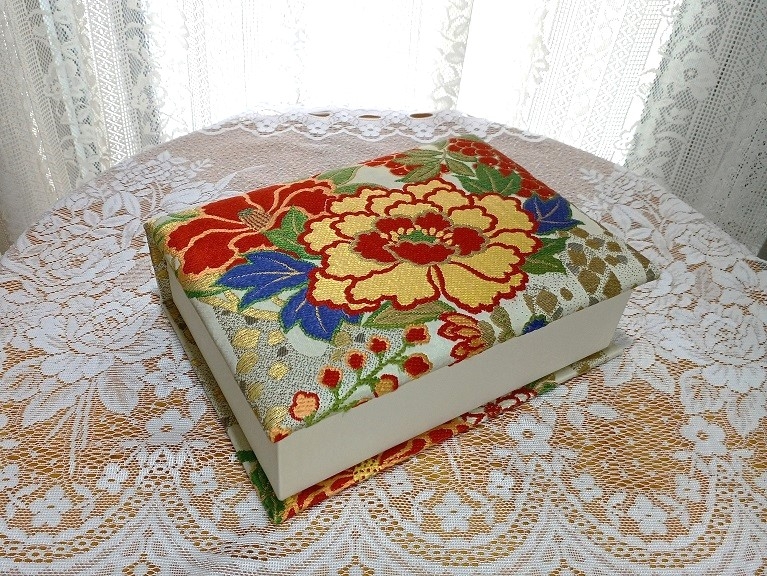 4.蝶つがいを作って背を貼り、箱底・ふた裏を布で包み貼り合わせて完成です。