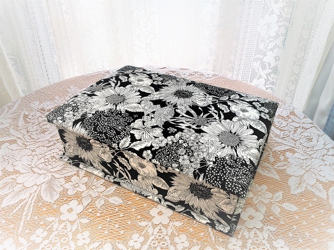 3.表布に接着しんを貼り合わせ、カットした表面・背・底面のカルトンを置いて包みます。