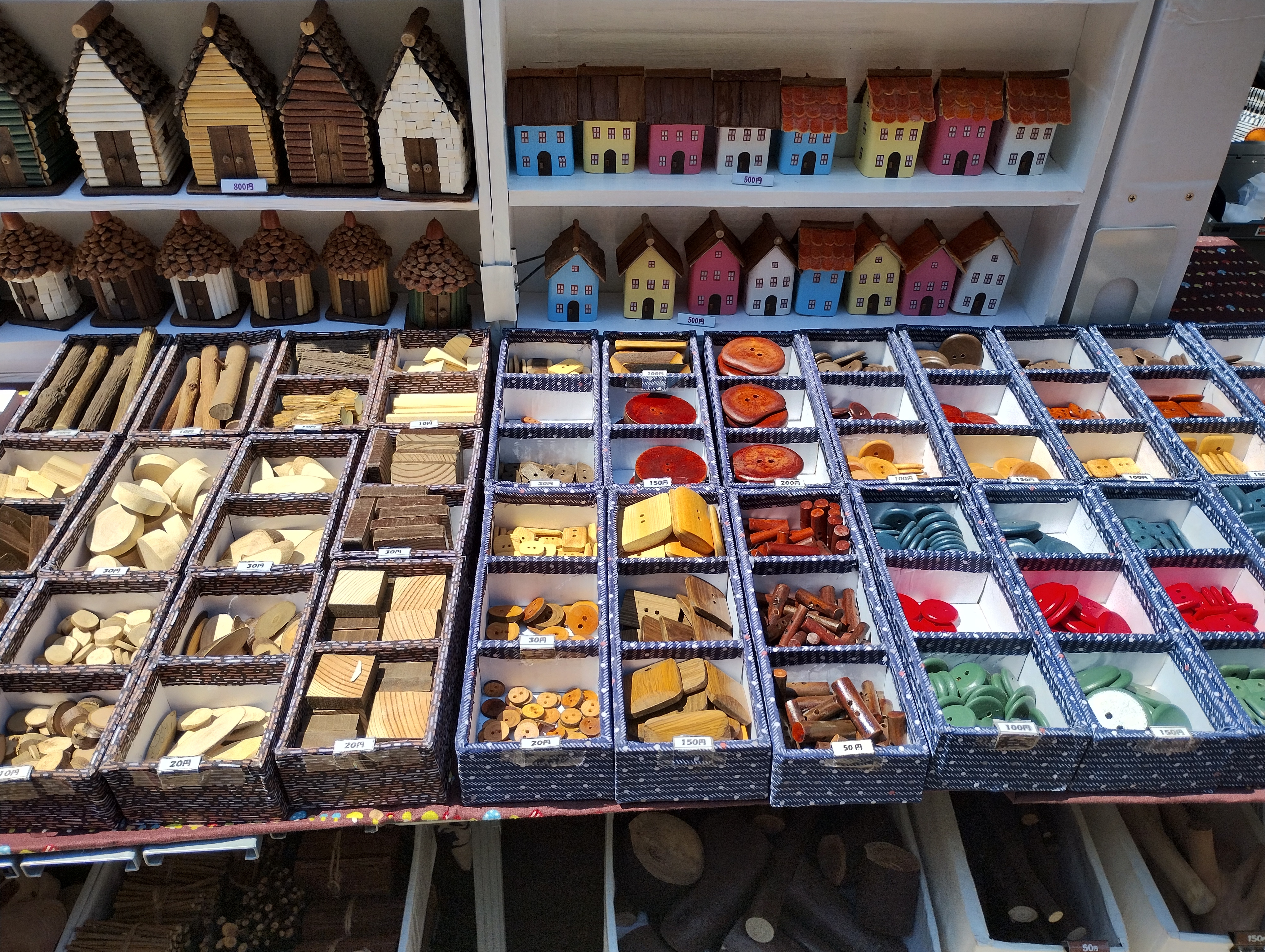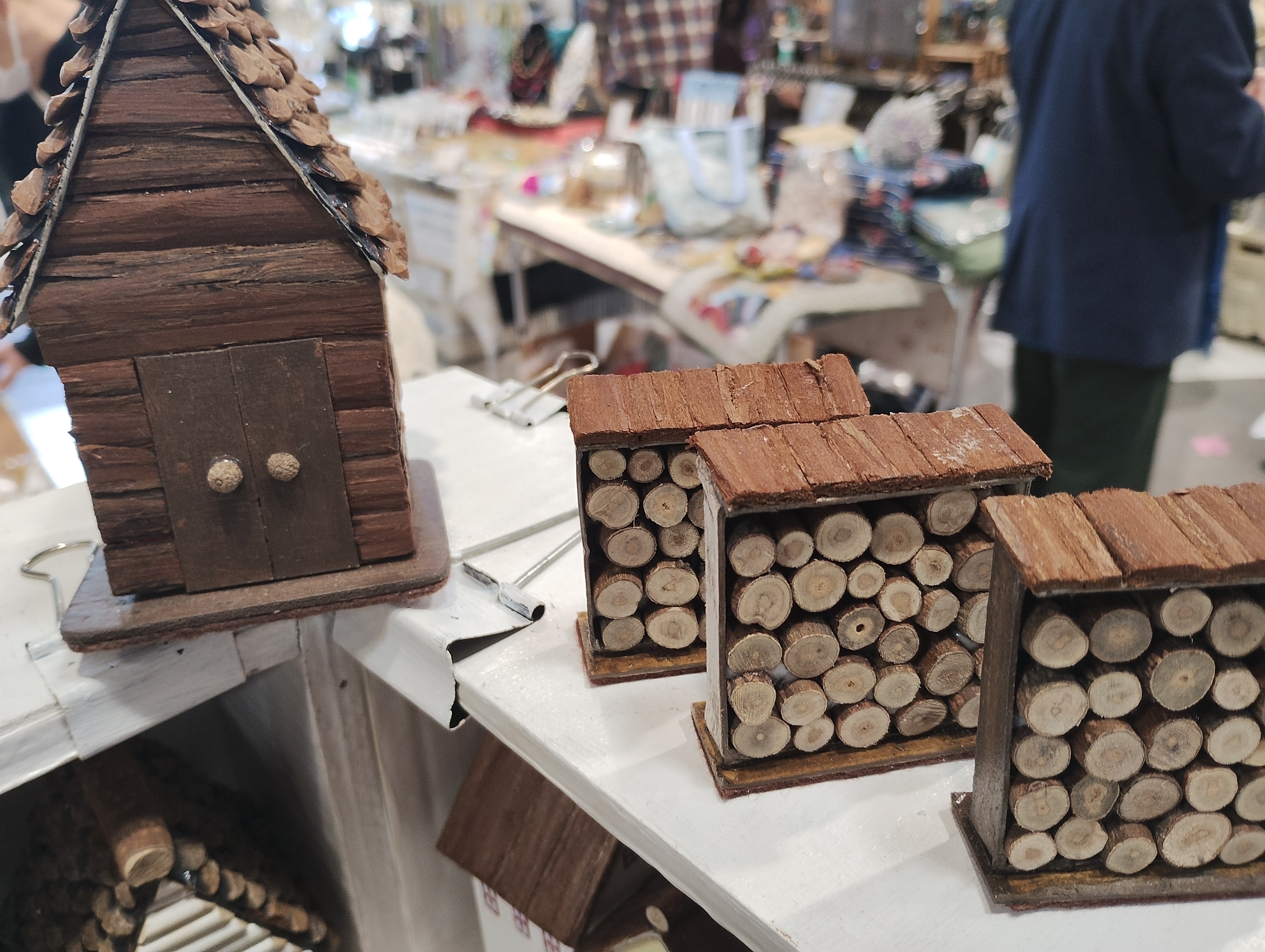 自然の枝や竹・空き缶・トイレットペーパーの芯などを使ってつっくたミニチュアハウスなど、枝や竹から作ったボタンやアクセサリー