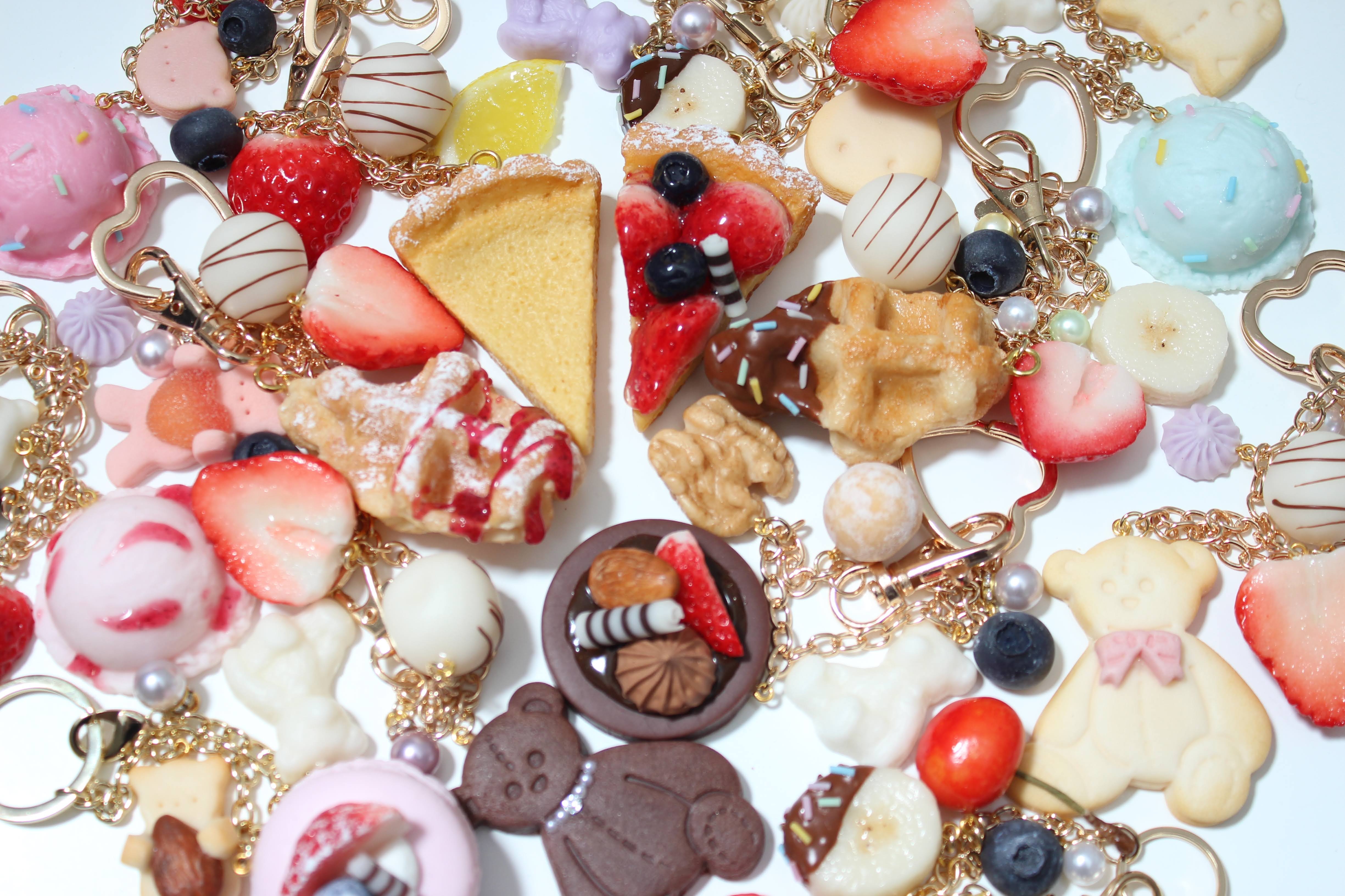 粘土で作った本物そっくりの可愛いスイーツ雑貨!15種類以上の粘土を使用し、質感にこだわったフルーツやお菓子を制作しています。キーホルダー、バッグチャーム、ヘアアクセサリーなど子どもも大人も幅広く使えるアイテムを種類豊富に取り揃えております。独学で作り続けて13年。試行錯誤して作り上げた世界にひとつだけの食べられないスイーツを是非お楽しみ下さい。