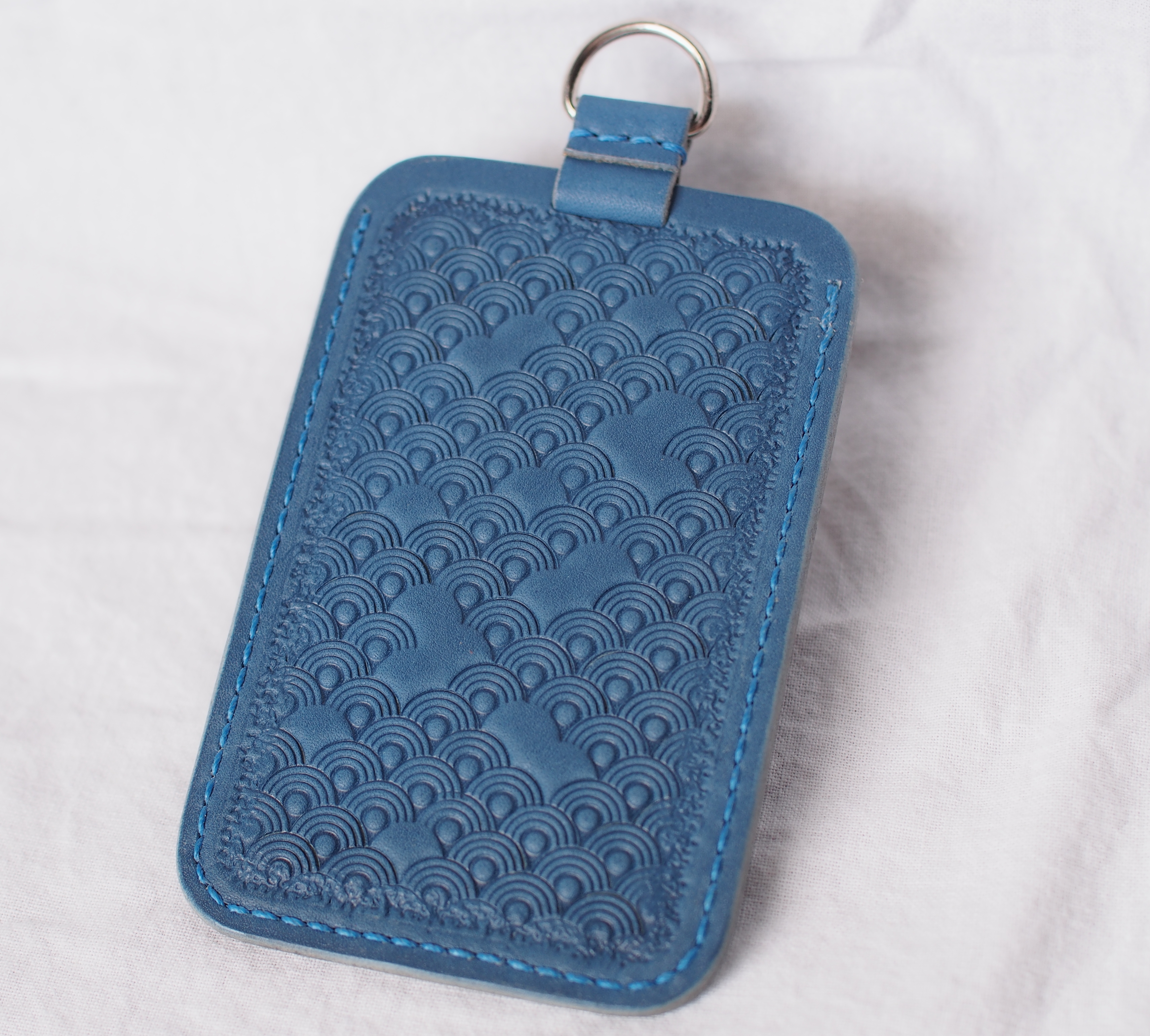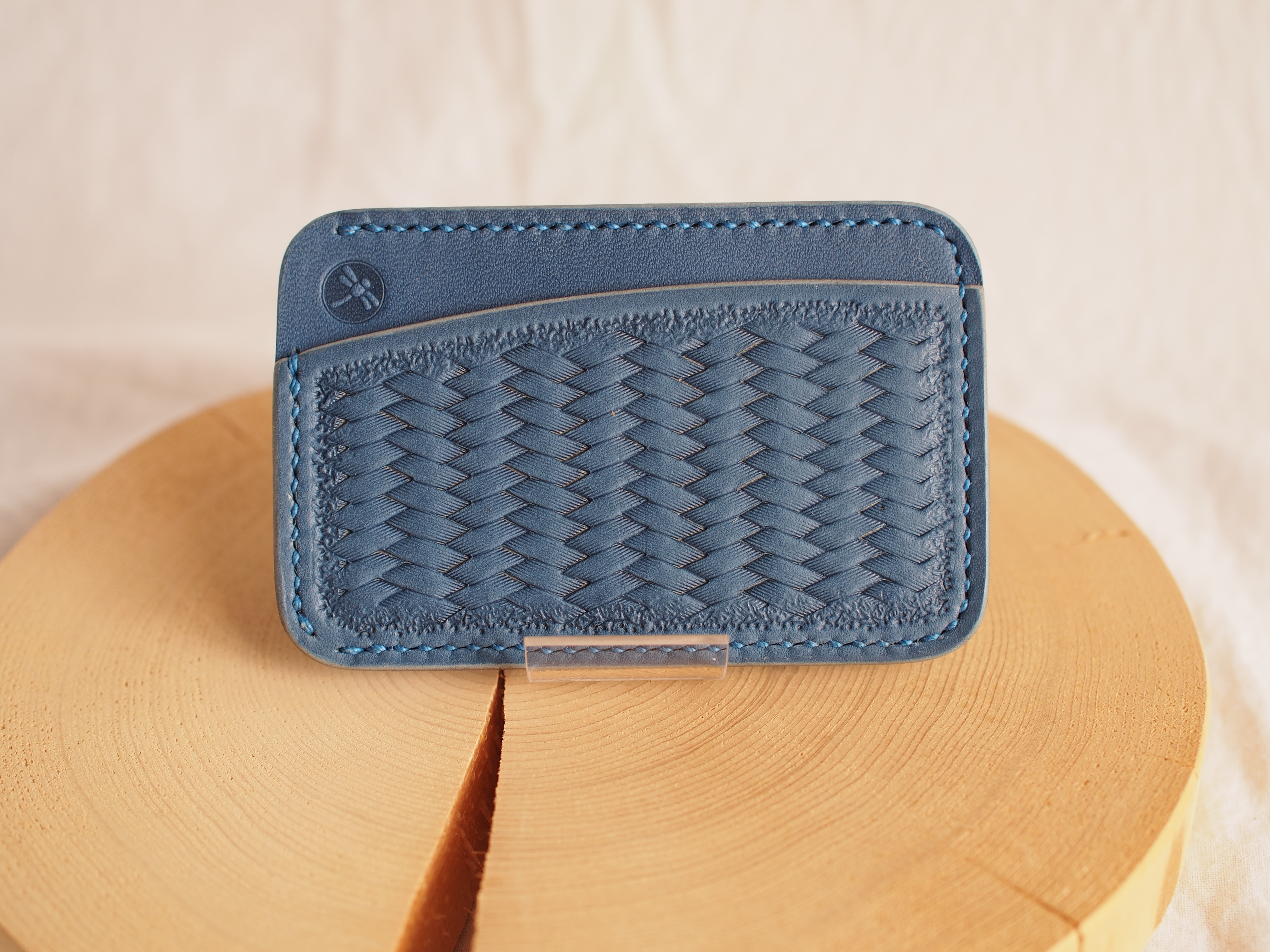 タンニンなめしの革に刻印を打ち、日本古来の伝統紋様を描いた革小物の展示販売