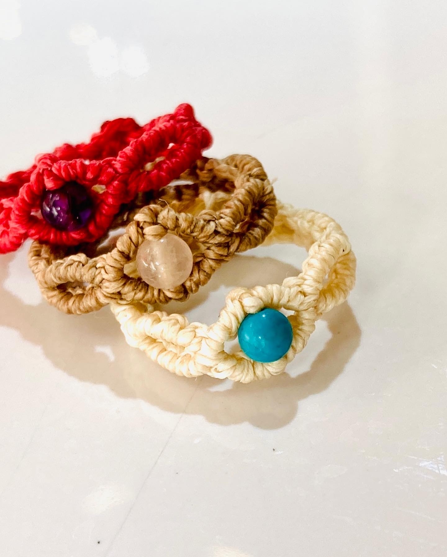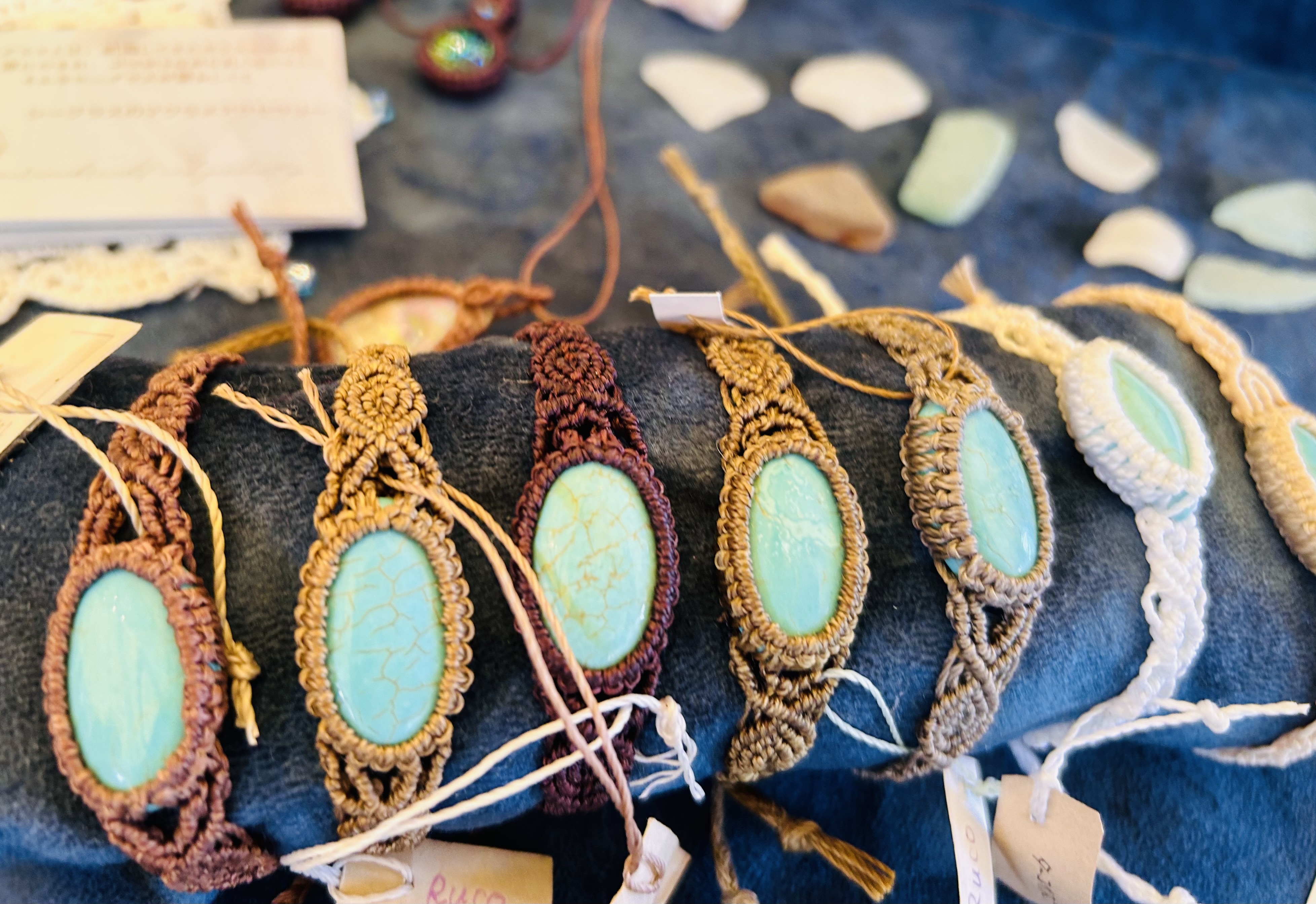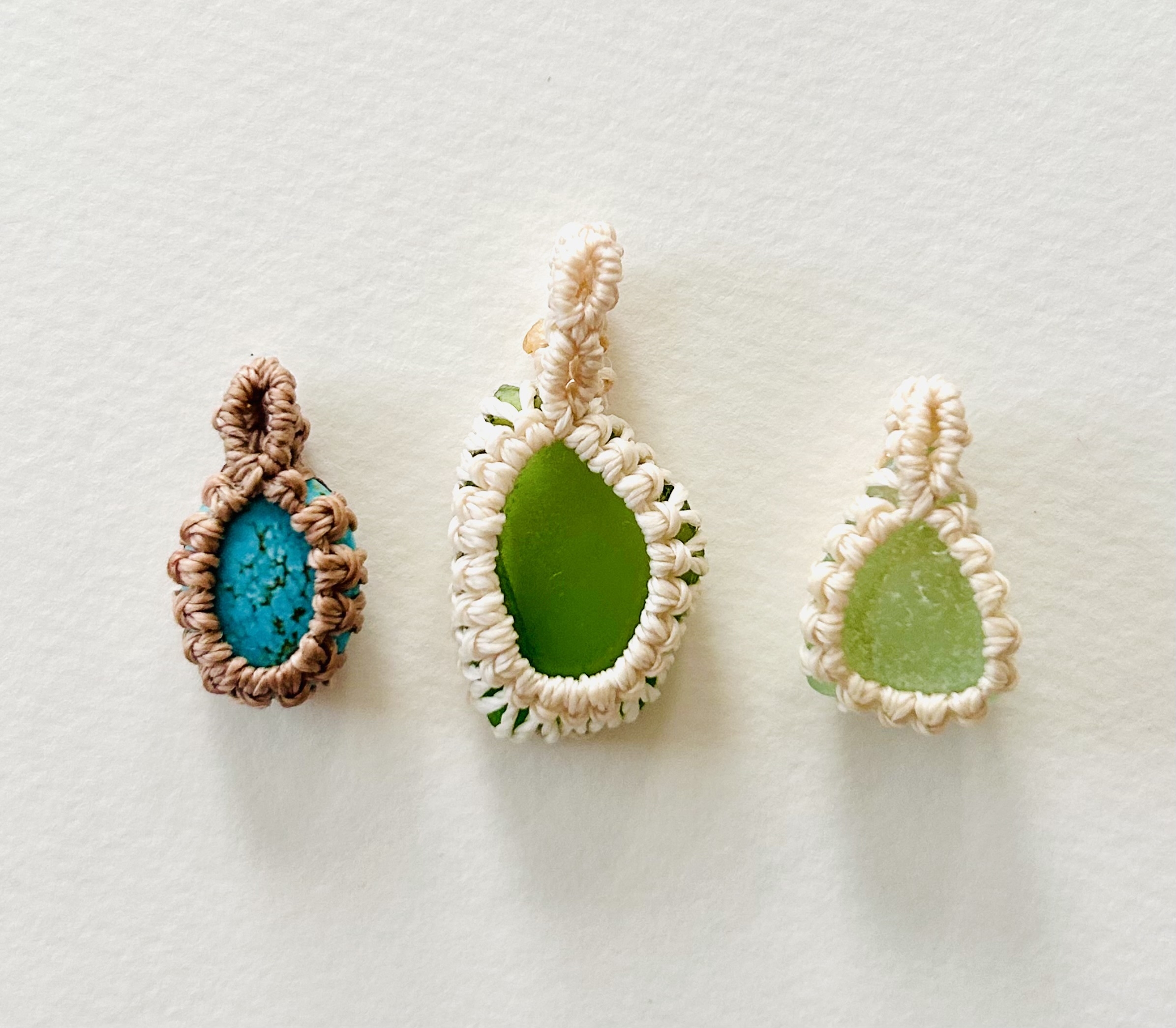 ビーズのキラキラつぶつぶが好き。それを組み立てたものや、天然石やシーグラスをマクラメで囲ってアクセサリーにしてます。全てわたしが作った手づくり