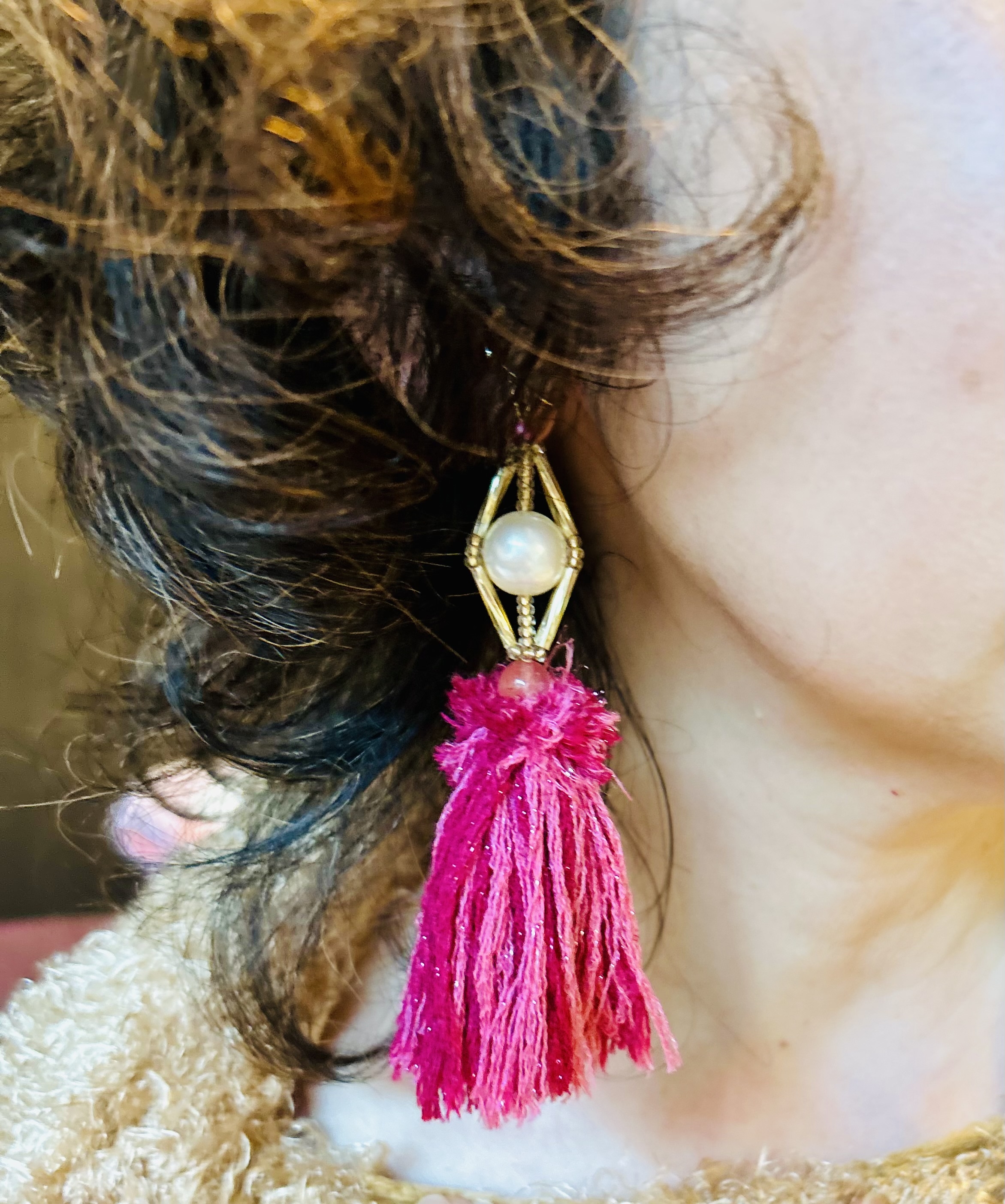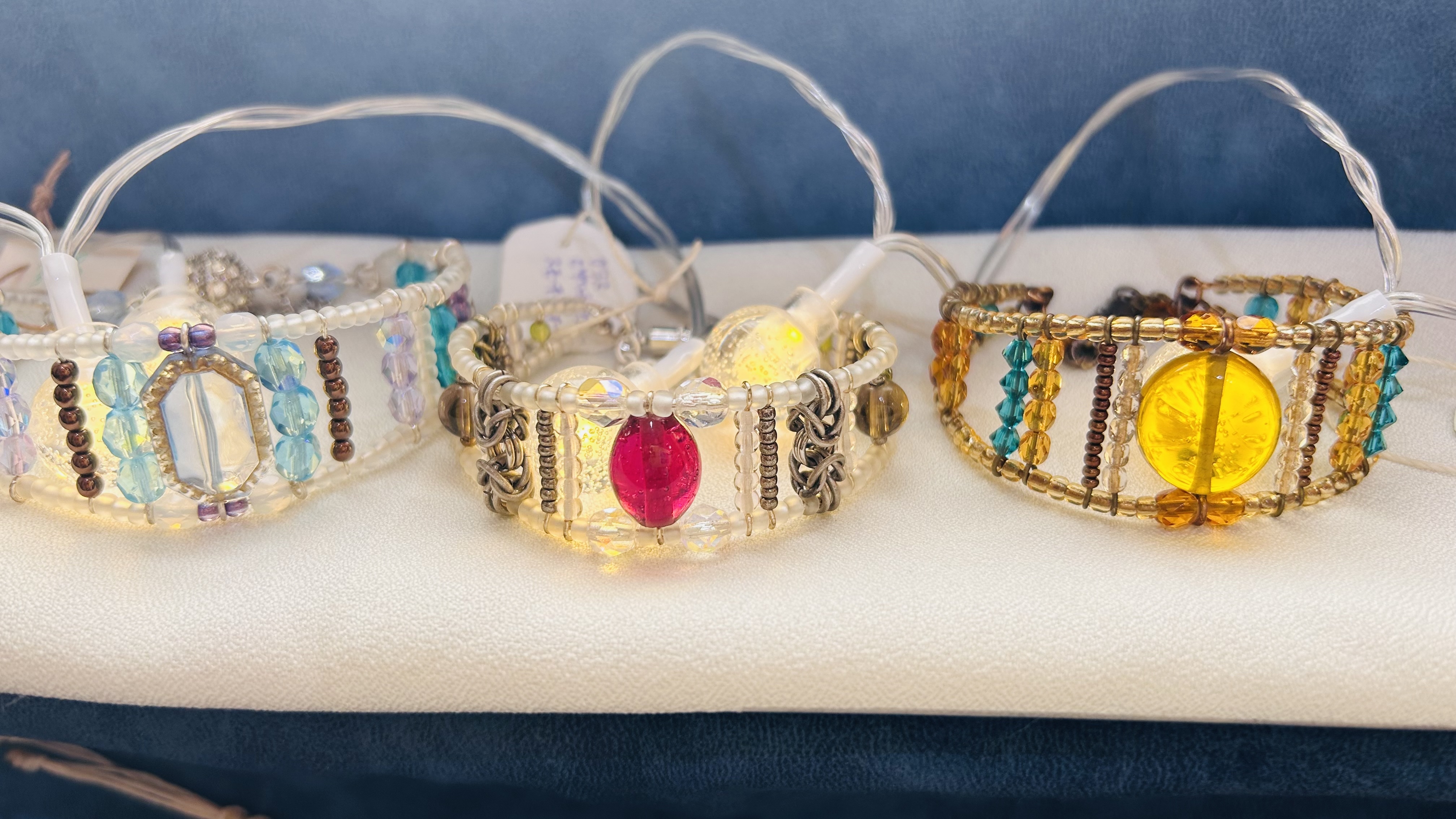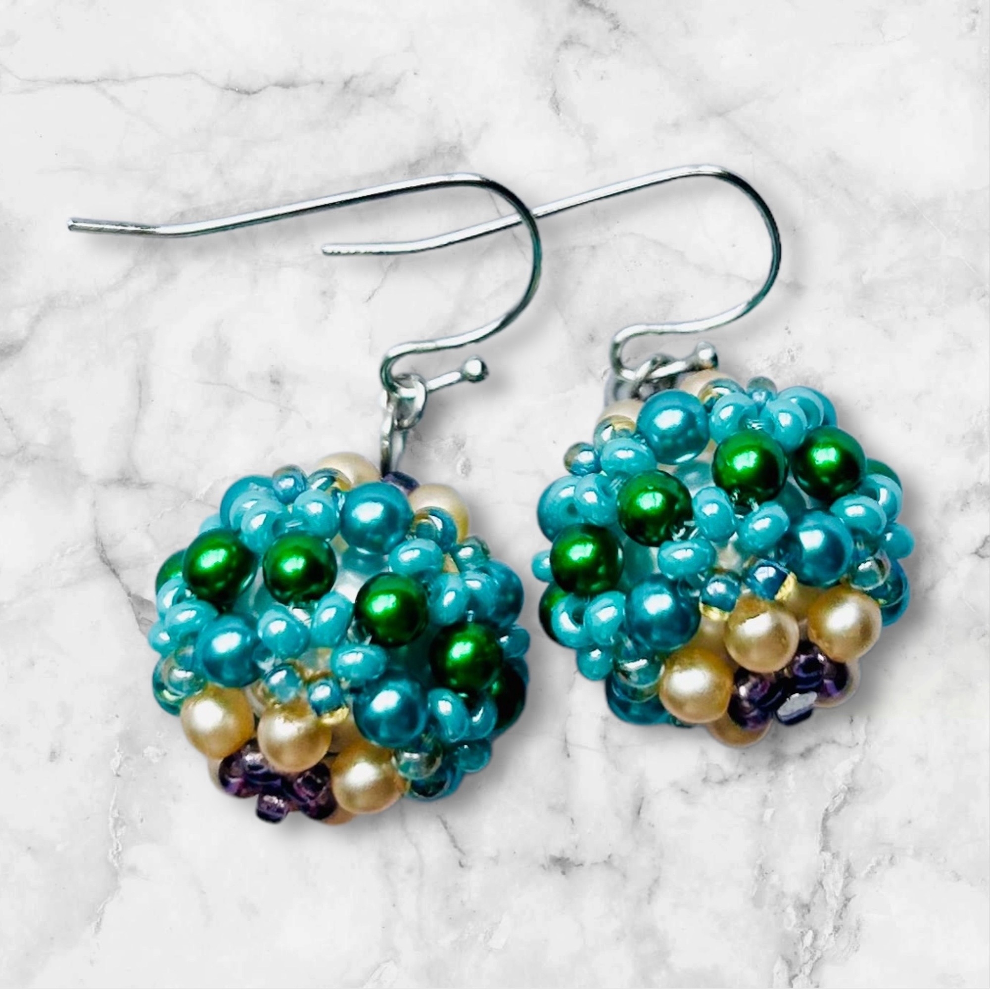 ビーズのキラキラつぶつぶが好き。それを組み立てたものや、天然石やシーグラスをマクラメで囲ってアクセサリーにしてます。全てわたしが作った手づくり