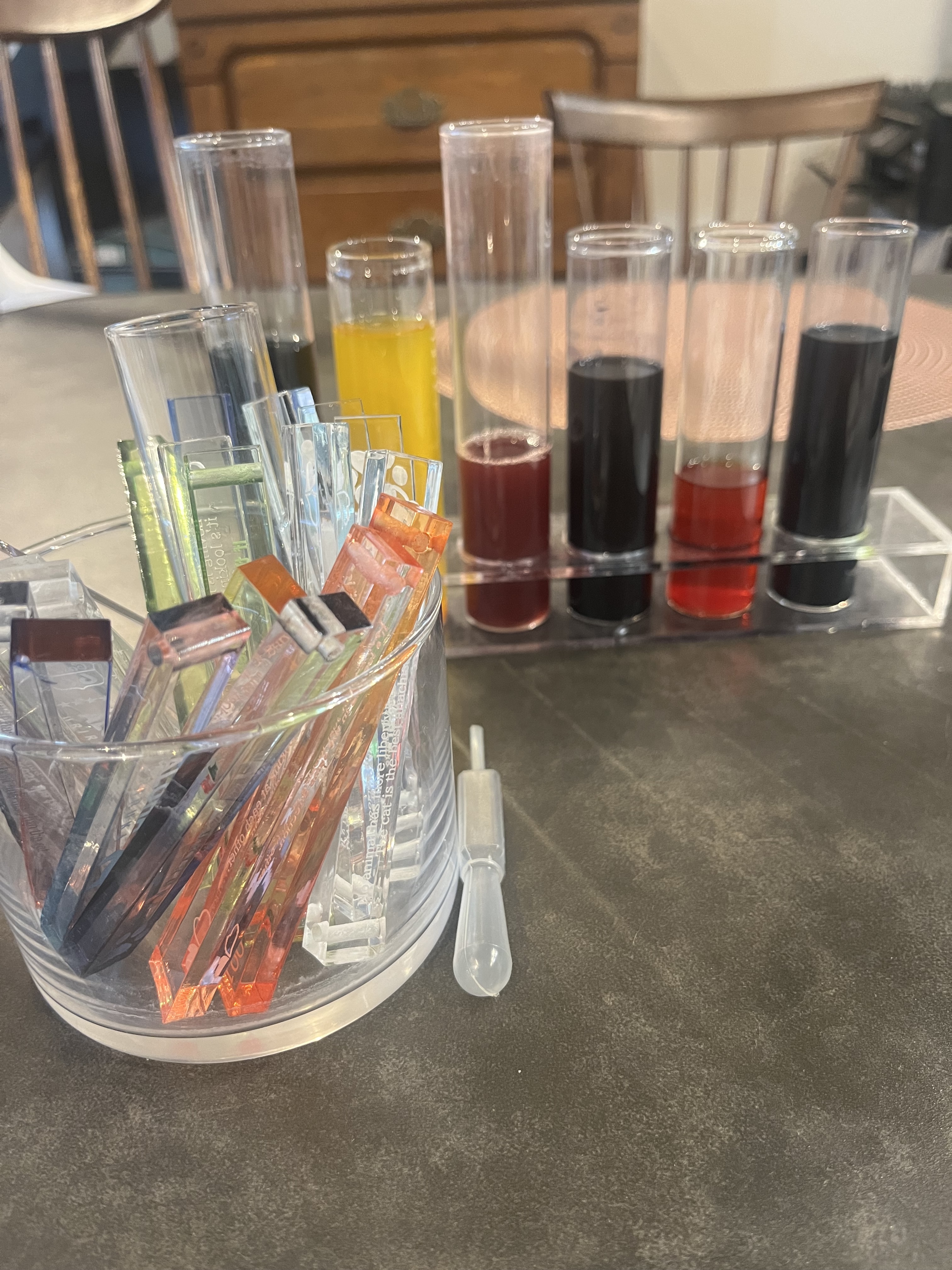 お好きな色を2色選んで頂き、温めた染色液に漬けてアクリル鍵棒を染めていきます。
