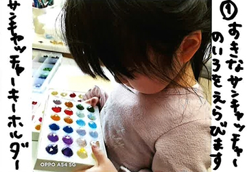 【サンキャッチャーのキーホルダー】①パーツを選んでキーホルダーにつける。【ステンドグラス風オーナメント】①好きな型を選ぶ。②好きな色を自由にぬる。
