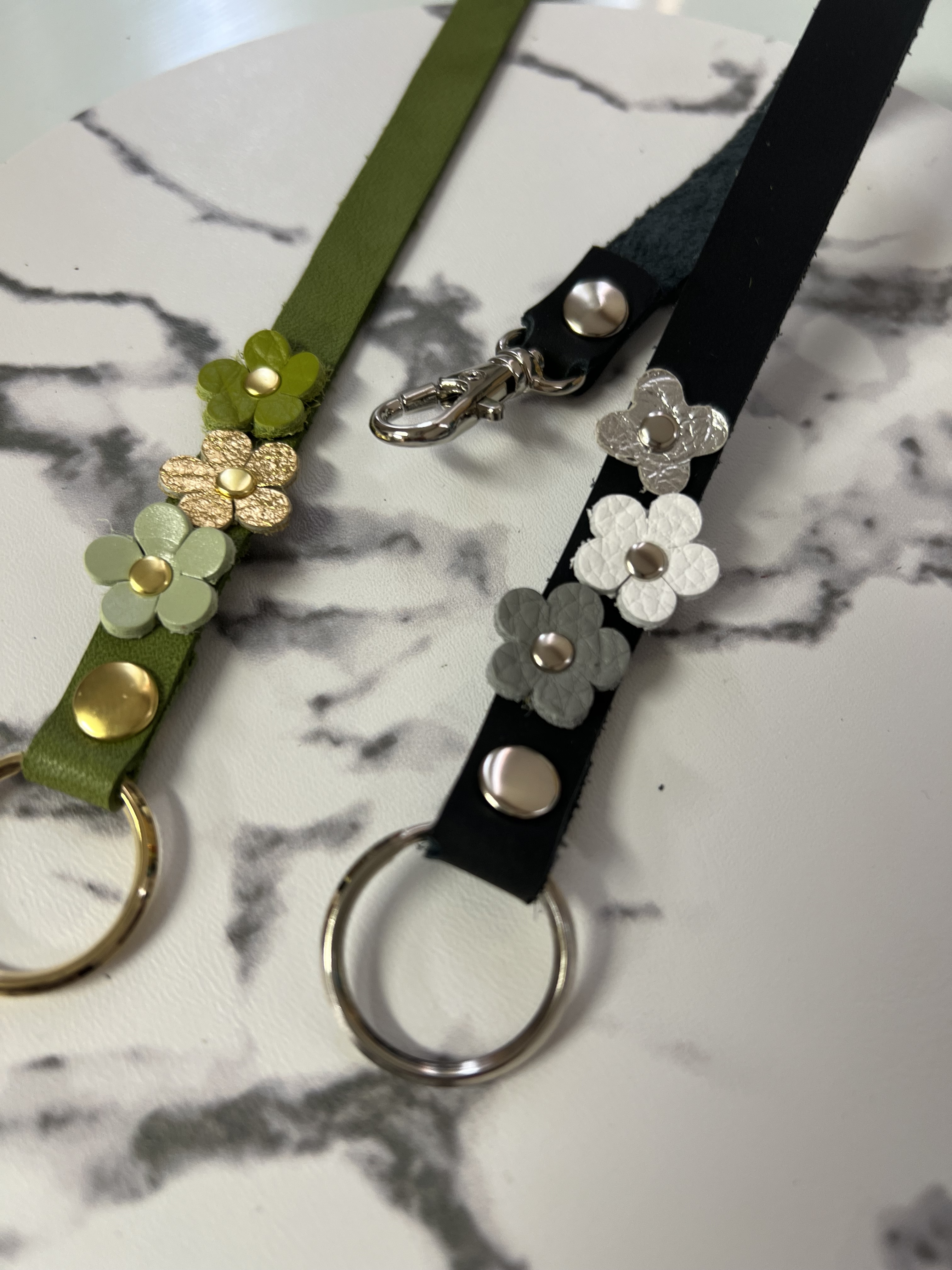 本革を使った革小物を作っています。可愛いアニマル柄の型押しや人気のシボ型のを使ってポーチやキーホルダーなど実用的な商品を多く作っています。お好みでお花のパーツやチェーンなどをその場で取り付けもいたします。