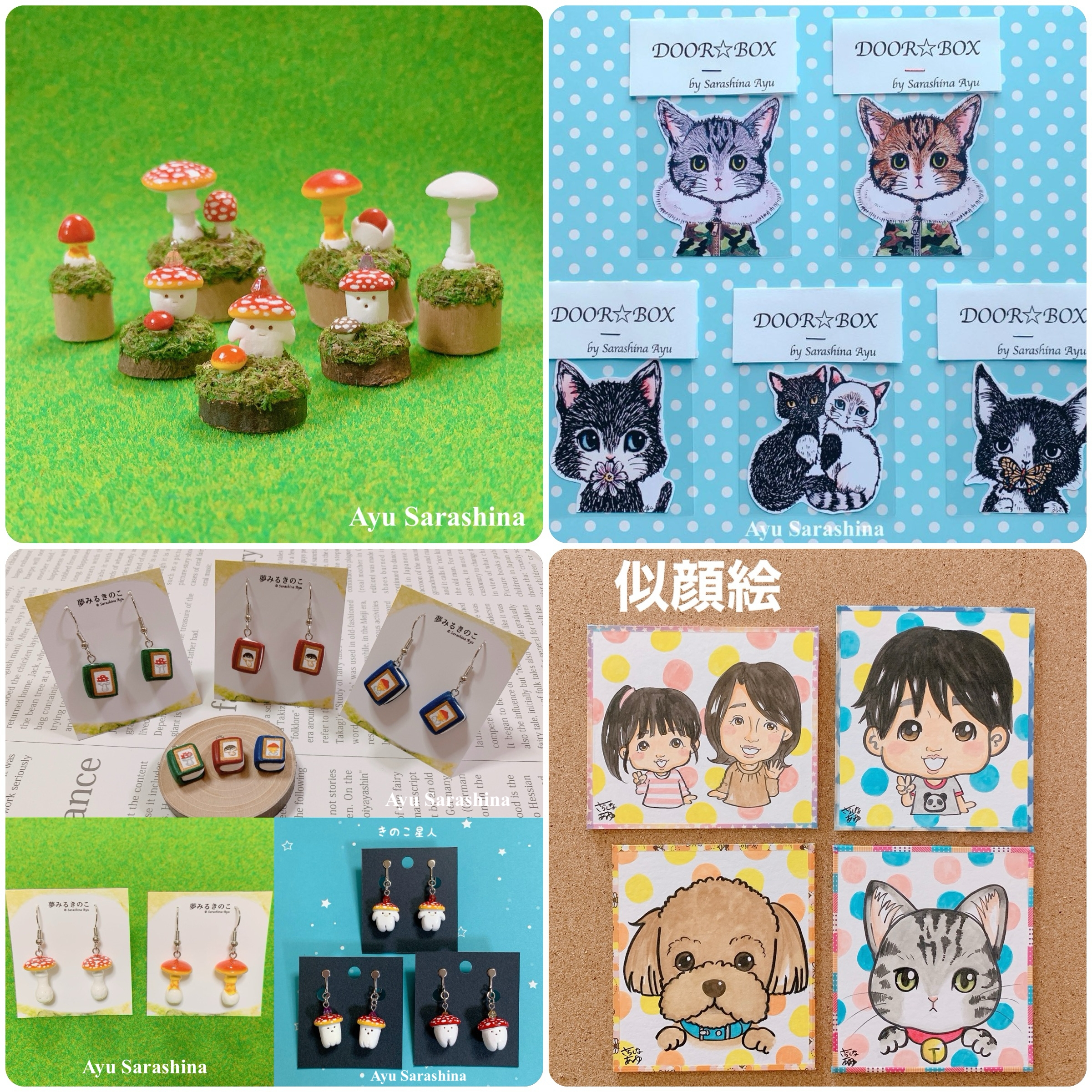 イラストグッズ、手作り雑貨、似顔絵描きの販売をします。 ポストカード、キーホルダー、シール等のグッズ。 樹脂粘土作品やピアス&イヤリングなど。似顔絵はお写真からもその場でお描きしております。贈り物や記念にもぜひ♪