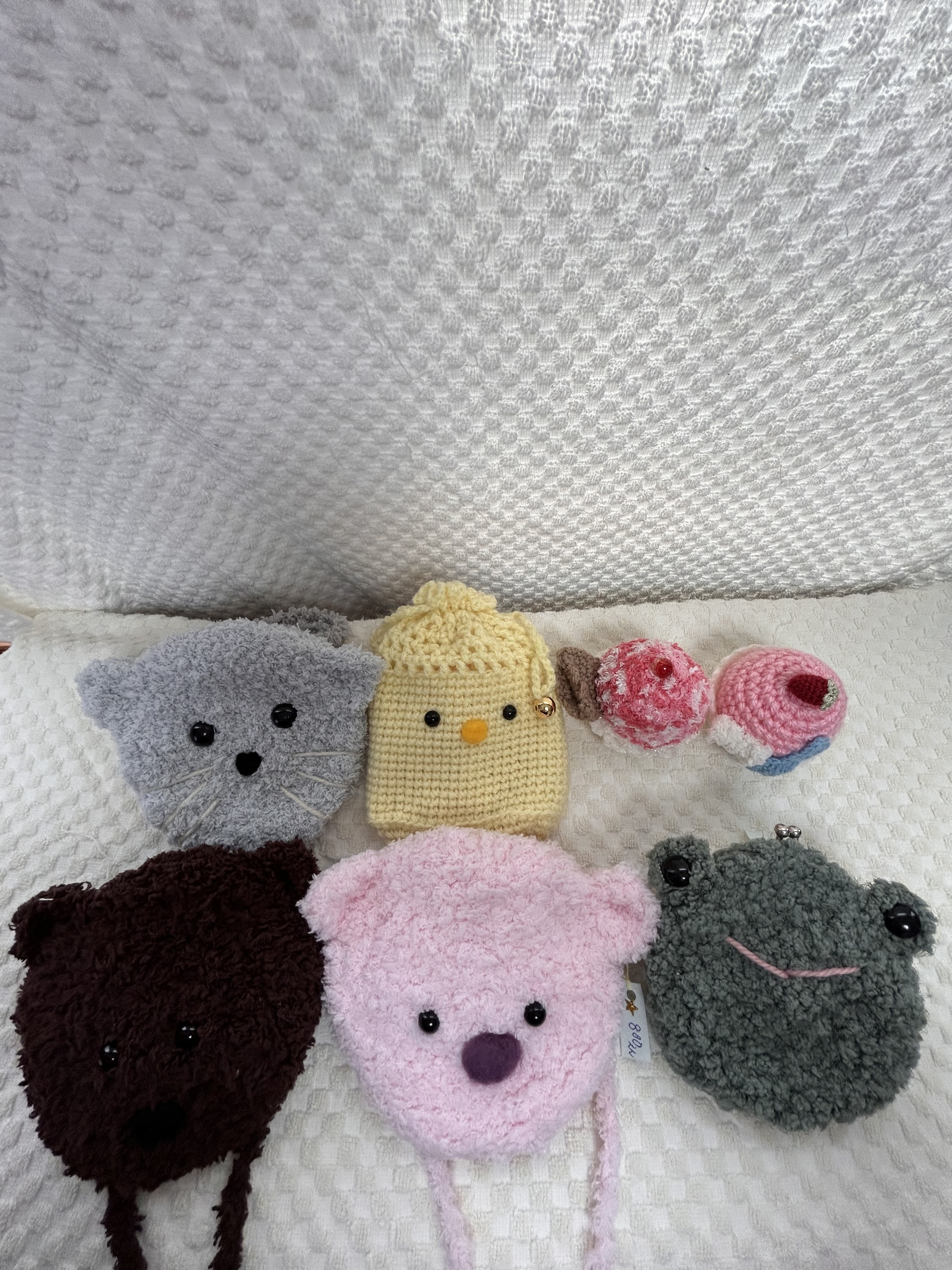ふっくらした毛糸で、ひよことかえるのマフラーや帽子小物も作っています。その他、色々な動物のポシェットや小物あります。 ほわほわで癒されること間違いなしです(^。^)
