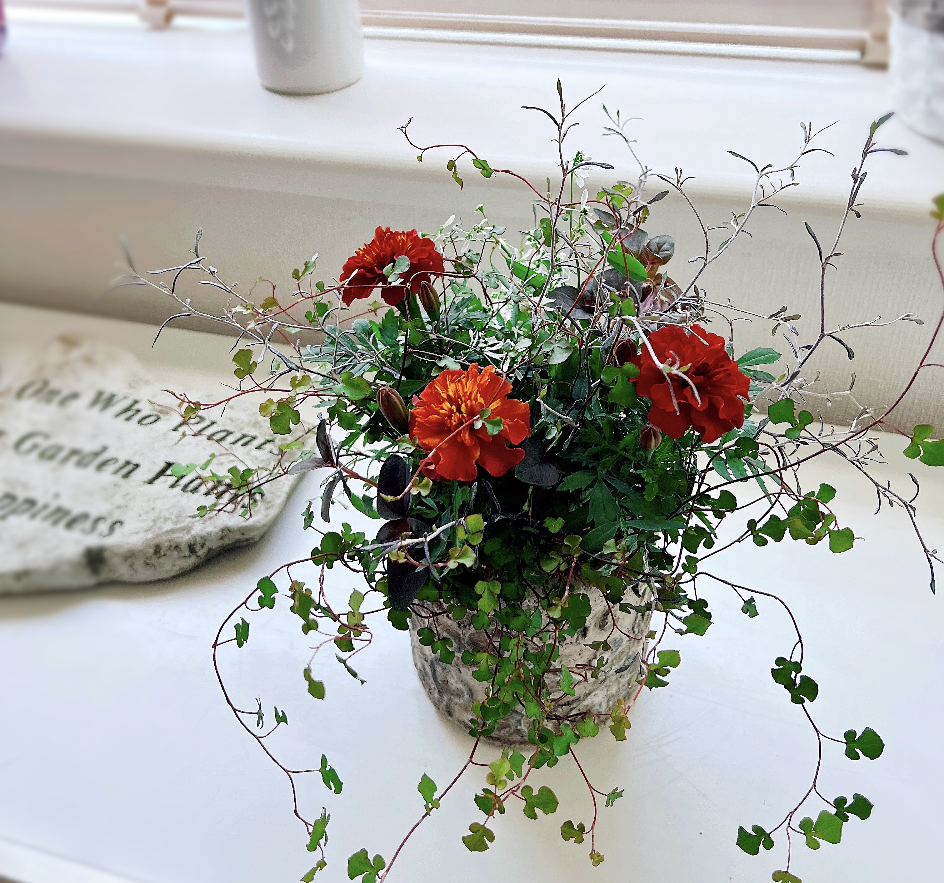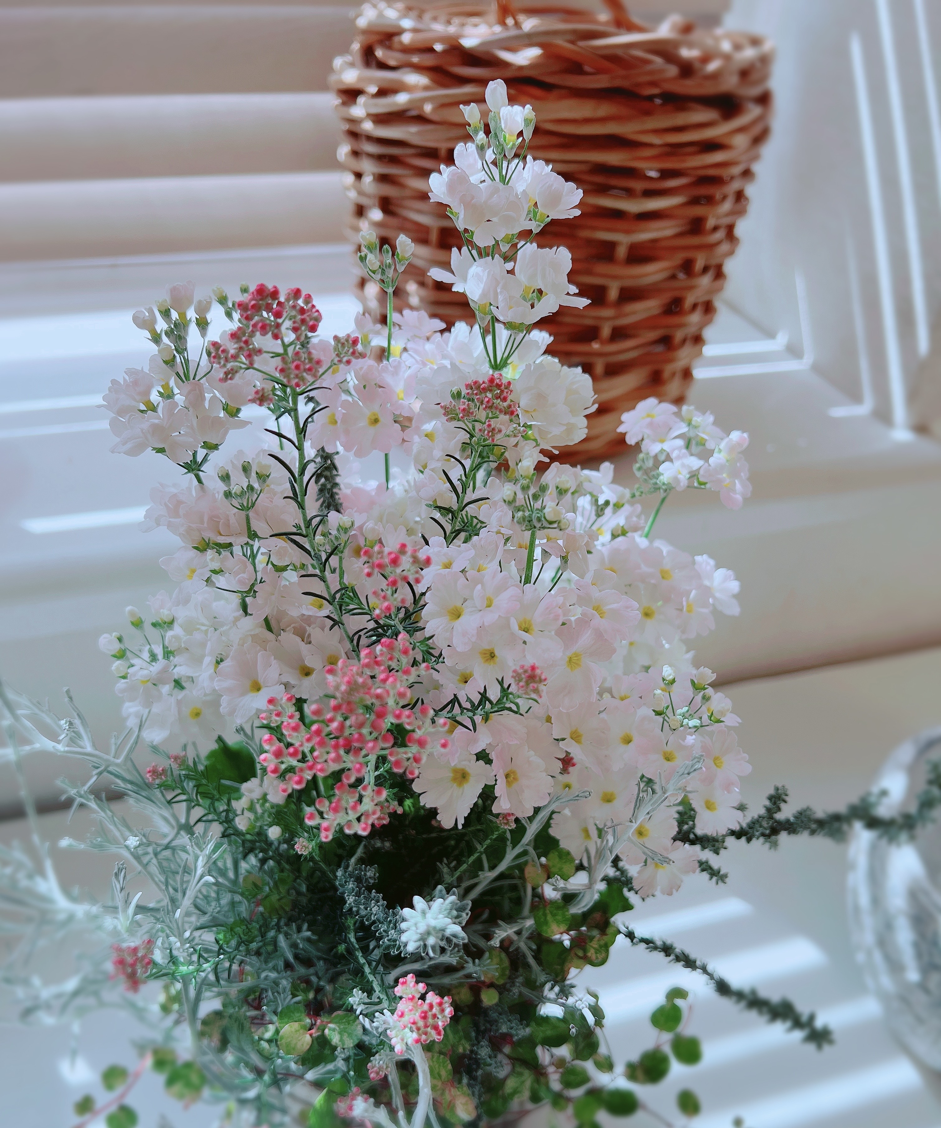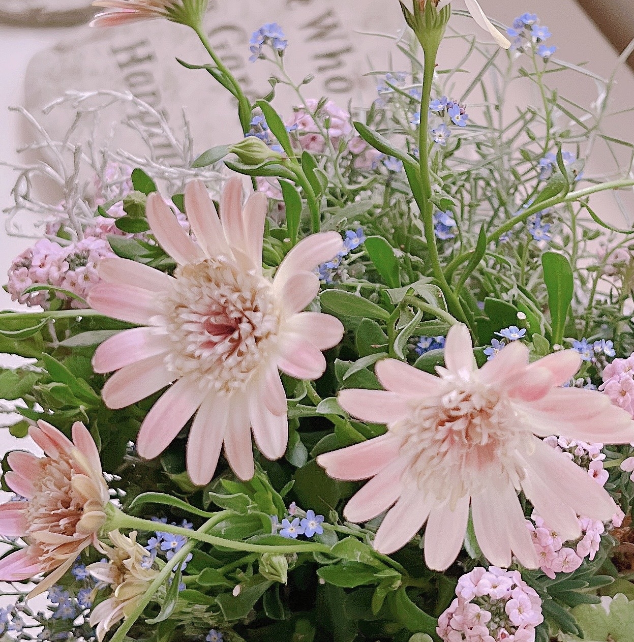 季節のお花とカラーリーフをアラログバスケットやアンティークポットに寄せ植えします。 根っこの着いた花苗を使いますので切り花よりも長い期間たのしめます。