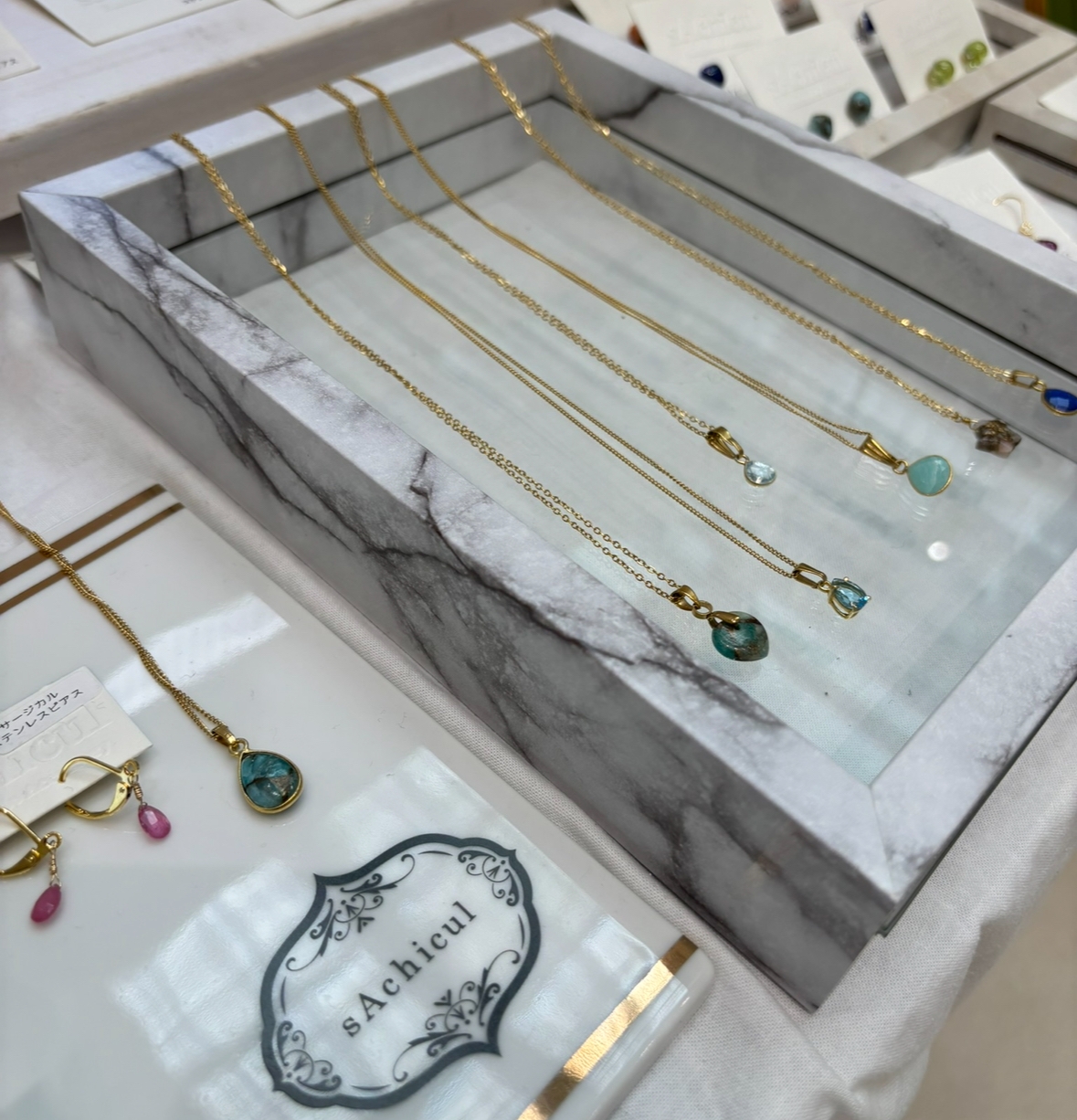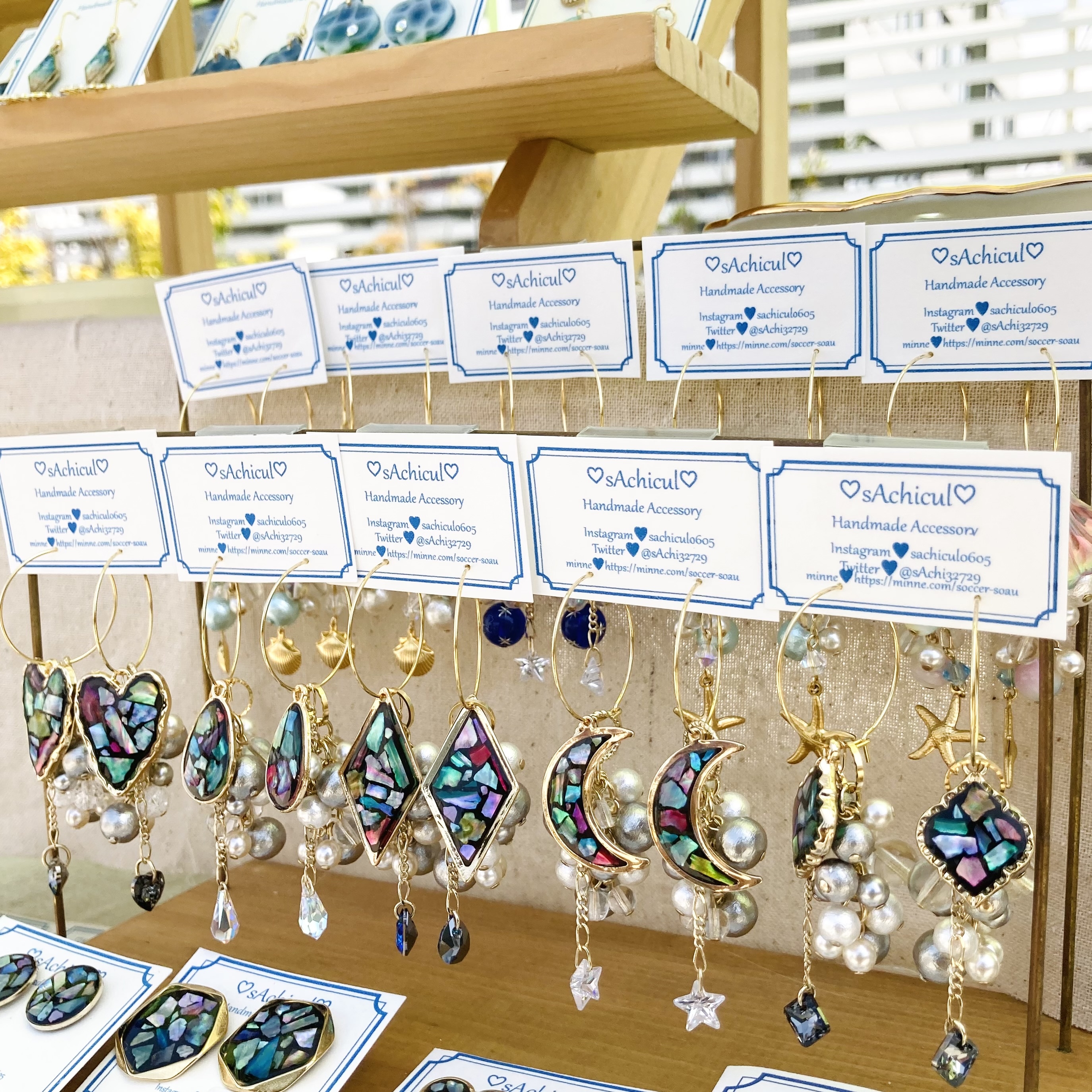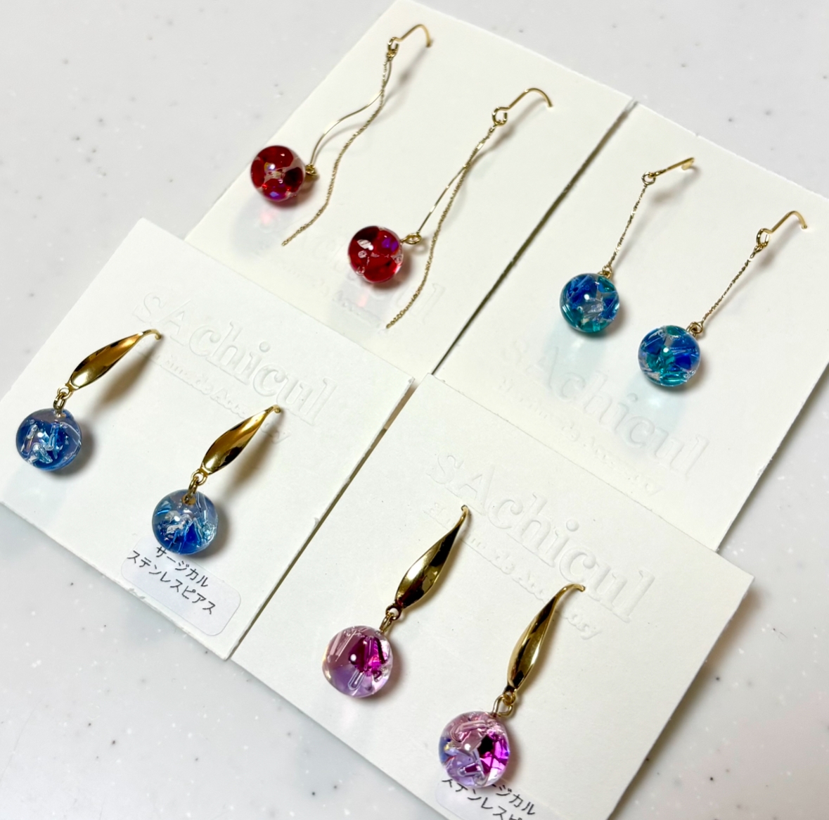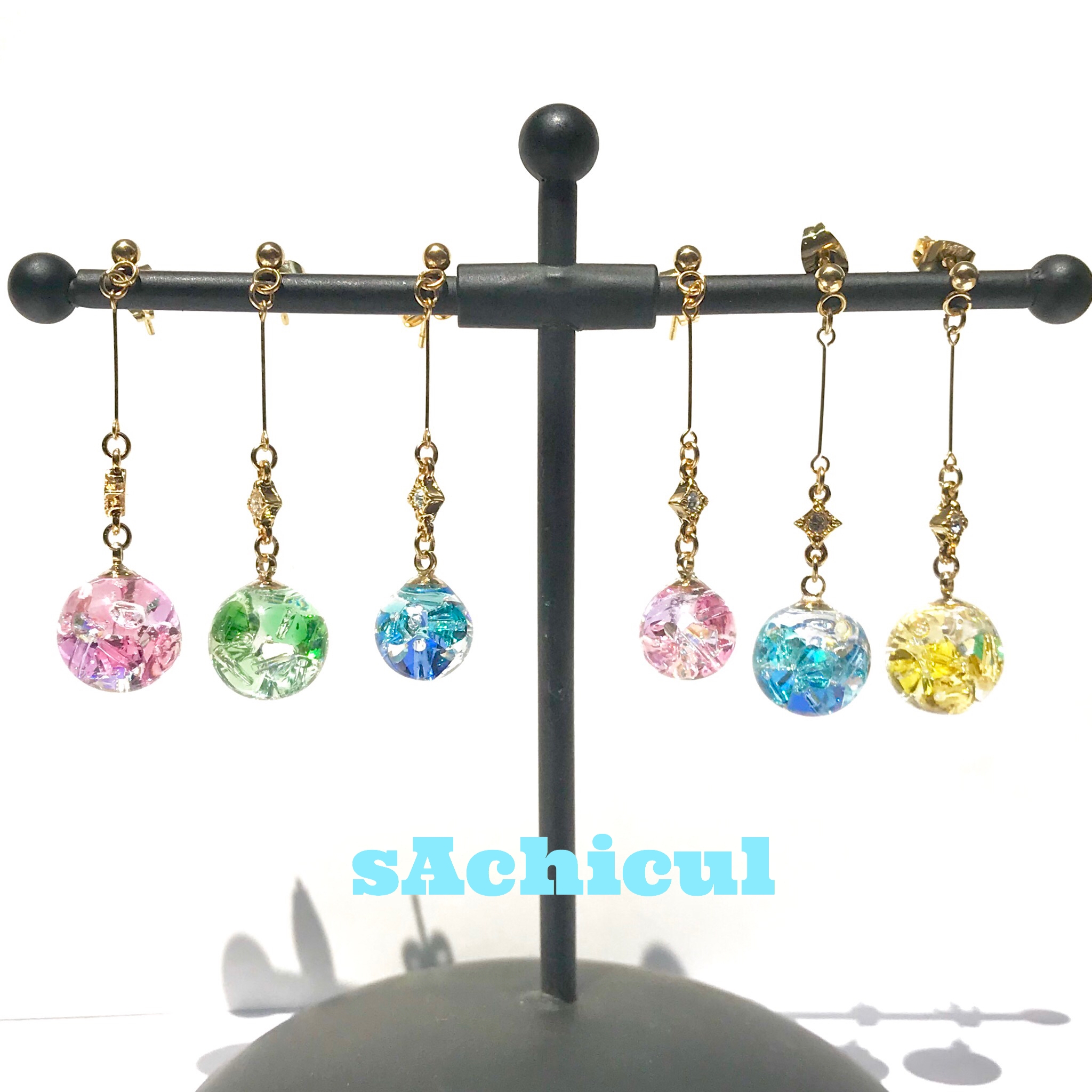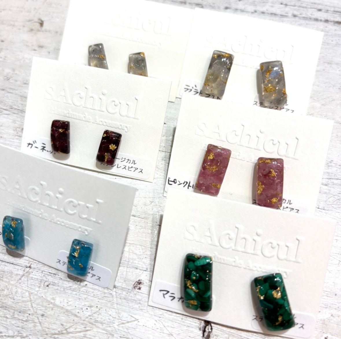 レジン、天然石、クリスタルなどを使ってシンプルで使いやすいアクセサリーを作っています。サージカルステンレスなどを使い、アレルギー対応もできます。