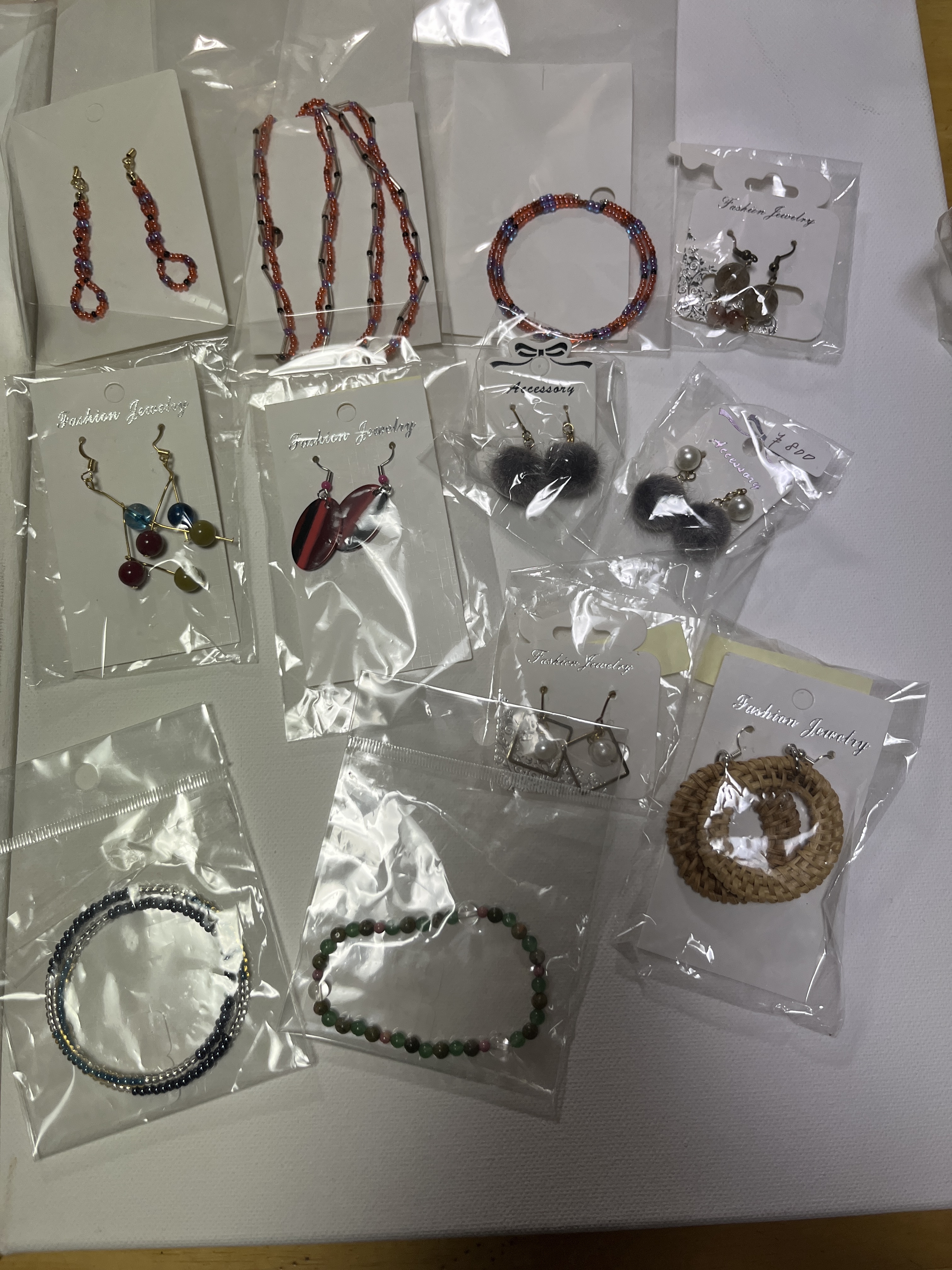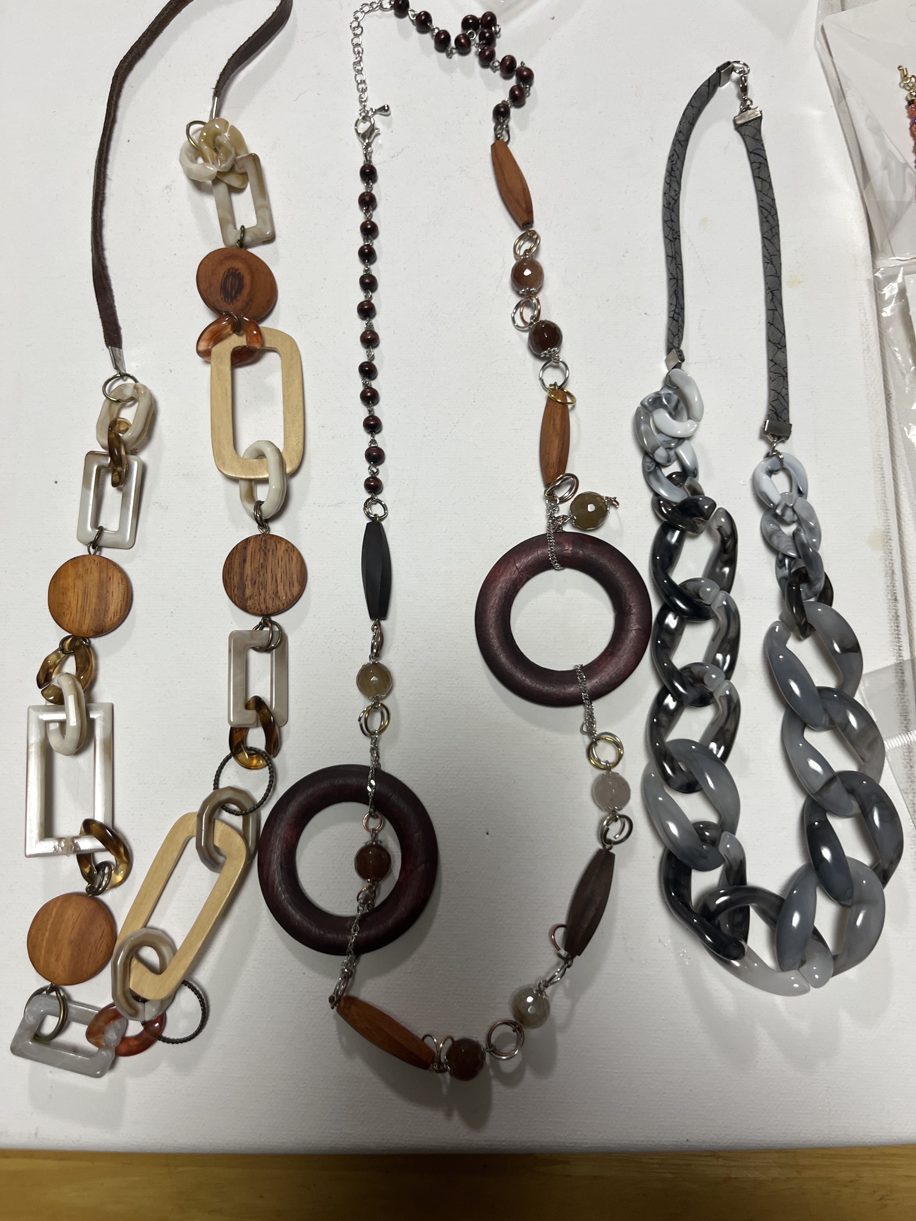 布バック、ポーチ、ゴミ袋付きティシュケース アクリル、天然石アクセサリー ピアス、ネックレス、メガネチェーン、ブレスレット