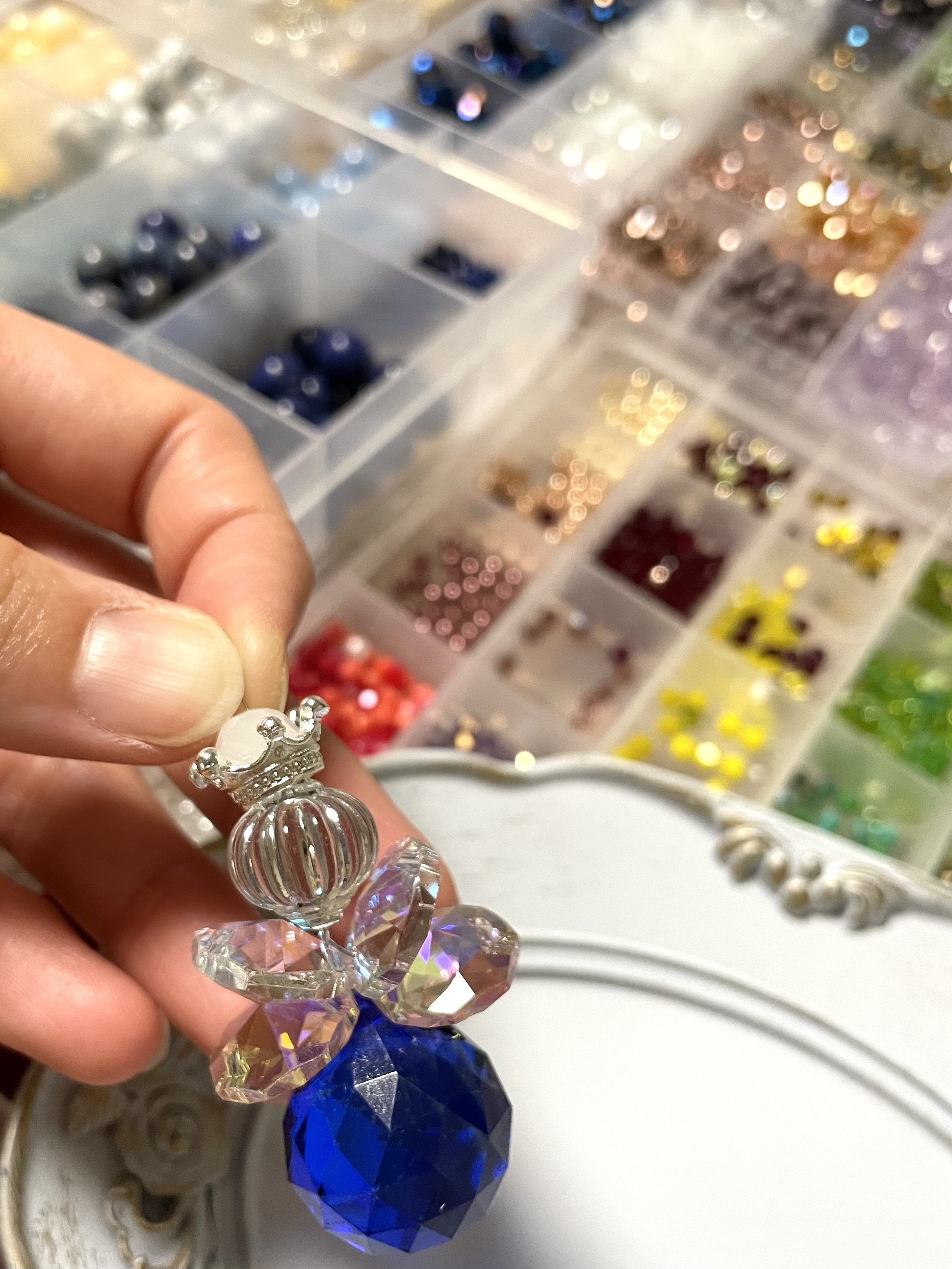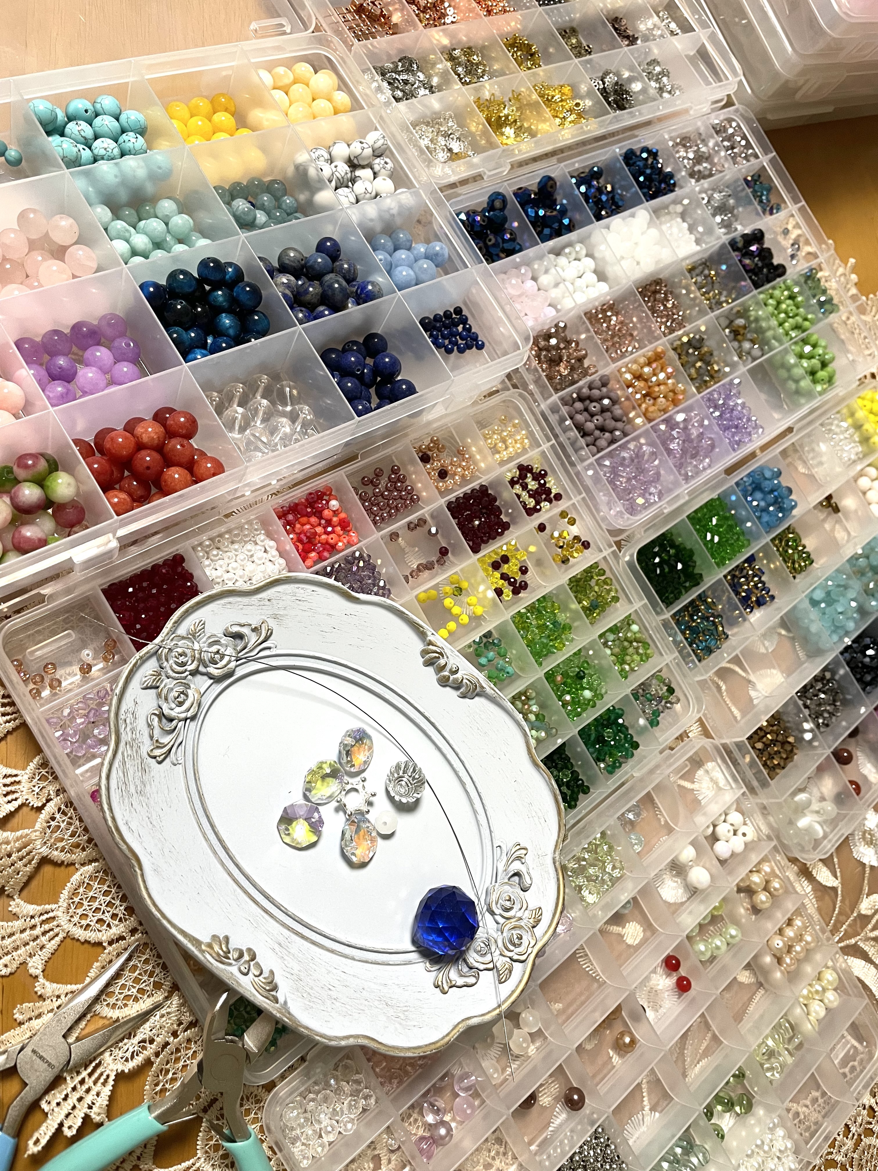 ①クリスタルとキットを選びます ②好きなキットを選びます ③指定の順にワイヤーに通します ④好きなビーズを選んでワイヤーに通します ⑤仕上げを確認させていただきます