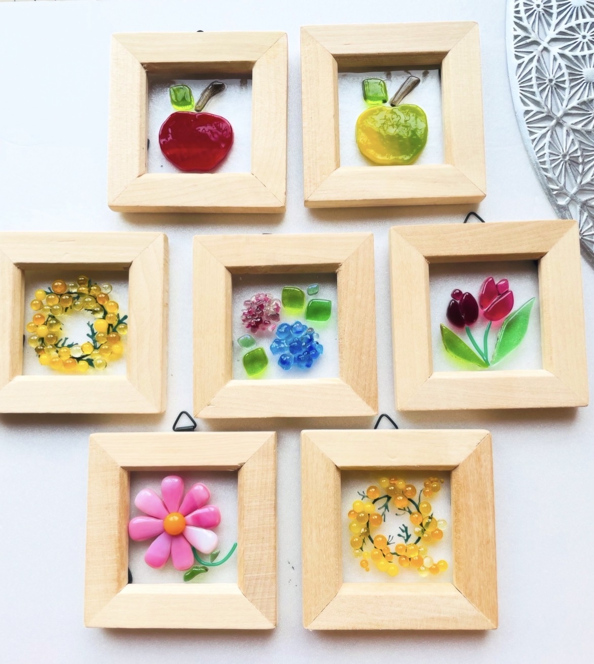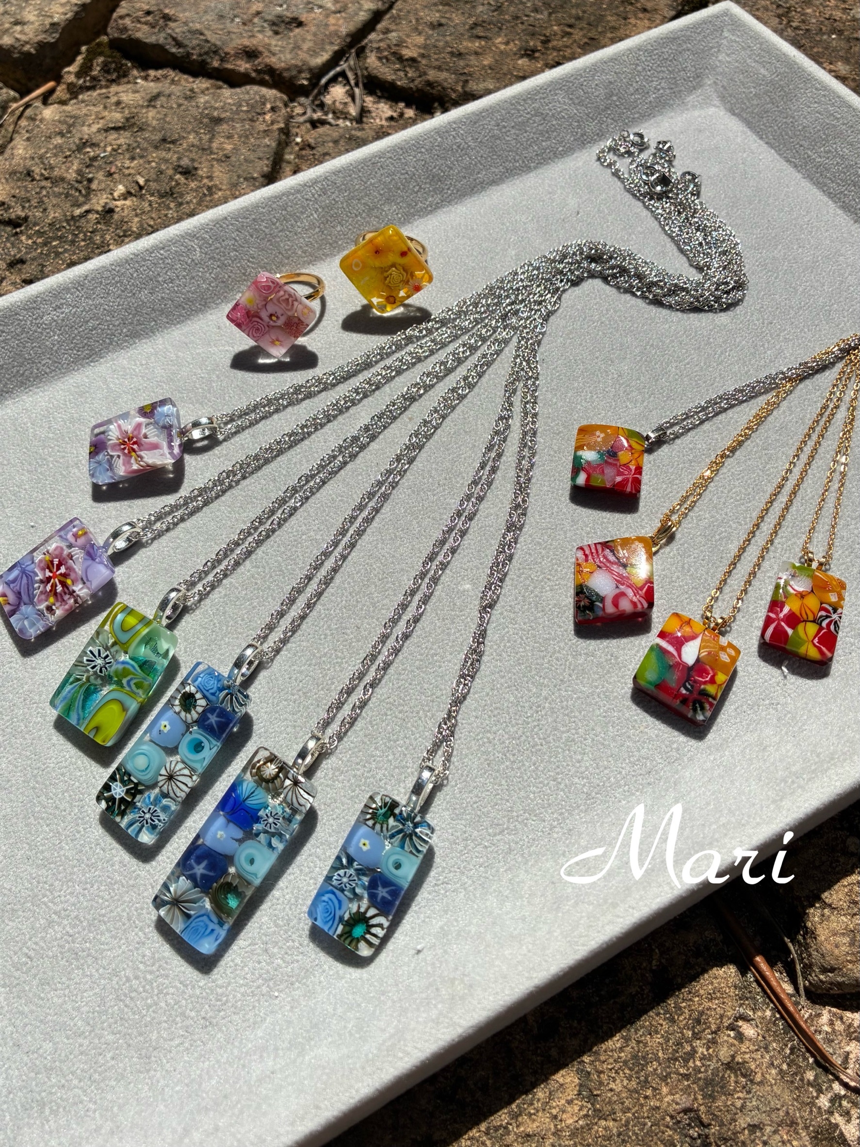 ガラスや陶片を使ってアクセサリーを作っています。ピアスやイヤリング、ネックレスやブローチ、指輪など。ガラス絵、箸置きなどの雑貨もあります。
