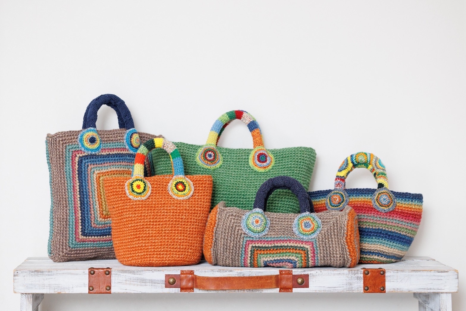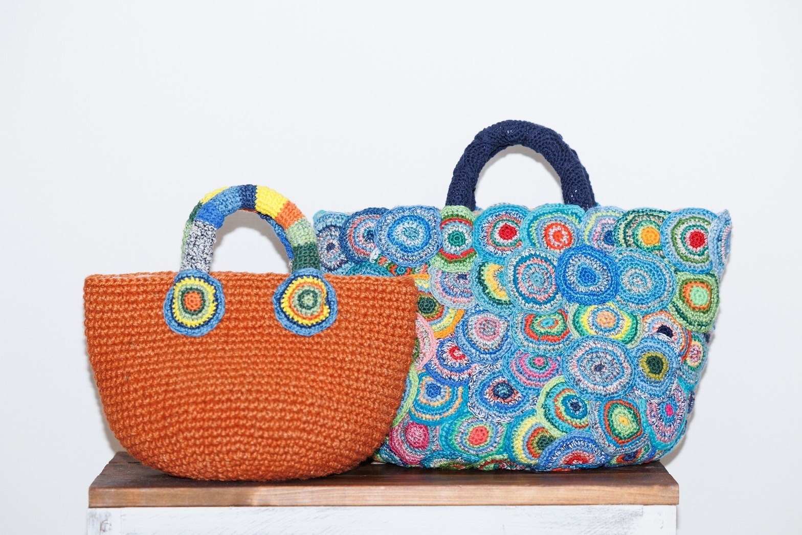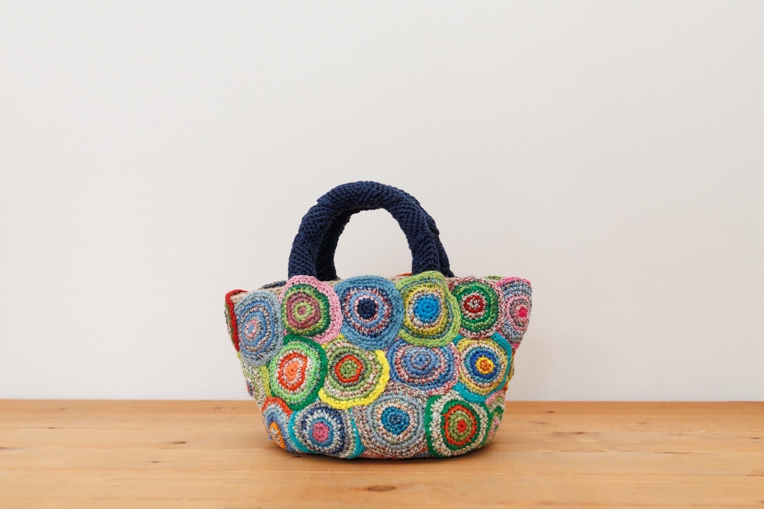 カラフルな麻糸で編んだ「ぐるぐるバッグ」です。色付きのバッグ本体は糸の段階で染めてから編んでいます。持ち手はいろいろな糸を使用し、世界に一つだけのバッグになっています。持って歩くとワクワクするバッグです。