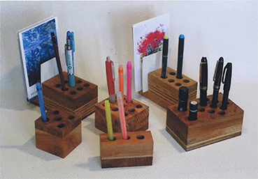 銘木などを使用し、花器(一輪挿し)、文具(ペンスタンド・ペンボックス・テープカッター・ペーパーナイフ)など、丁寧に作っています。