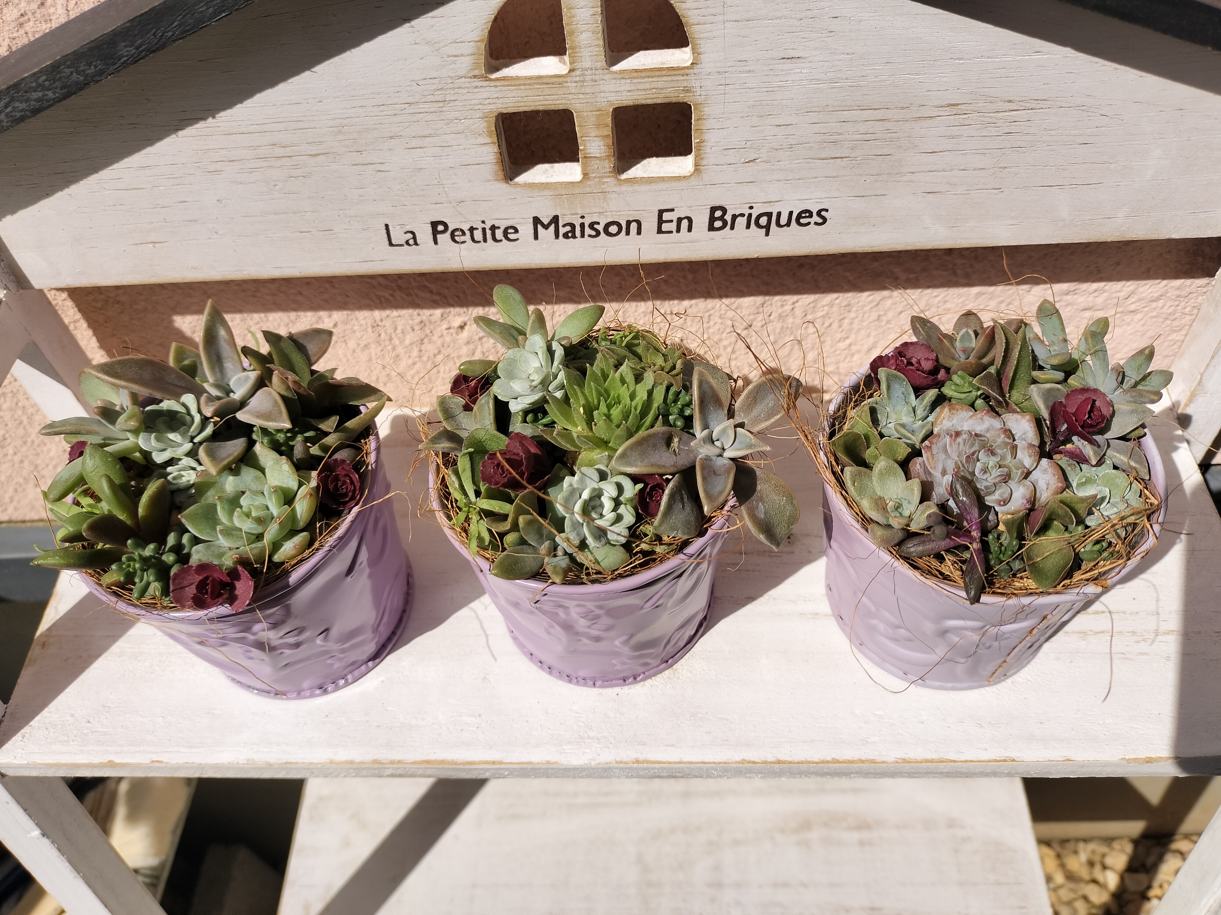 デコパージュやペイントしたリメ鉢と、初心者でも育てやすい多肉の寄せ植え 持つだけで気分が上がる彩りカゴバック(PPバンド)