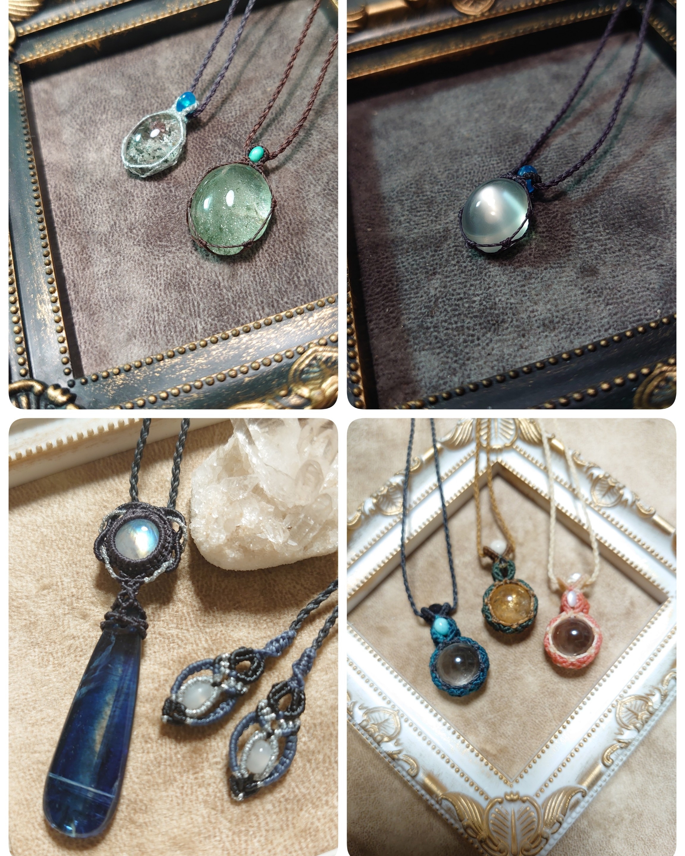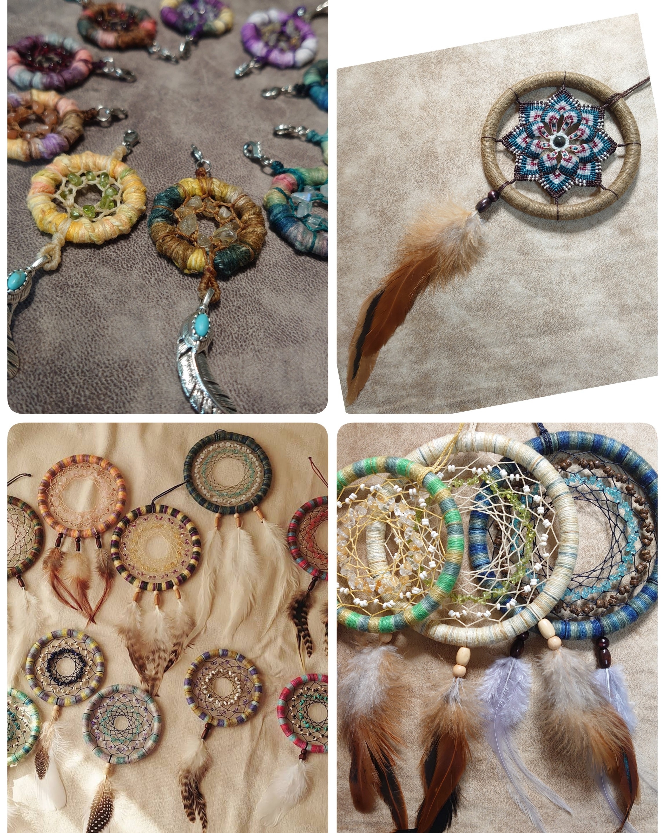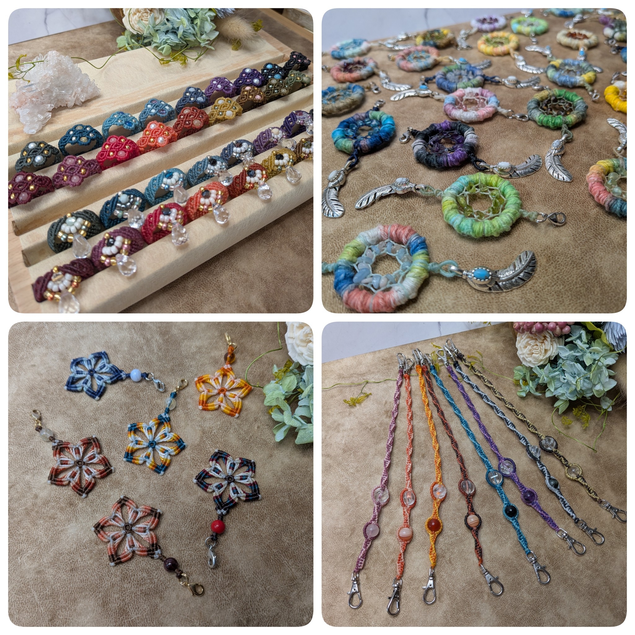 マクラメという手芸技法で天然石やガラスをアクセサリーに仕立てており、その殆どが一点ものです。 ネイティブアメリカンに伝わるドリームキャッチャーも全て手作りで製作しています。