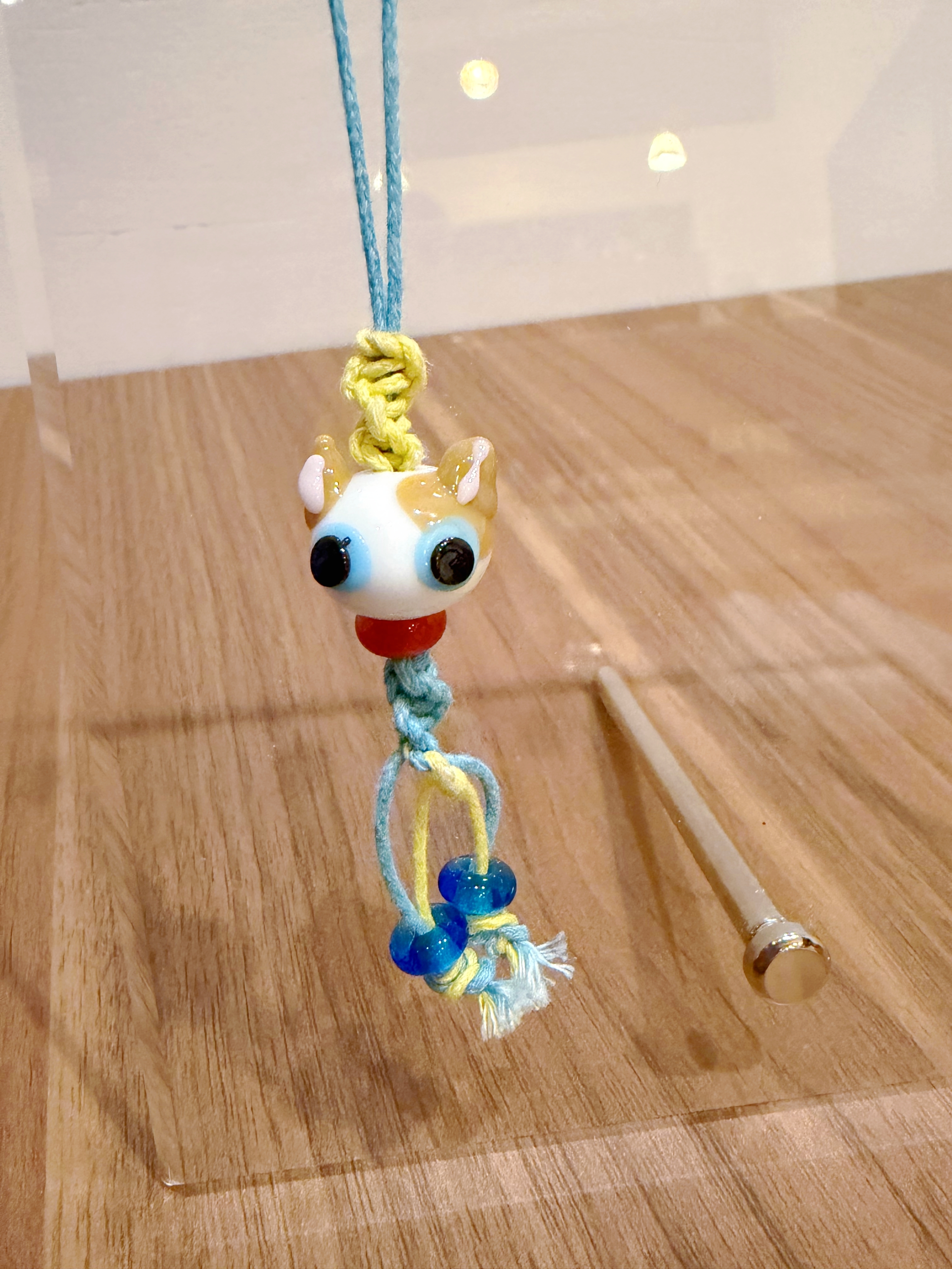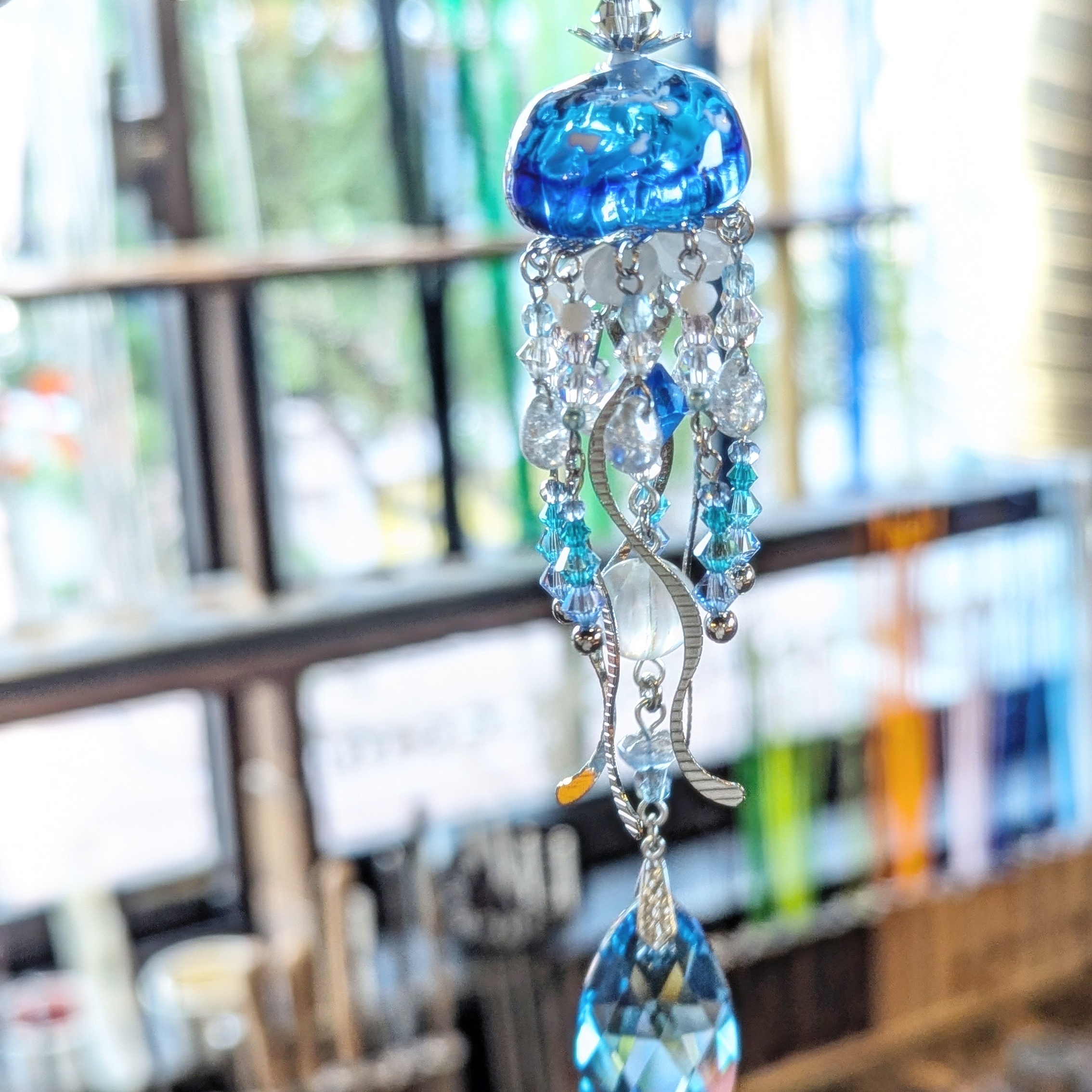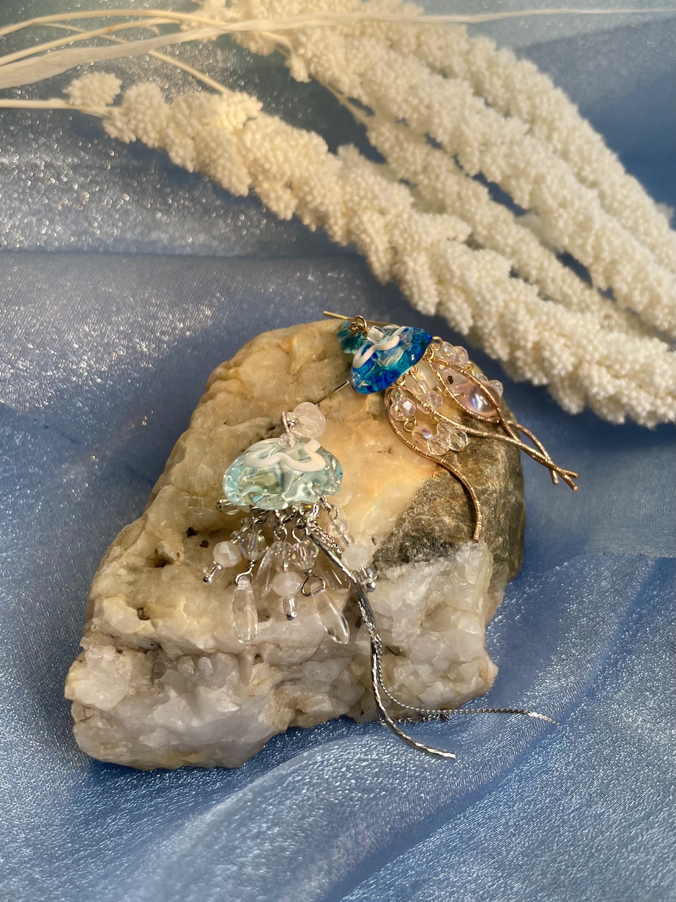 バーナーでガラスを溶かして作る一点物のアクセサリーやサンキャッチャー、ストラップを販売します。くらげモチーフや水面のゆらめきのネックレスなどガラスらしい涼し気なものから、猫やハートなど可愛らしいモチーフまで幅広くご用意しています。イヤリング、ピアスはその場で交換可能です。是非あなたのお気に入りを見つけに来てください!