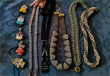 デリカビーズを使い、織機で織り上げたネックレスやデリカと丸大のコラボネックレス。鳥や動物のステッチで作りました。特にうまはとてもかわいいと思いながら作ることができました。